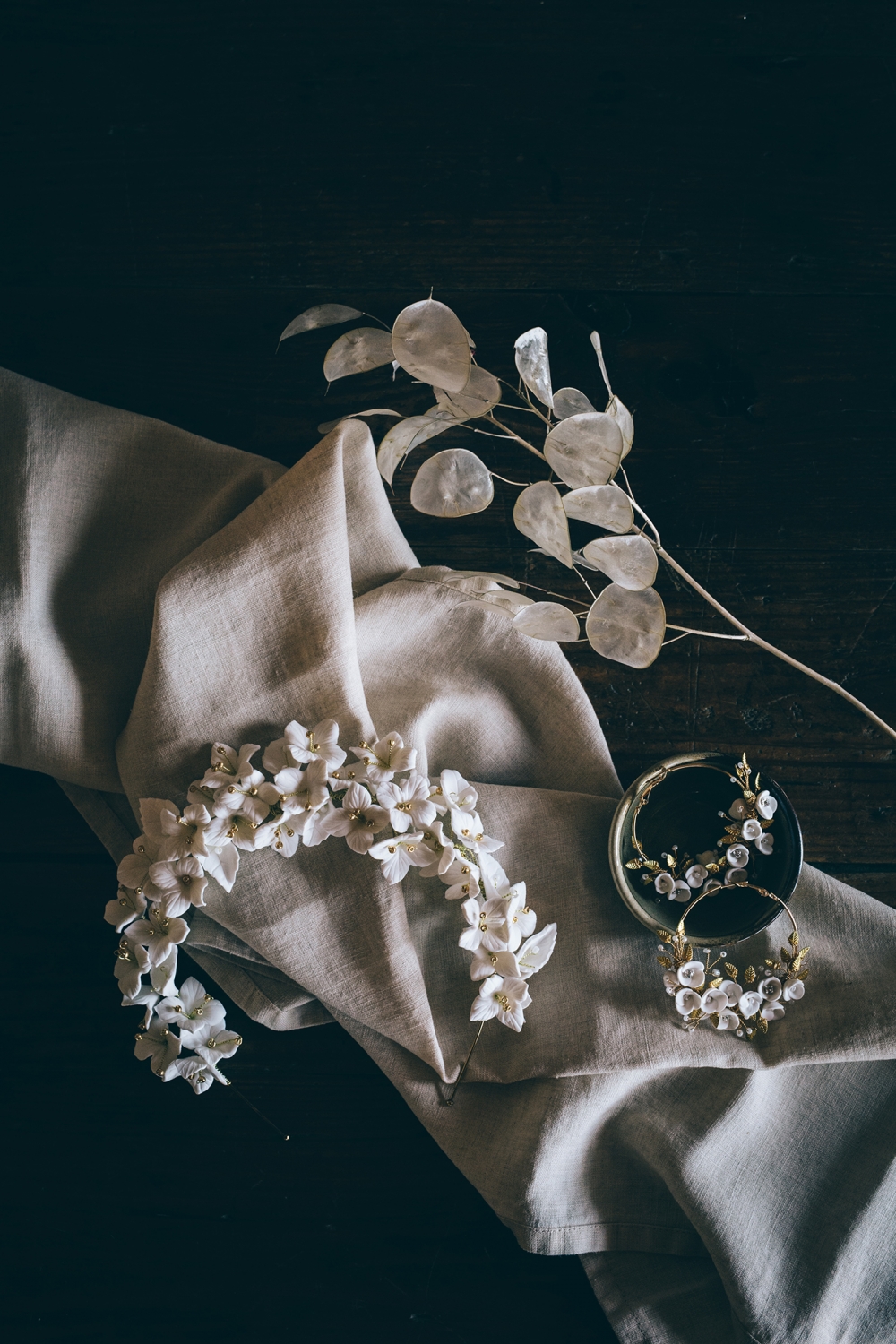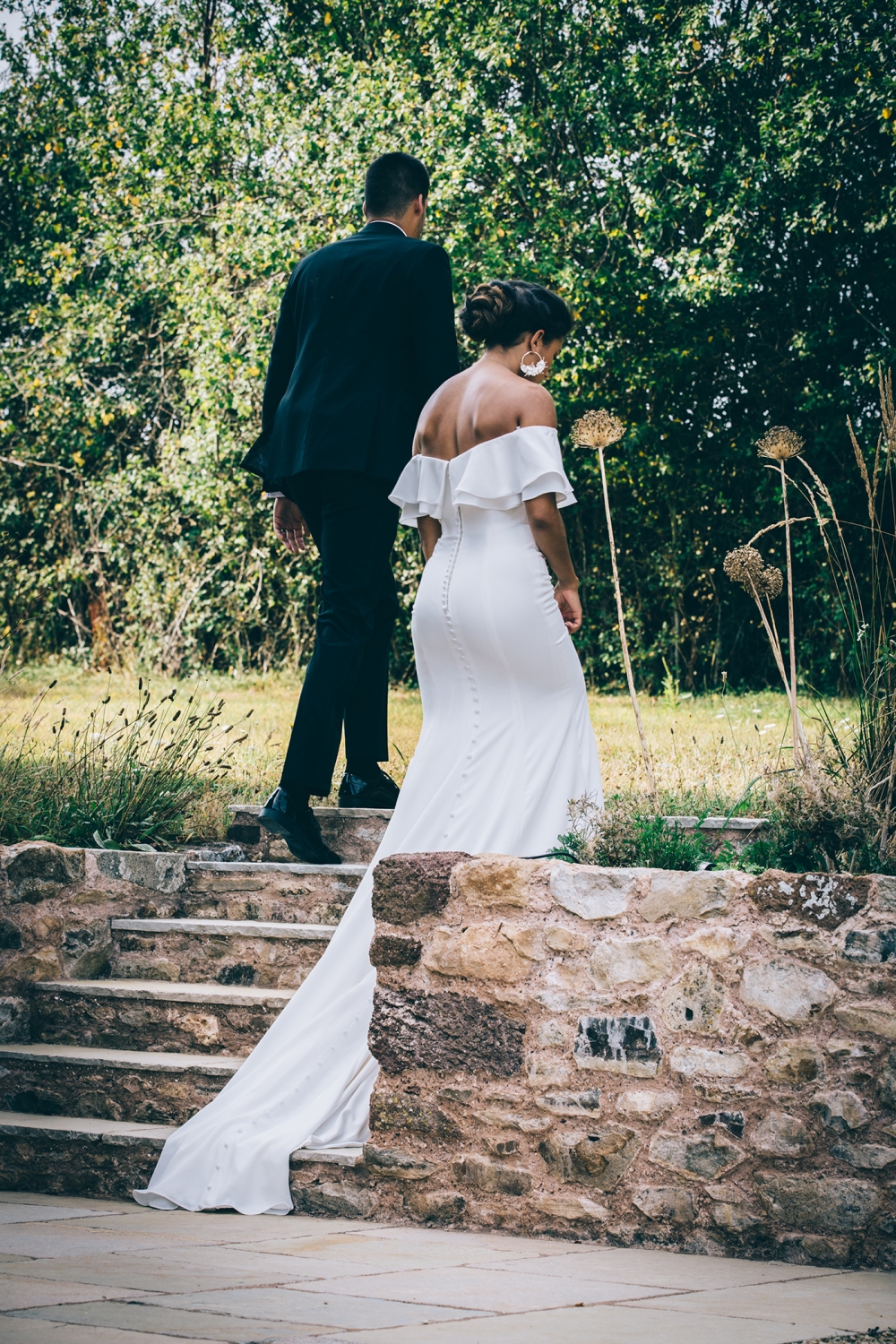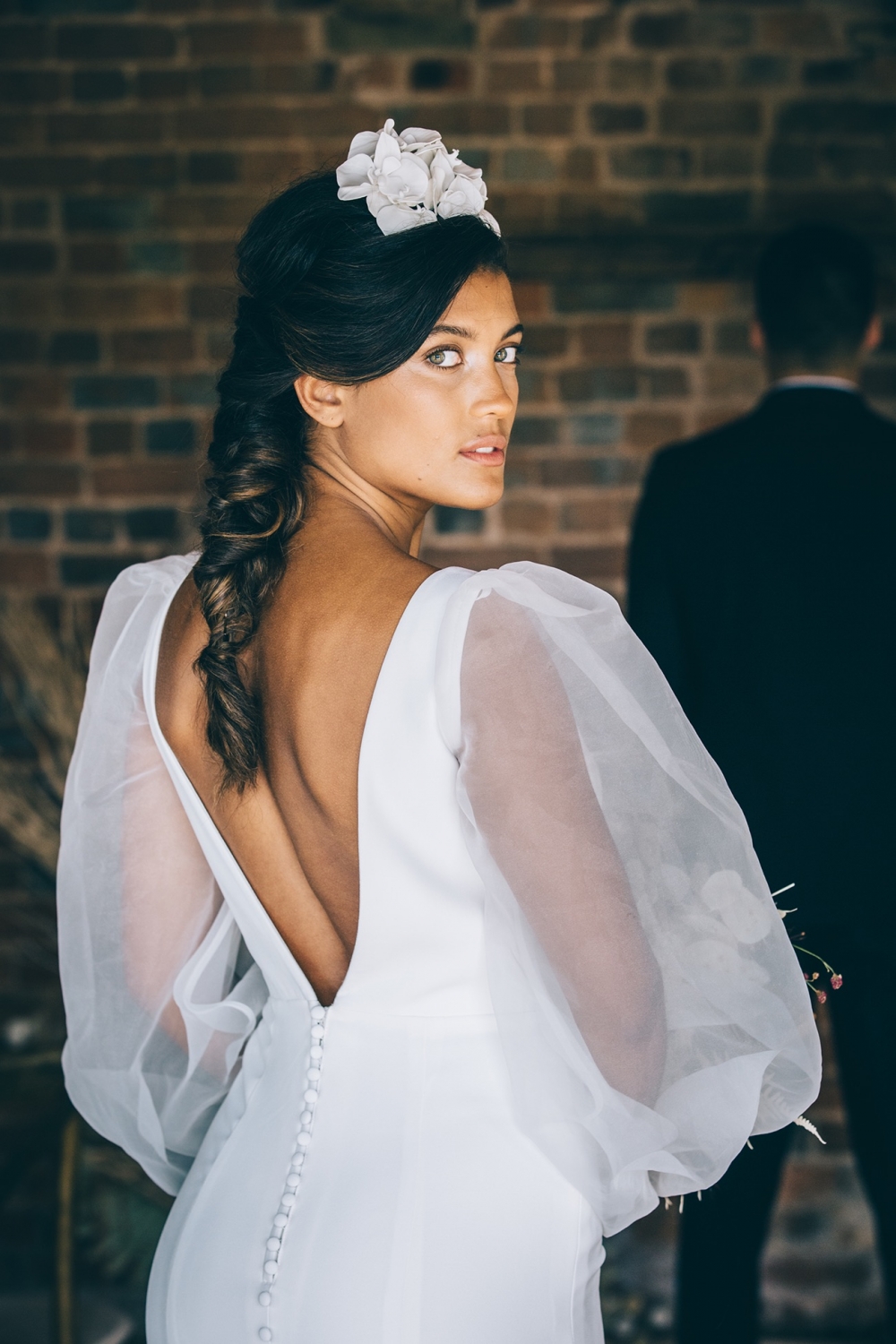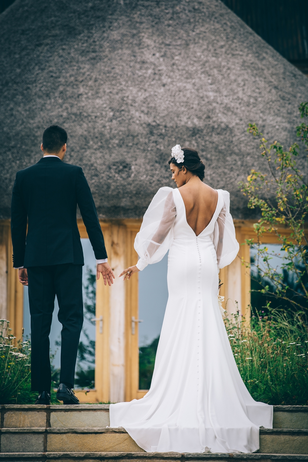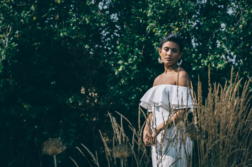 And here, clean lines and bold shapes take centre stage. The sleek silhouettes of the bridal gowns are teamed with dazzling details, from statement sleeves to intricate back detailing. Crafted in Devon, the accessories are just as head-turning: think headbands and earrings adorned with petals and so-cool fringing. Setting the mood, the groom's dinner suit adds timeless yet coolly contemporary glamour and sophistication.