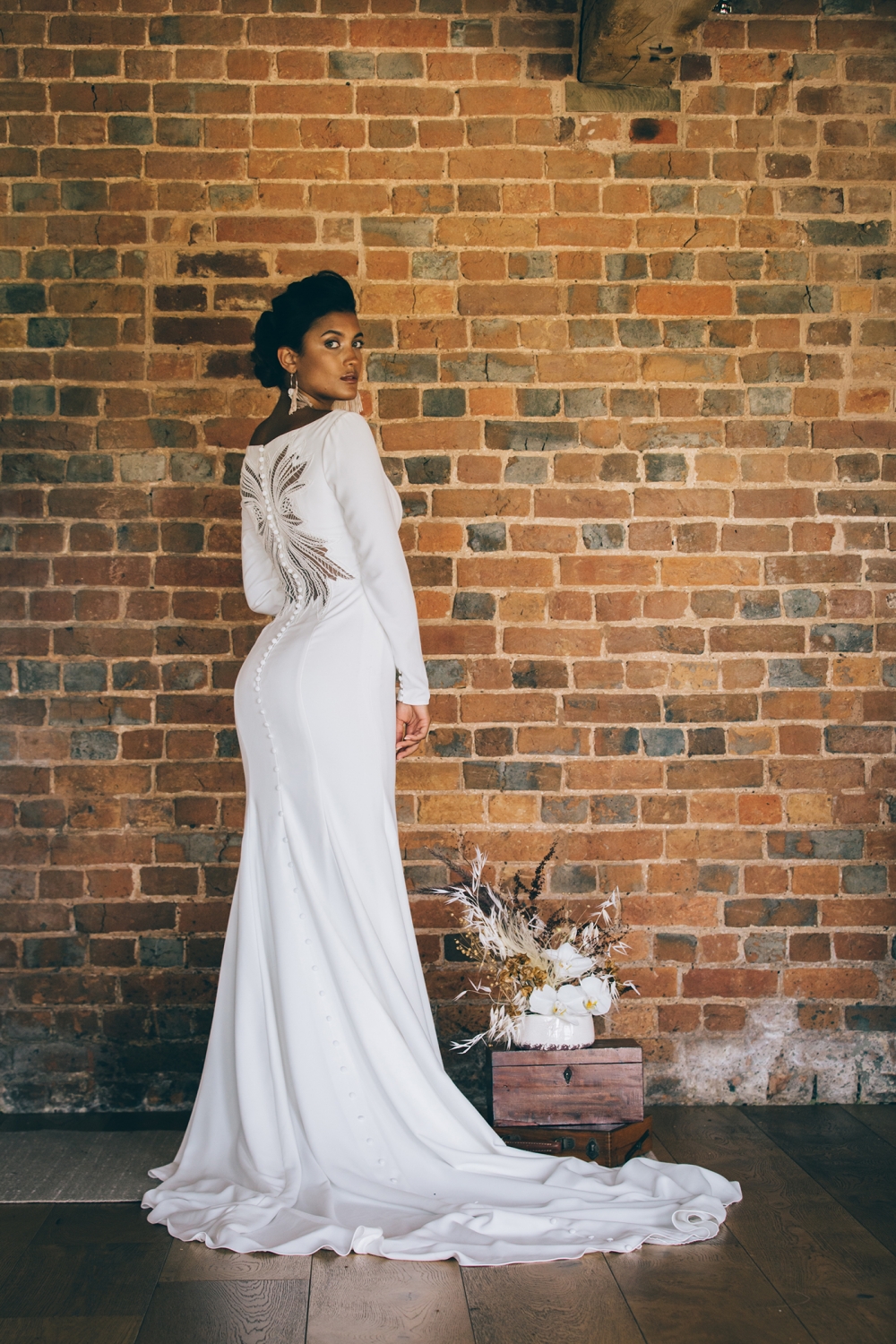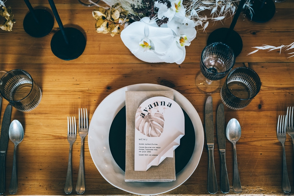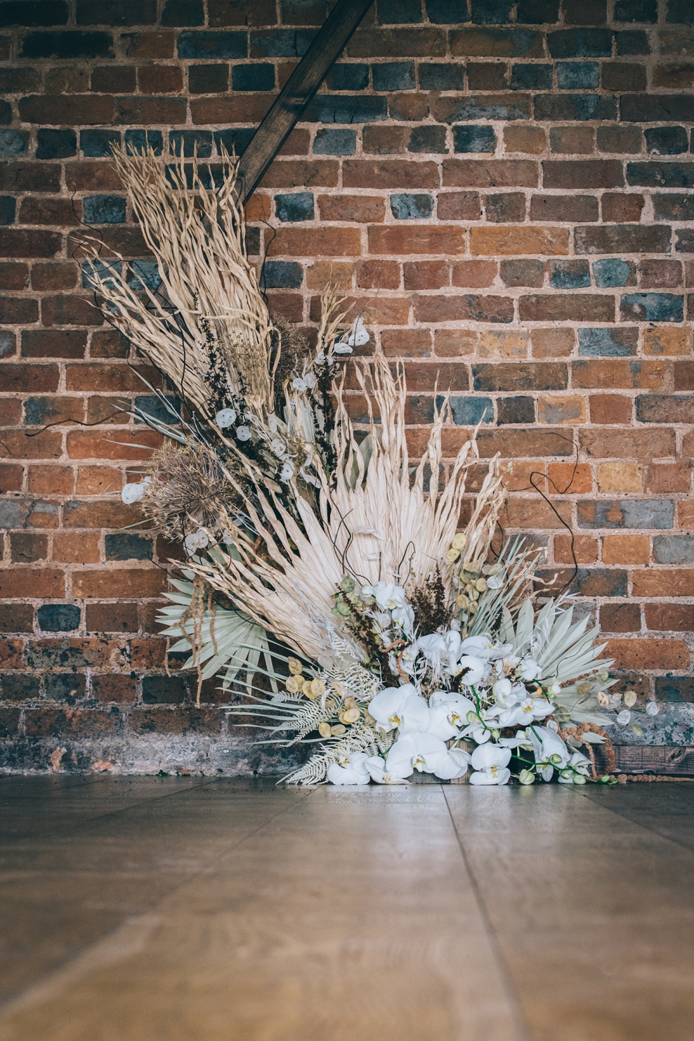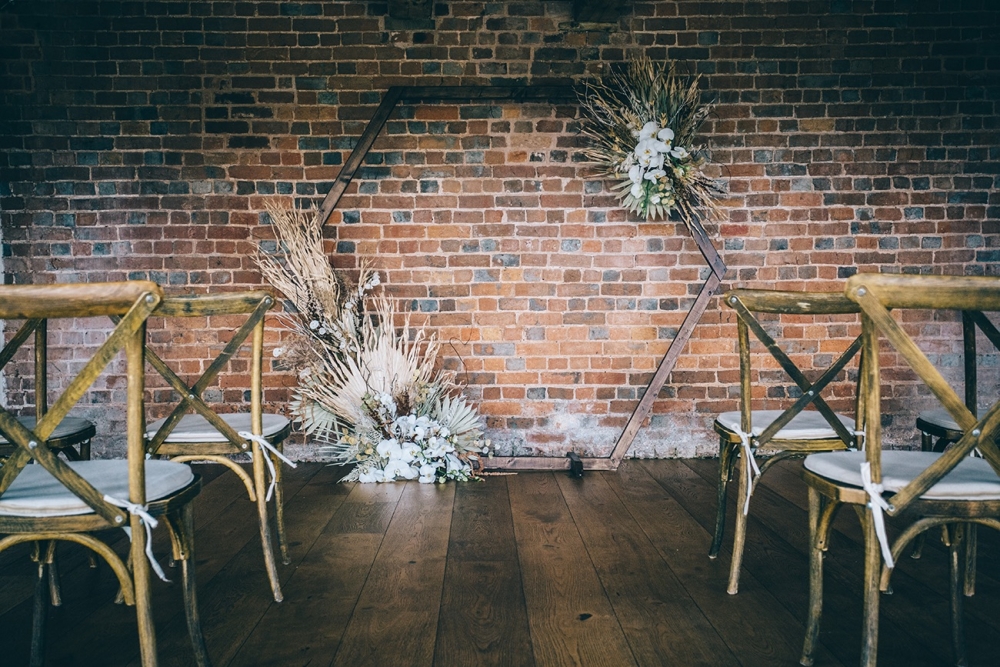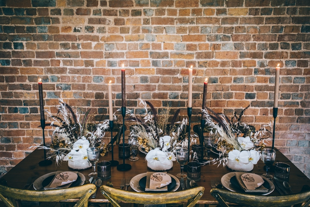 Boho accents are woven into this brilliantly creative take on black tie style. 'We wanted to give a more glamorous take on the boho style with orchids, luxury origami inspired stationery, intricate cake design and streamlined silhouettes paired with boho rattan and dried flowers,' explains Nikki. From the striking geometric ceremony backdrop, punctuated with orchids and dried palm leaves, to the tablescape which so effortlessly echoes the red brick walls of the venue, the effect is captivating.
