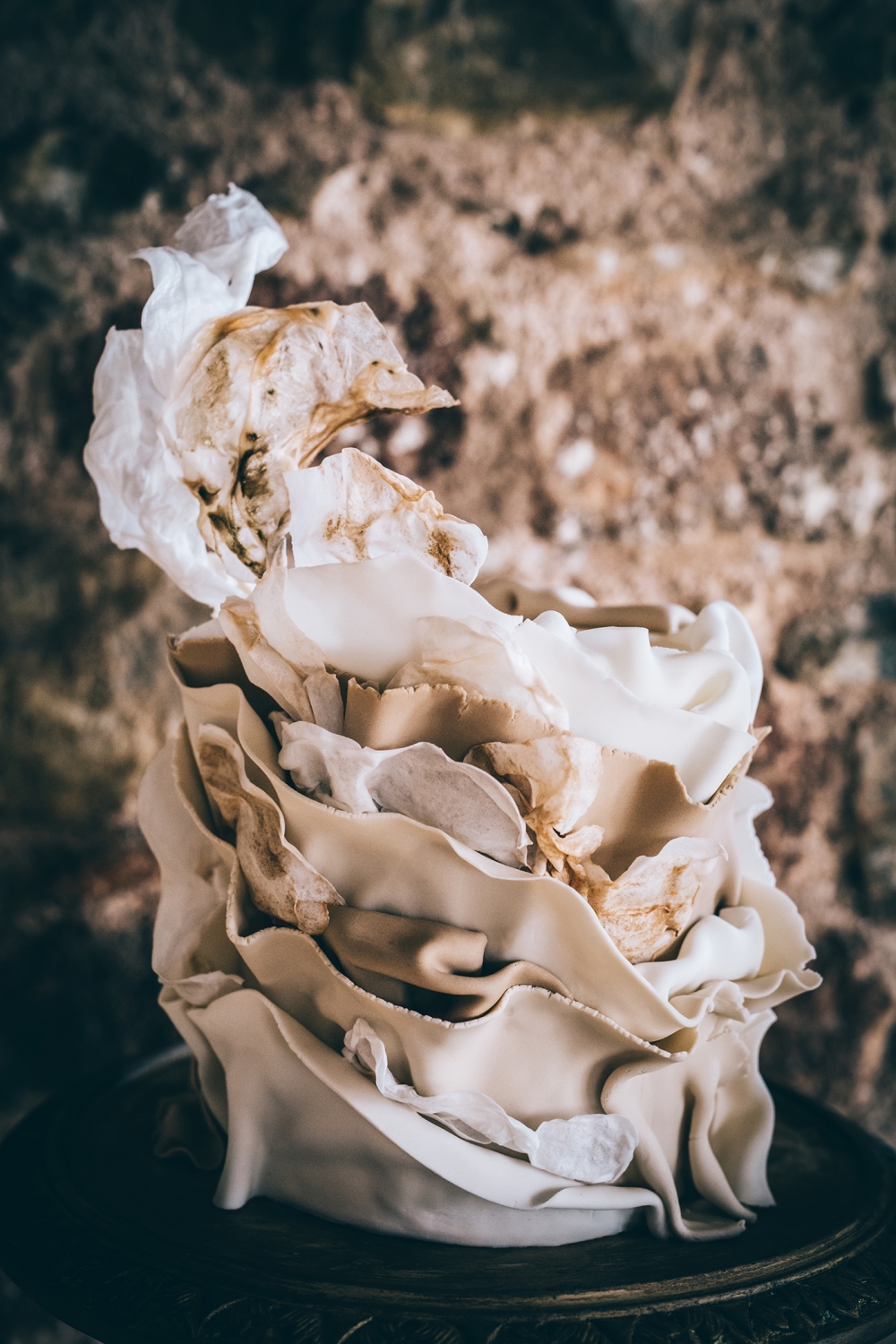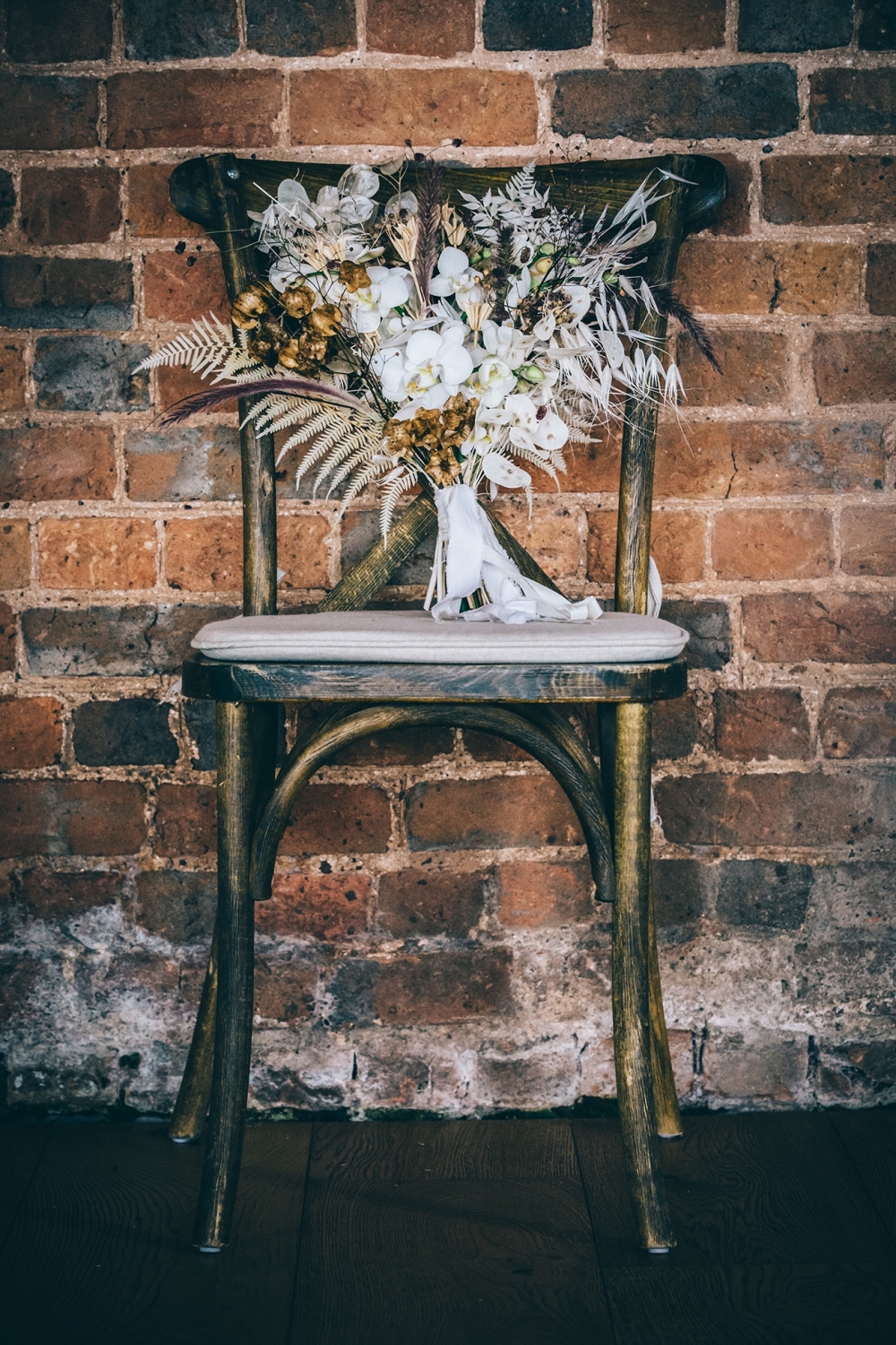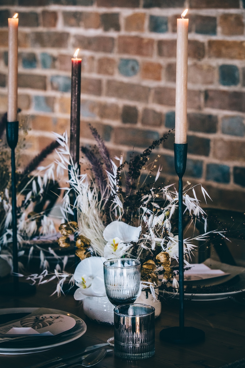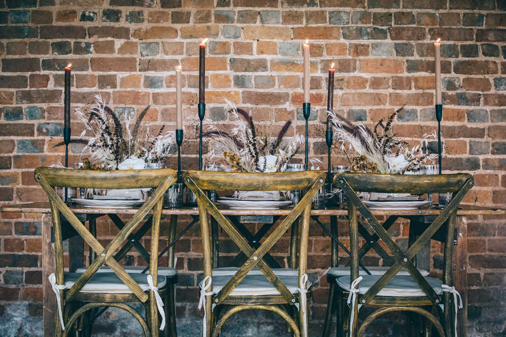 Boho accents are woven into this brilliantly creative take on black tie style. 'We wanted to give a more glamorous take on the boho style with orchids, luxury origami inspired stationery, intricate cake design and streamlined silhouettes paired with boho rattan and dried flowers,' explains Nikki. From the striking geometric ceremony backdrop, punctuated with orchids and dried palm leaves, to the tablescape which so effortlessly echoes the red brick walls of the venue, the effect is captivating.