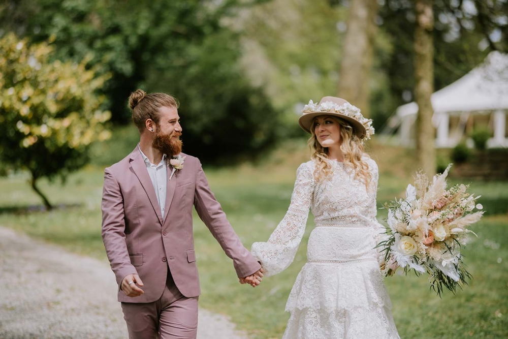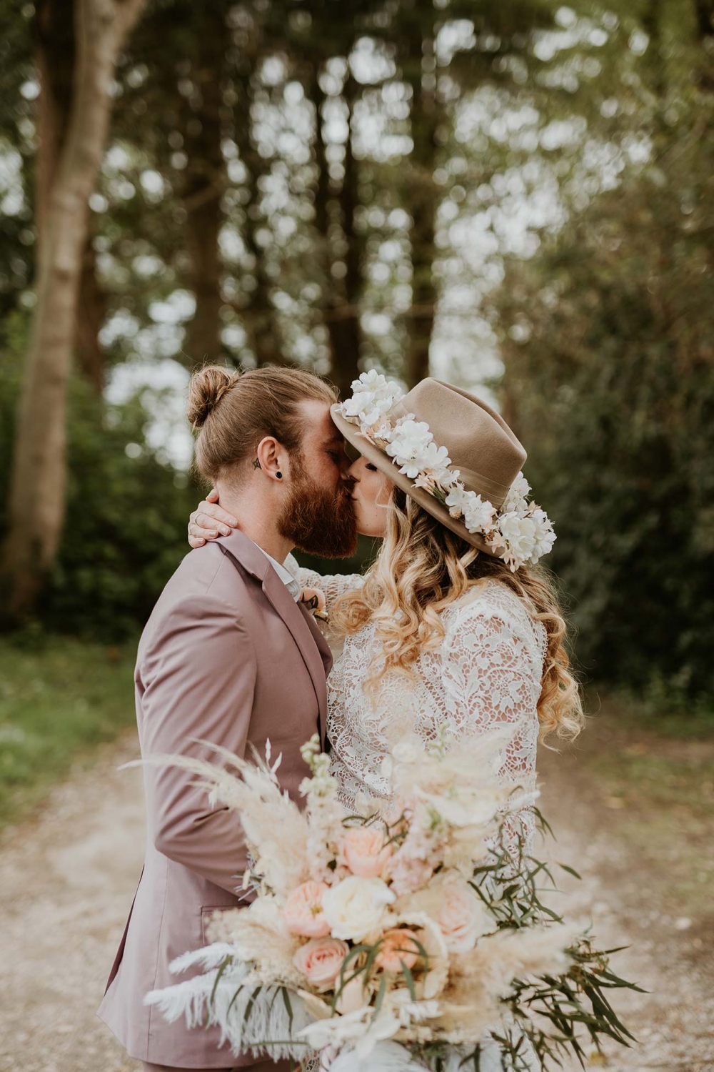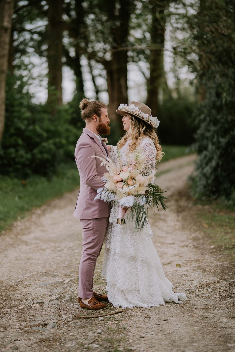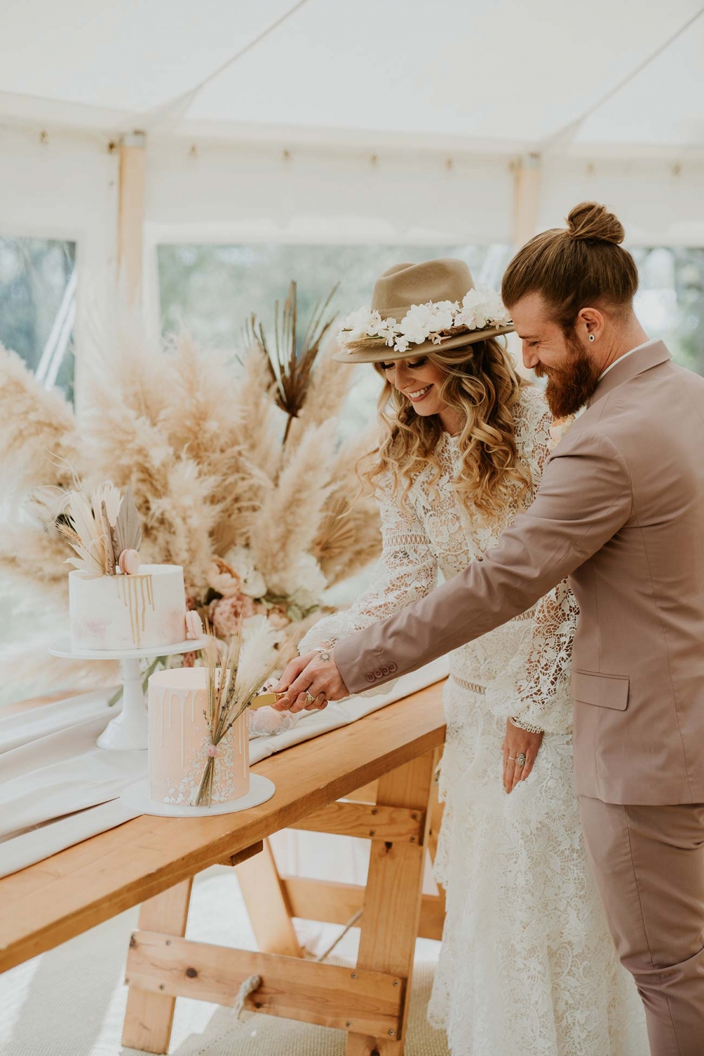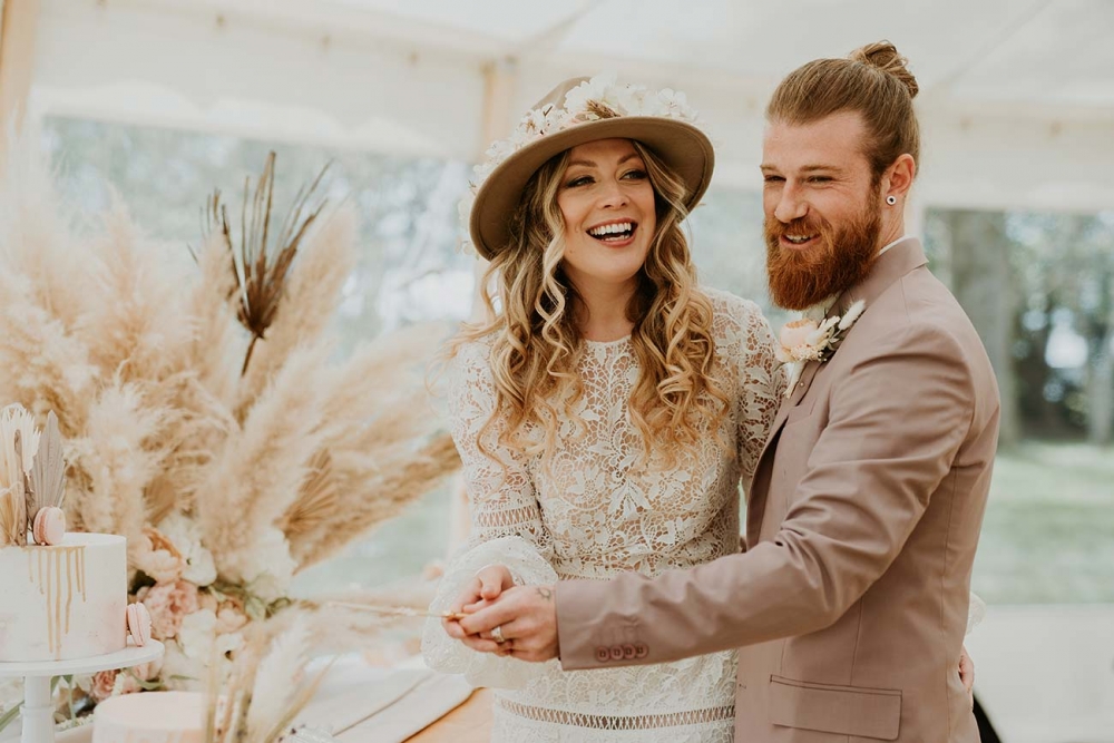 Every element is about romance, from the pretty pastels of the stationery to the guipure lace, tiered skirt, and balloon sleeves of the wedding dress. Accessorised with a floral-filled fedora sitting atop soft golden curls and a bouquet of cream and pink blooms, pampas, feathers, and shimmery lunaria, the look marries modern boho with a gorgeously ethereal edge.