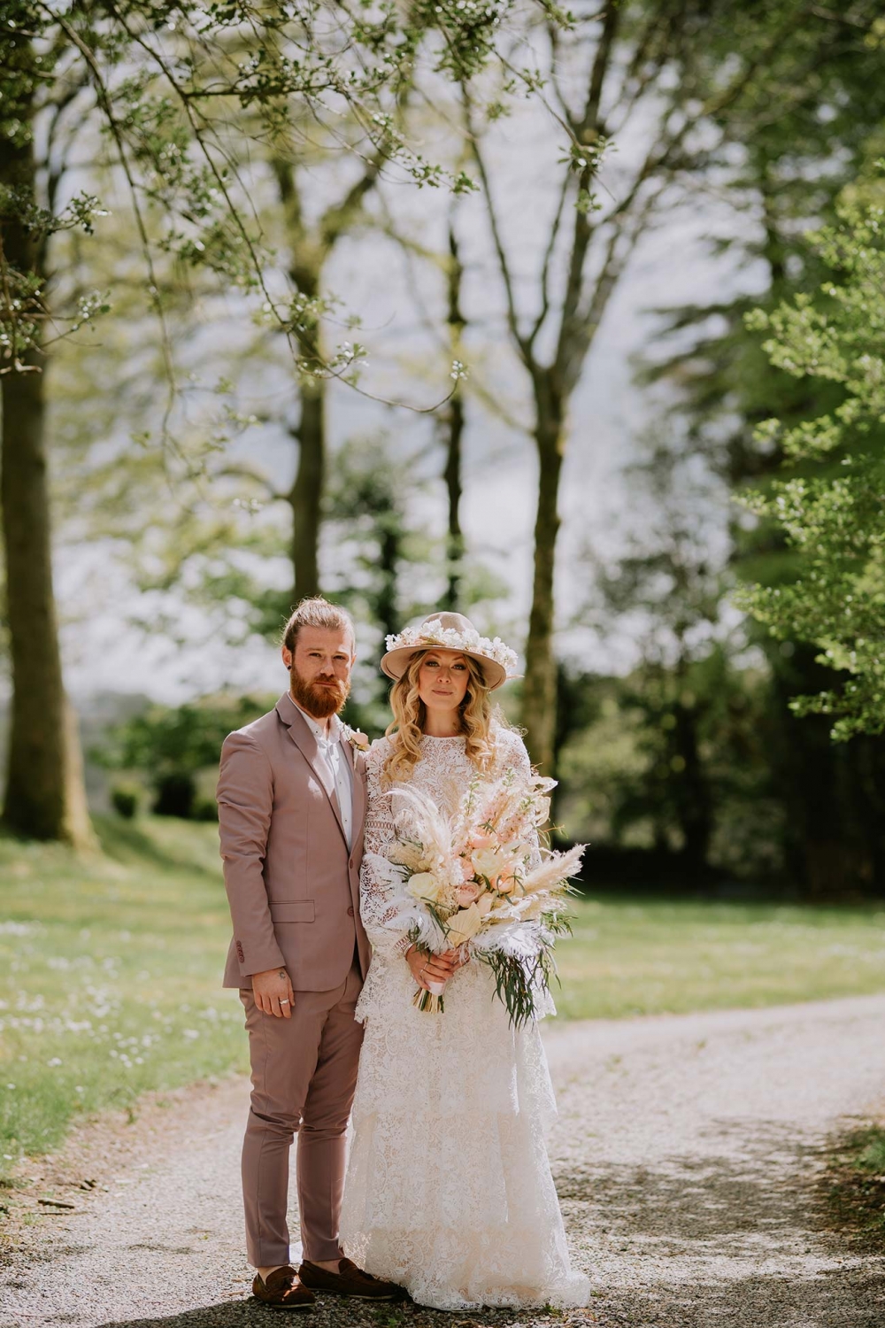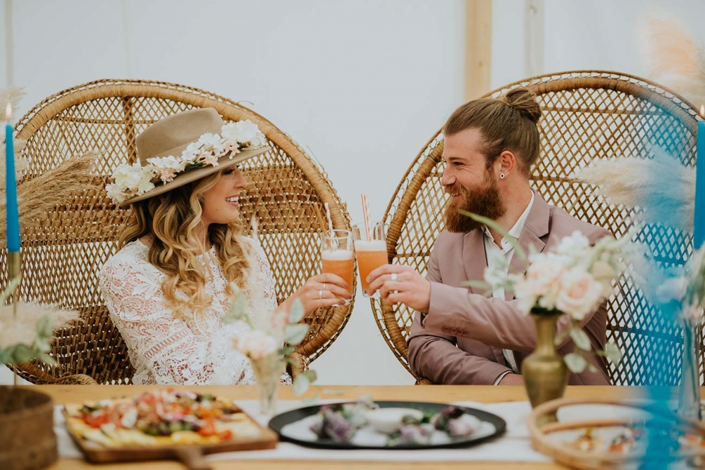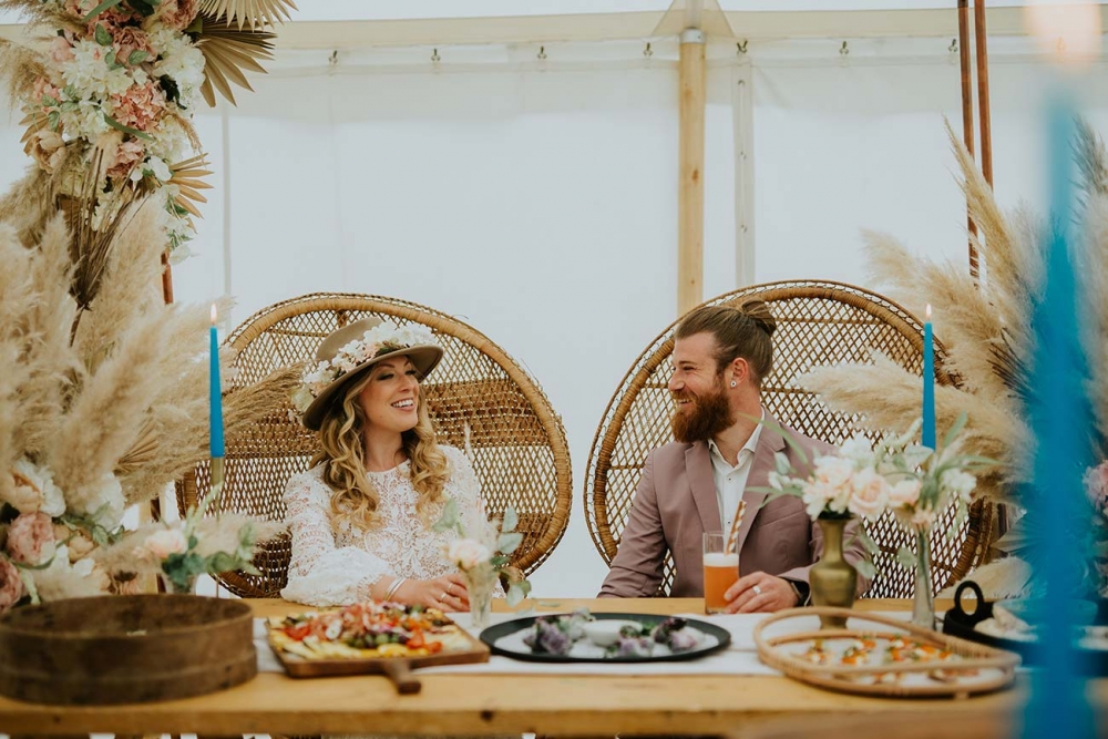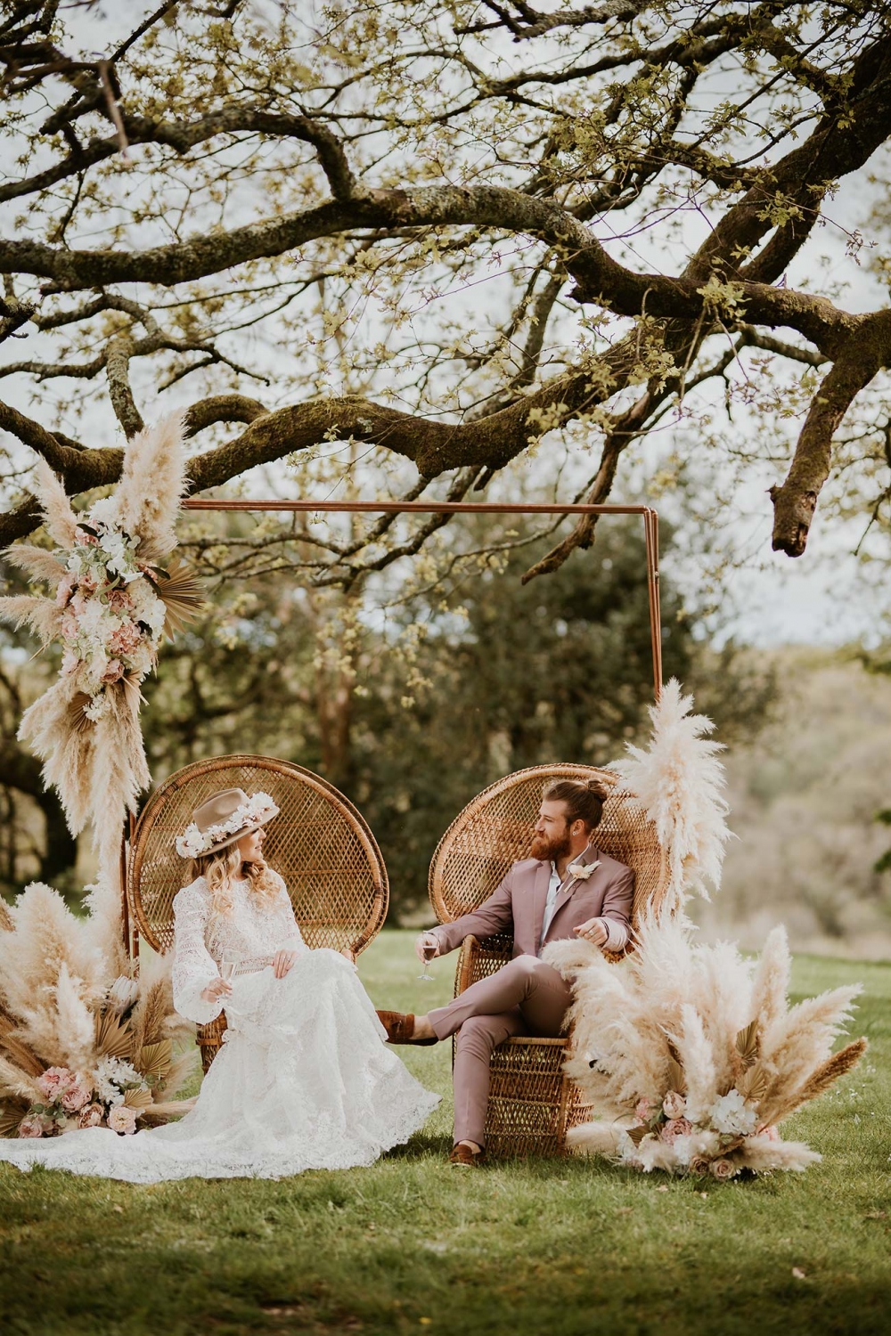 Every element is about romance, from the pretty pastels of the stationery to the guipure lace, tiered skirt, and balloon sleeves of the wedding dress. Accessorised with a floral-filled fedora sitting atop soft golden curls and a bouquet of cream and pink blooms, pampas, feathers, and shimmery lunaria, the look marries modern boho with a gorgeously ethereal edge.
