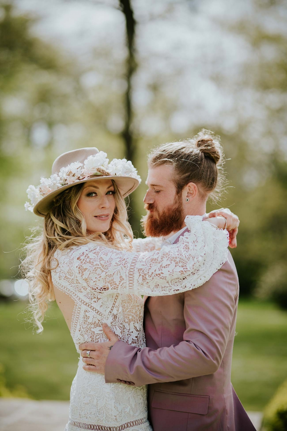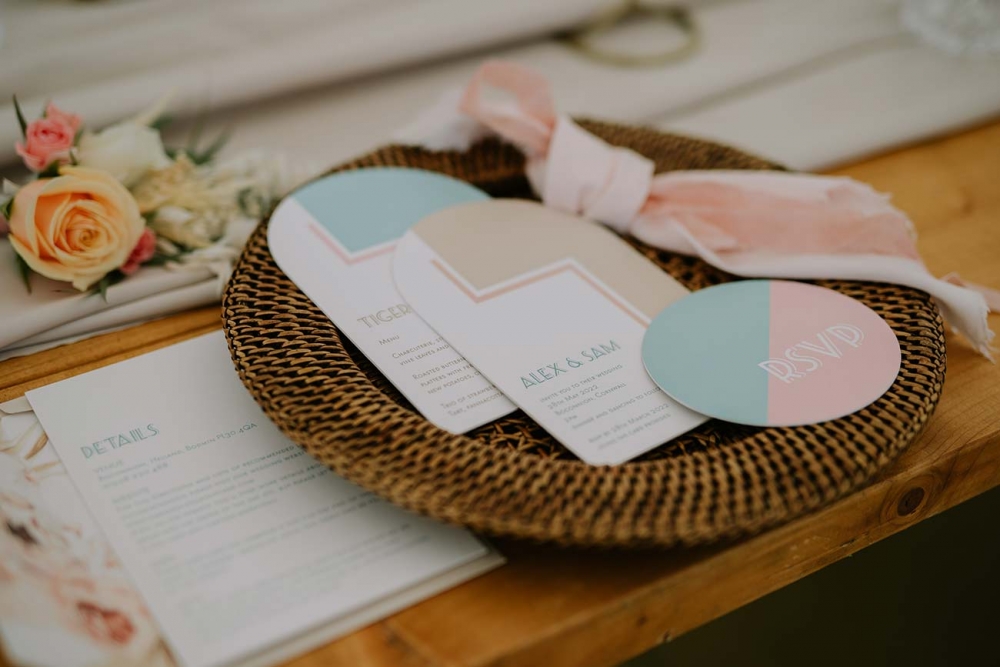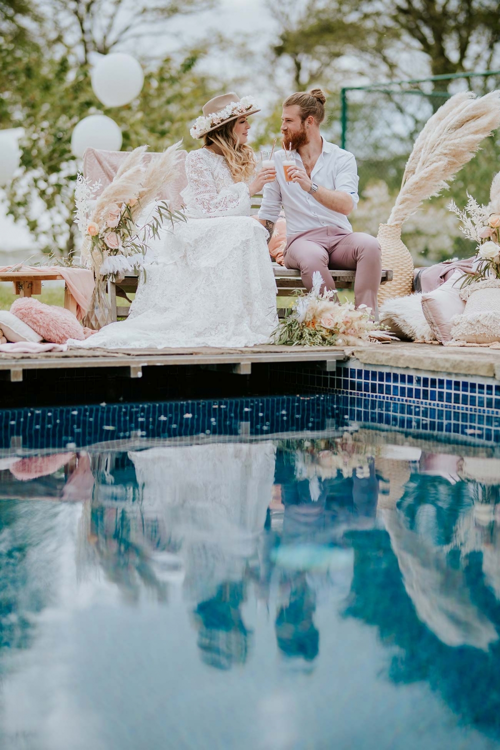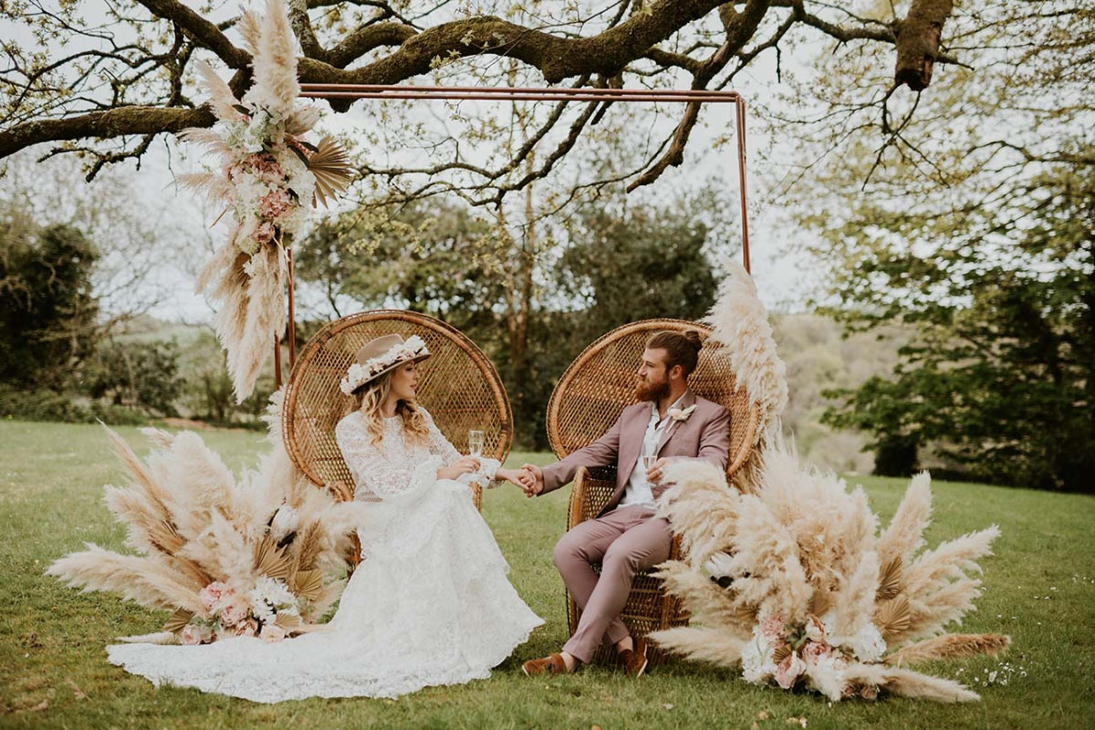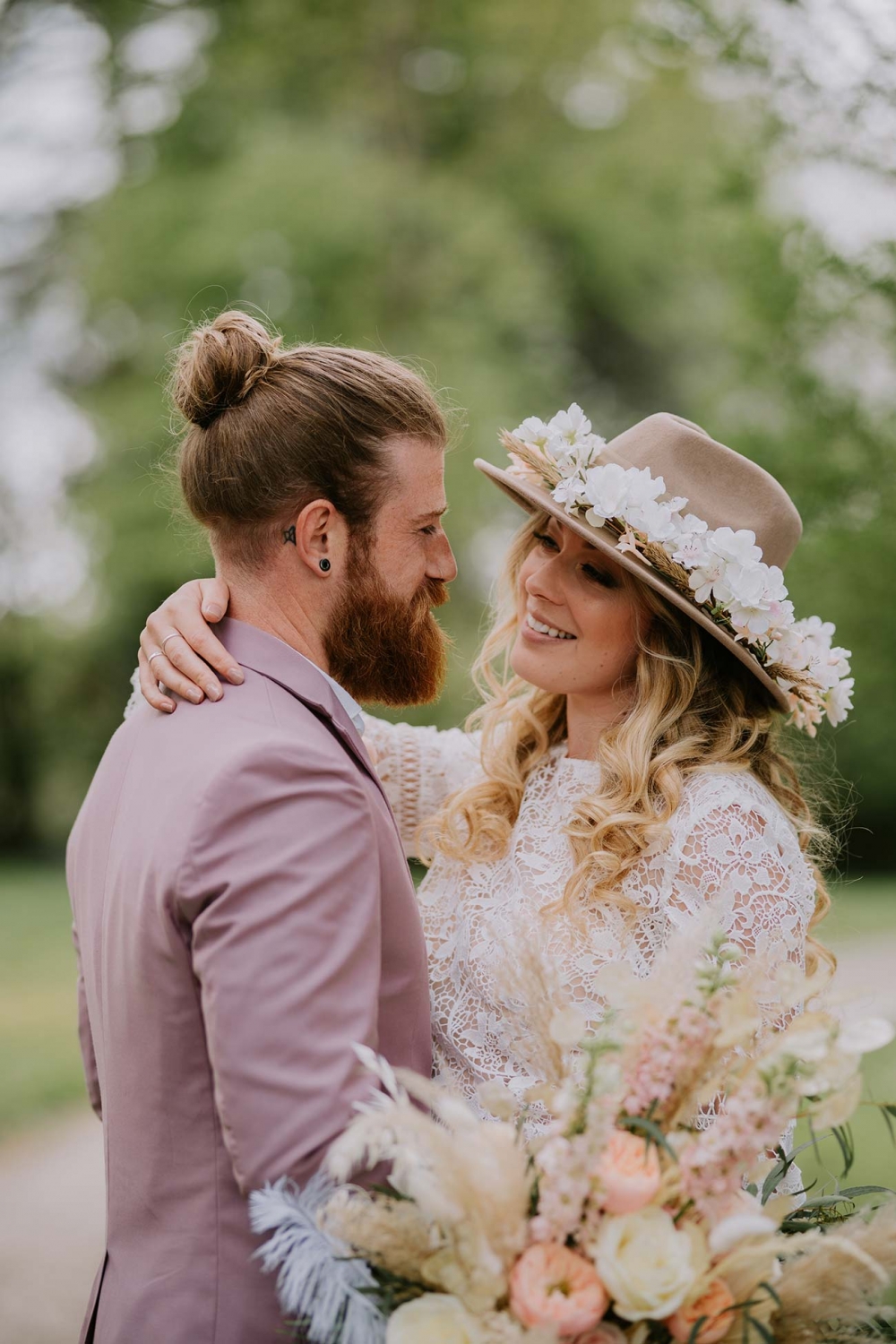 Every element is about romance, from the pretty pastels of the stationery to the guipure lace, tiered skirt, and balloon sleeves of the wedding dress. Accessorised with a floral-filled fedora sitting atop soft golden curls and a bouquet of cream and pink blooms, pampas, feathers, and shimmery lunaria, the look marries modern boho with a gorgeously ethereal edge.