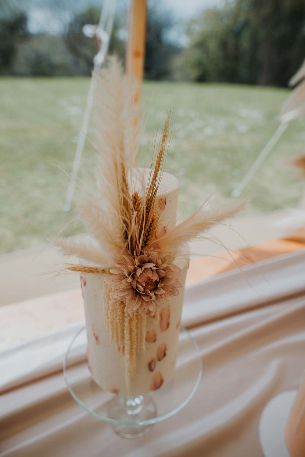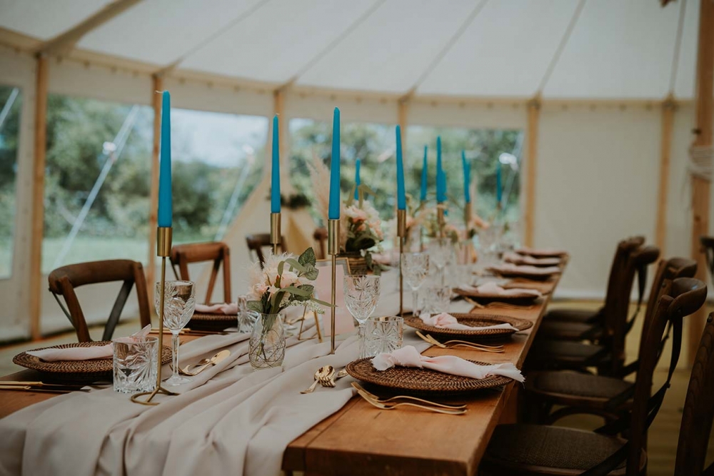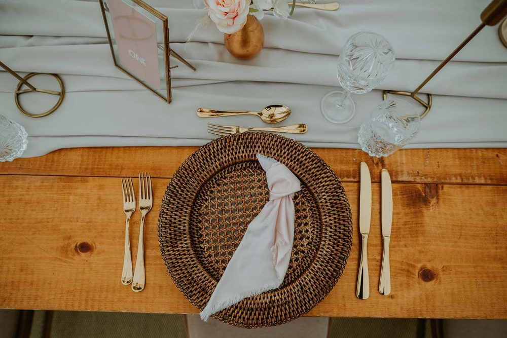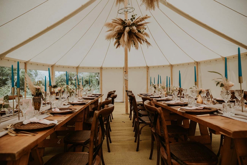Pampas grass clouds make stunning focal points against the cream canvas of the traditional marquee, while shades of oatmeal and blush pink, together with gold cutlery and rattan charger plates, capture the soft palette and earthy textures that underpin the shoot.