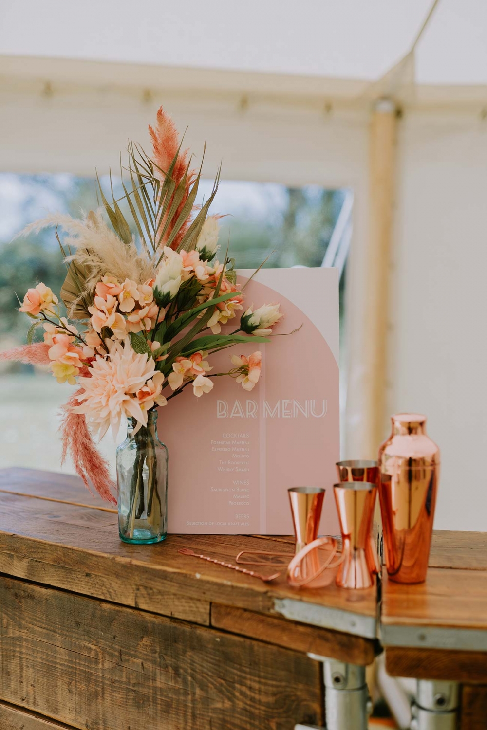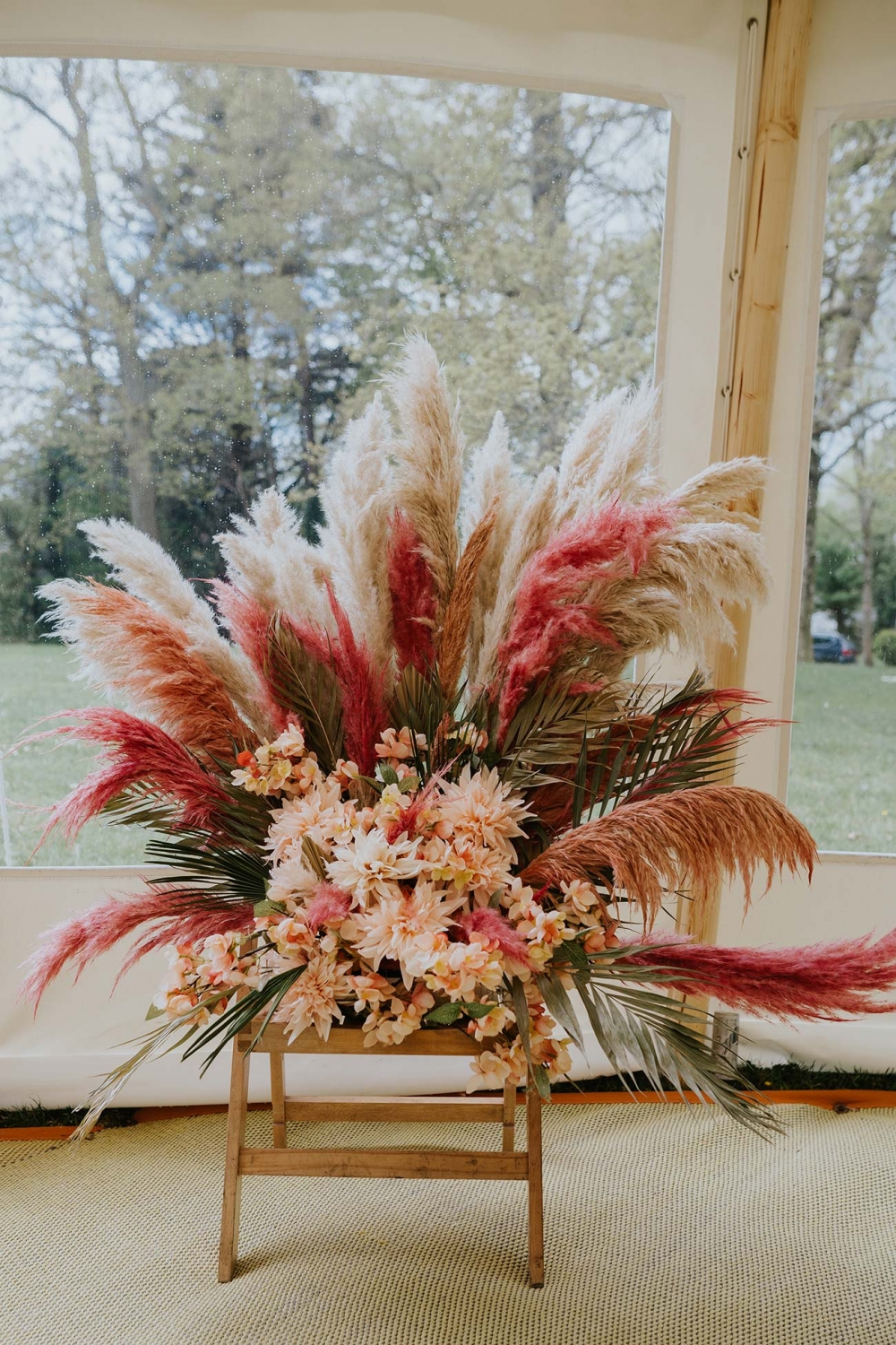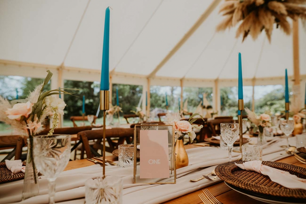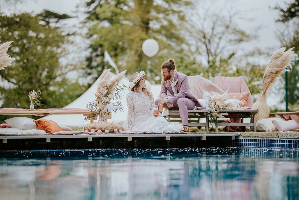 The team drew inspiration from the season for the aesthetic of the shoot. 'As it was spring, we chose pastel colours and lots of pampas grass,' says Caroline. 'The focal point was the Absolute Canvas marquee on the lawn. I wanted to create a space where couples could have their marquee wedding in a chilled environment as well as using the heated swimming pool for a chill-out area.'