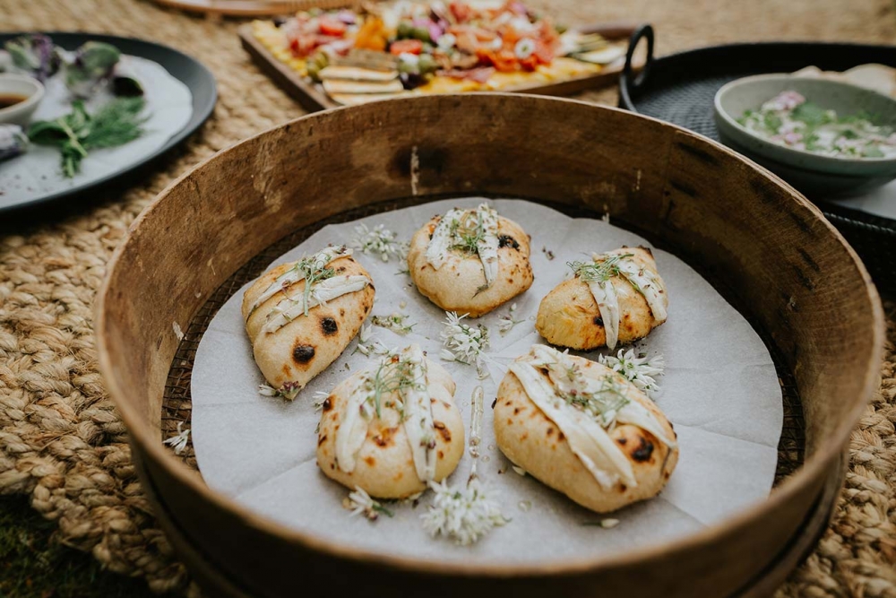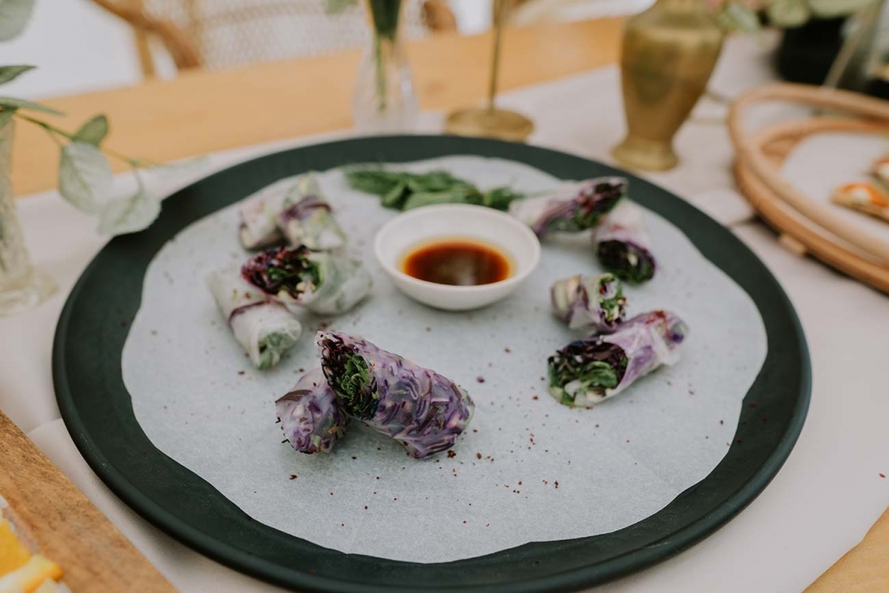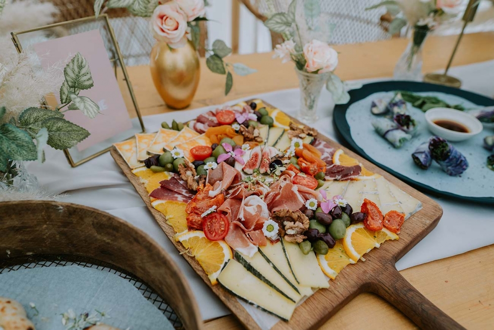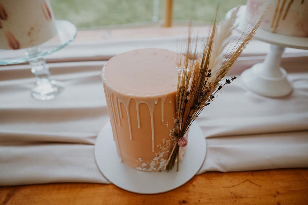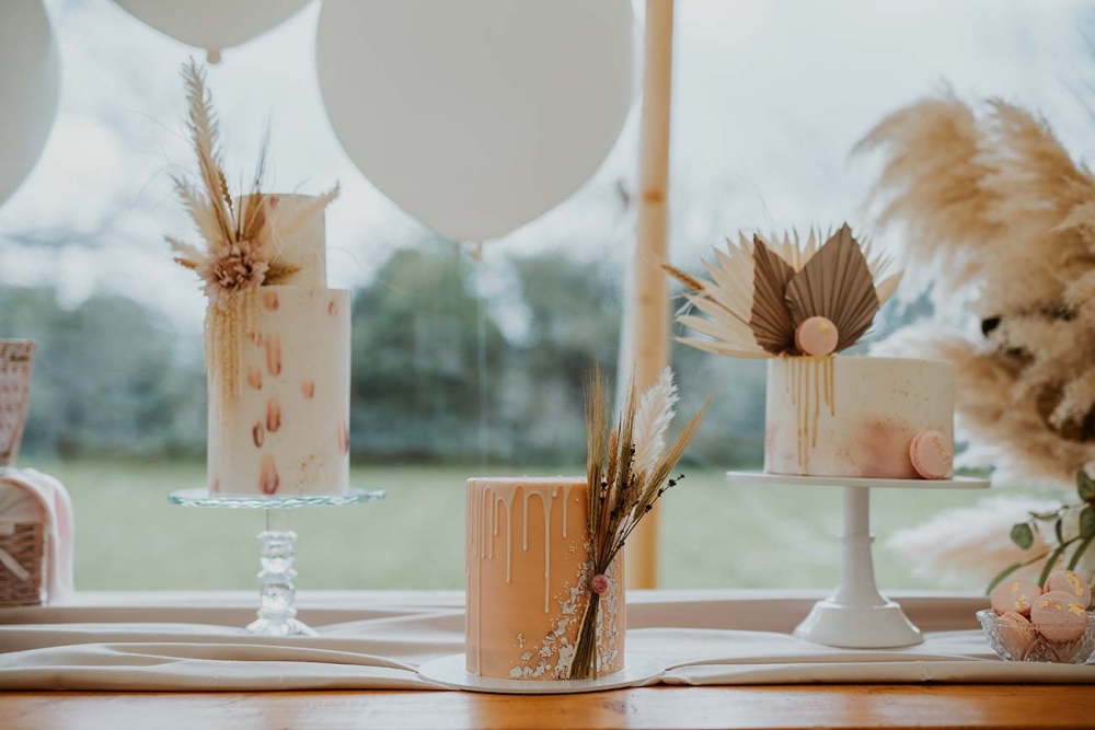The cakes ' a gorgeous trio of confections decorated with barely-there shades, dried palms, pampas grass and delicate florals ' follow suit. Dainty petals also feature on grazing boards filled with local flavours, illustrating how your dishes can slot seamlessly into your wedding scheme, offering sensory delight on multiple levels.