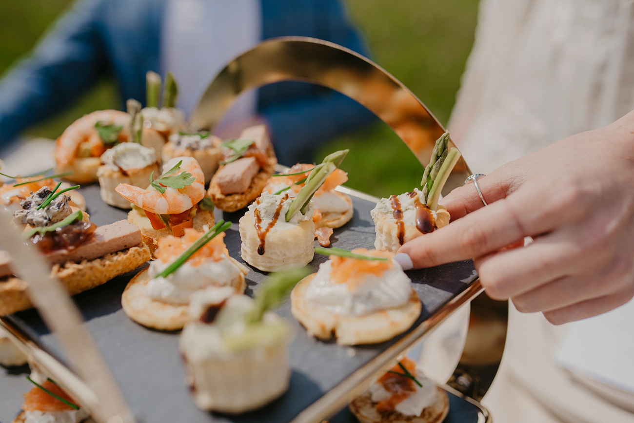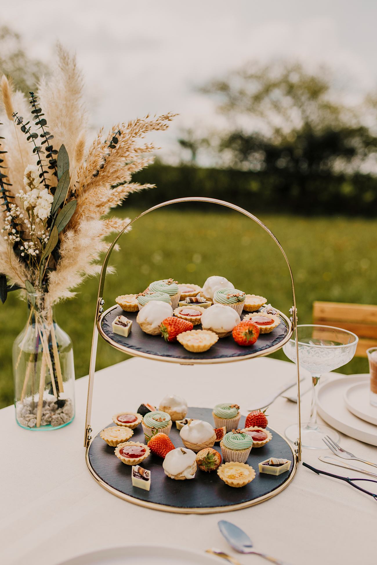 Styled with lanterns and dried flowers, the rustic climes of the candlelit woodshed, with its natural textures and whitewashed walls, is an atmospheric setting for an intimate ceremony. Spilling outside into a meadow speckled with wildflowers, a table dressed with washes of sage green, pops of terracotta and dried flowers makes an idyllic setting to relax and feast on delicious canapés and dainty sweet delights amidst the murmur of birdsong and the Cornish breeze rustling the leaves."