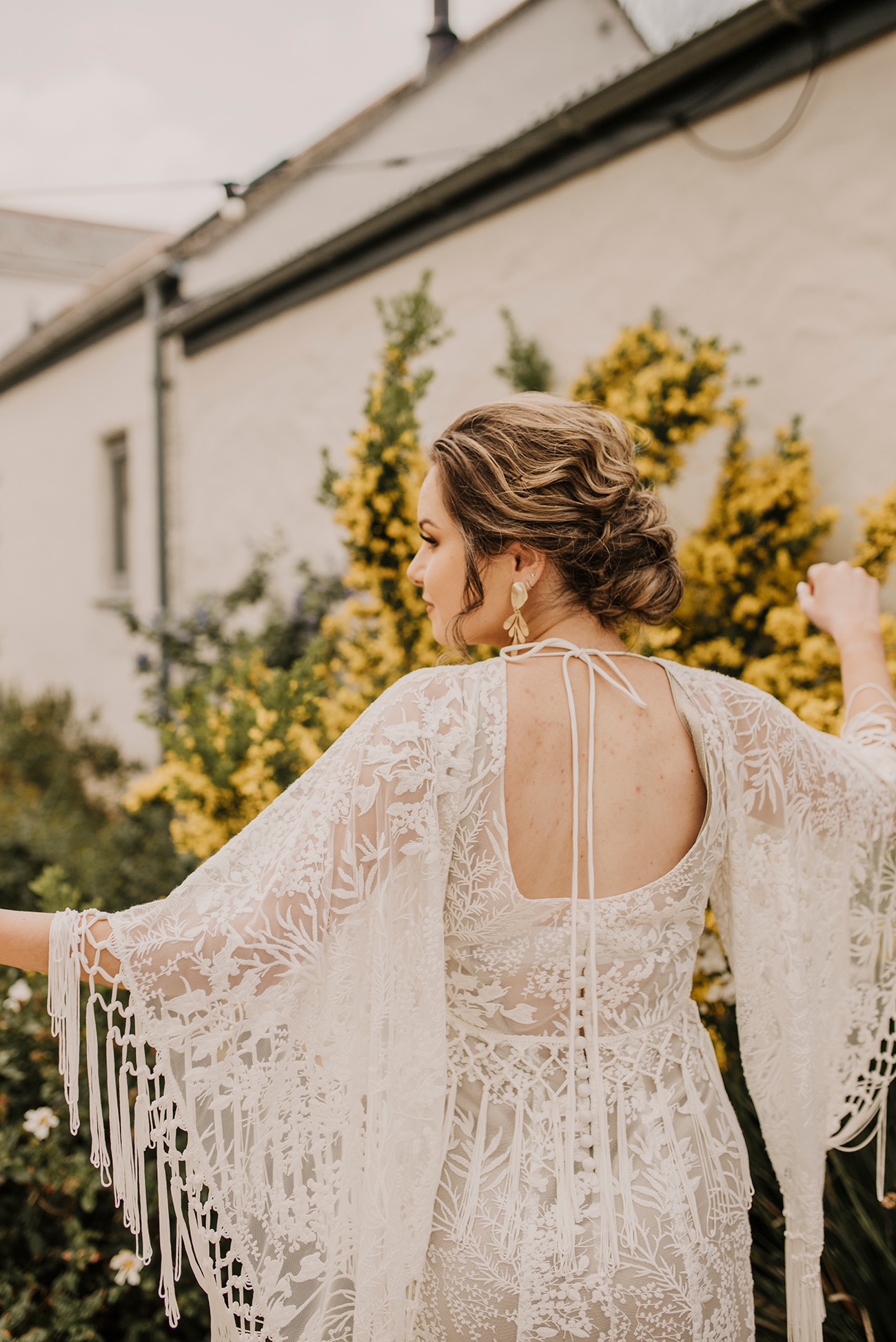 Typifying the look, the handcrafted bridal gown is a bohemian dream with its angel sleeves, tassels and lace paired with dramatic earrings and jewels draped across the forehead.