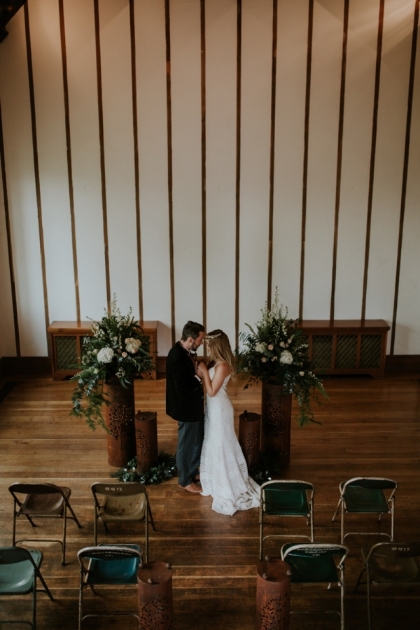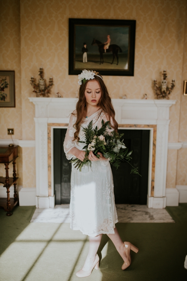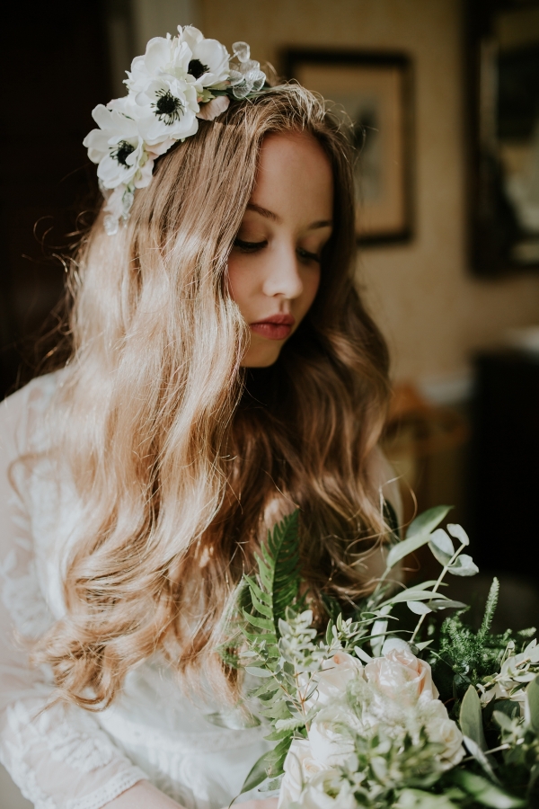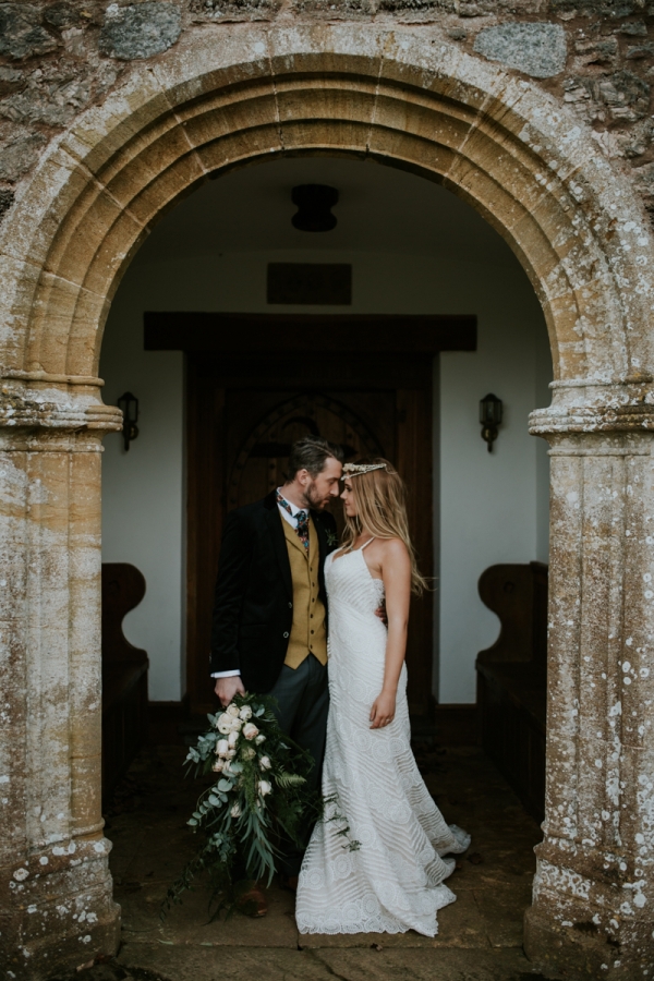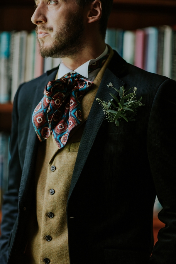 Complementing the bride but echoing the individual spirit of the aesthetic, the bridesmaid wears a vintage dress, loose waves and a selection of bespoke flower crowns. Both the bride and bridesmaid finish their looks with jewellery handmade by Jacqueline Ashworth in North Devon. "I loved the simplicity and high quality of these pieces - they're perfect with any outfit but a delightful look on a bride and a great suggestion for bridesmaids' gifts," says Bridget. Completing the super-stylish wedding party, the groom wears an eclectic mix of navy velvet, mustard tweed and greys. "The slimline trousers and silk cravat give this edgy look a contemporary and very wearable feel," concludes Bridget.