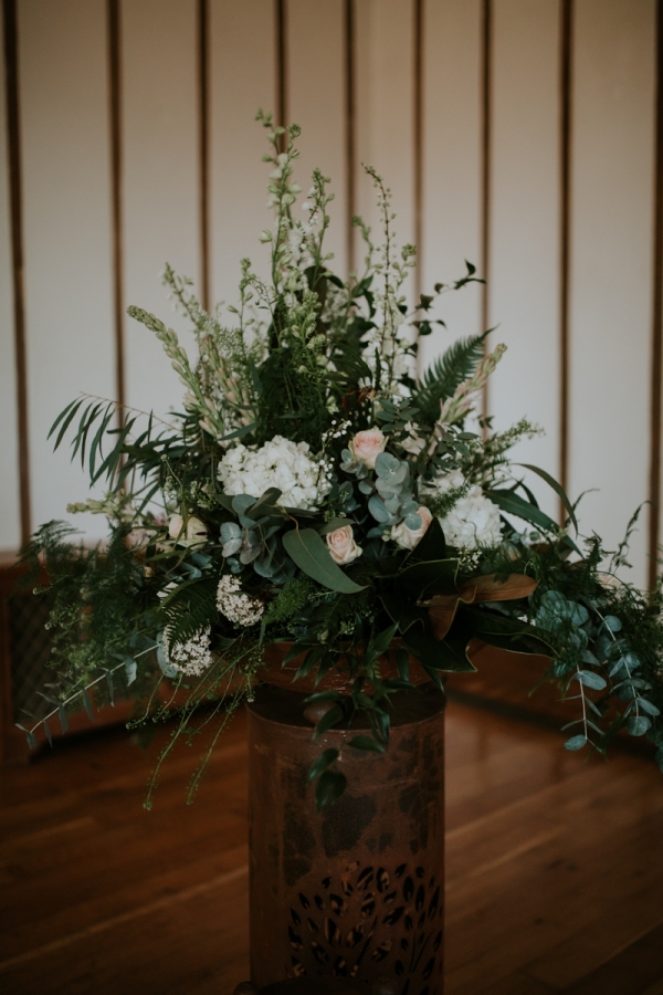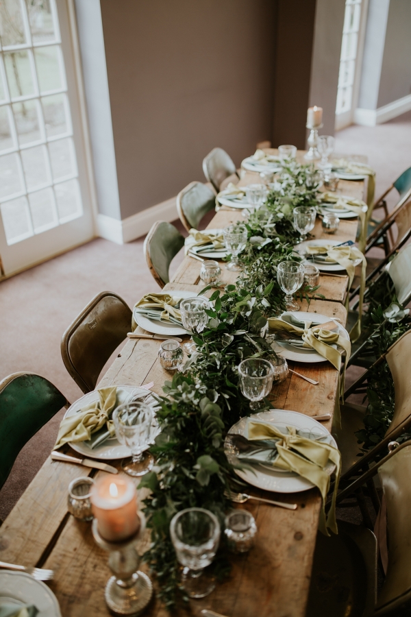 An abundance of greenery adorns the tables and chair backs, weaving plaster pink roses with trailing vines. "I dressed the table with Bridwell's own crockery, satin napkins and oversized ties in hues of duck egg and green and feathers," says Bridget. In the chapel, metal pillars and lofty floral displays enhance the mood of drama and opulence.