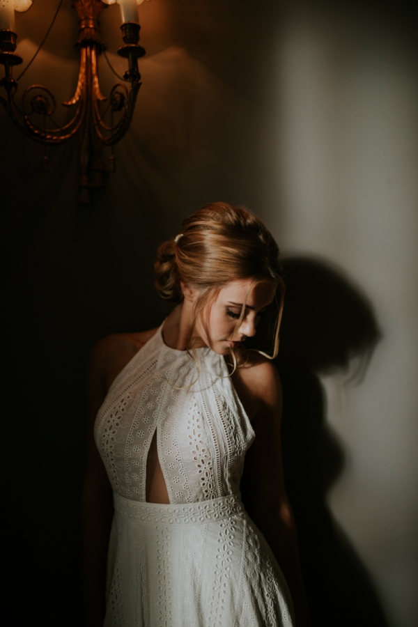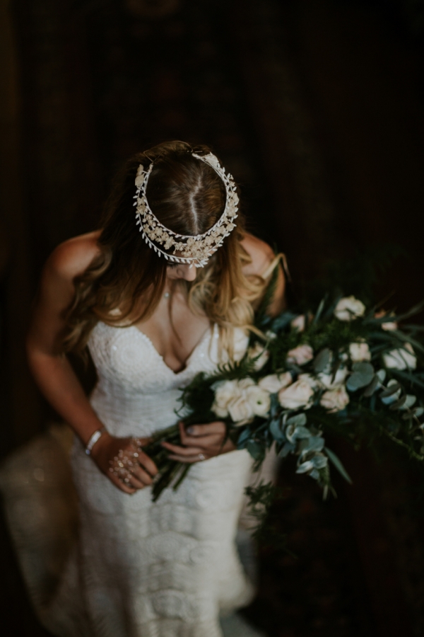 The bridal look beautifully echoes the mood. "Both dresses are exactly what I think of as boho with a dash of refinement," says Bridget of the gentle beadwork embellishment of one to the cotton lace and modern feel of the other. Continuing the effortless boho vibe, the dresses were paired with soft tumbling curls for the daytime look and a relaxed up do for the evening, complete with a vintage headdress, fresh, warm make-up and dramatic lashes.