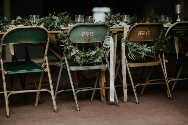 A palette of plaster pink, navy and brown carries through the details. Bridget created a gorgeous tablescape, complete with striking chairs sourced from an Indian cinema and rustic trestle tables. "The chairs worked brilliantly with the palette and served as the perfect contrast to the luxe look that we created around them," she explains.