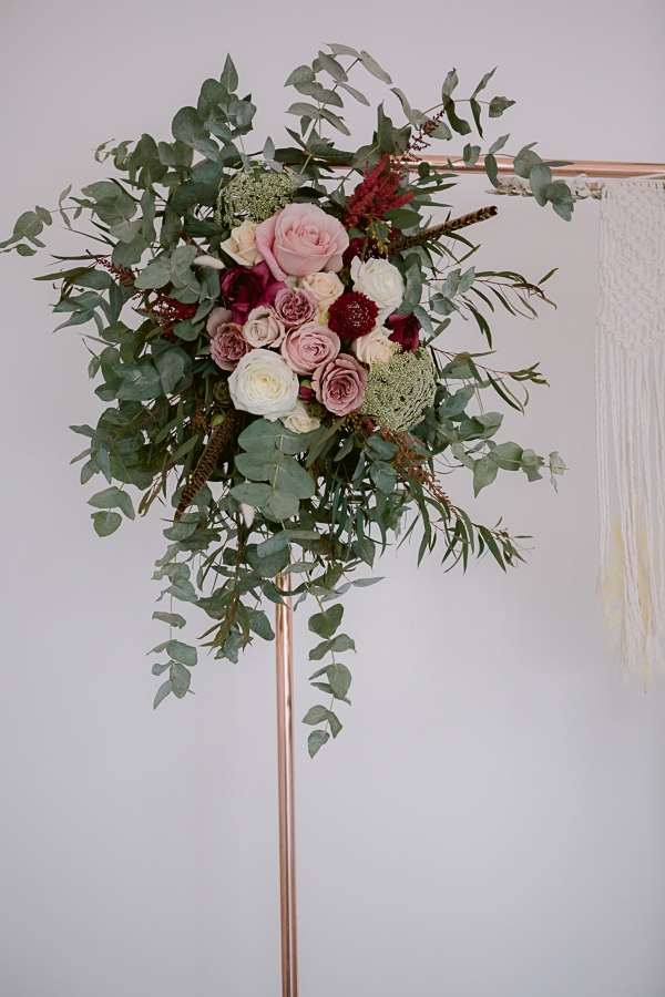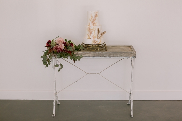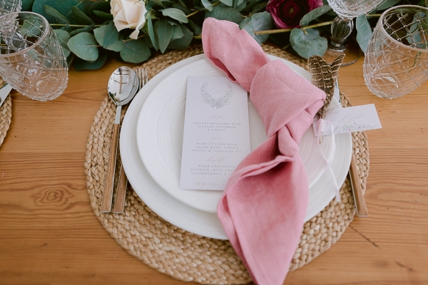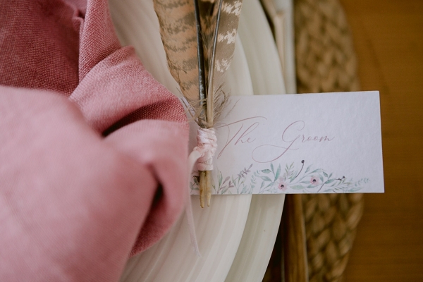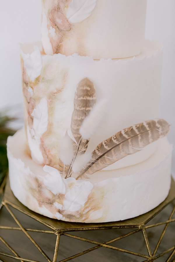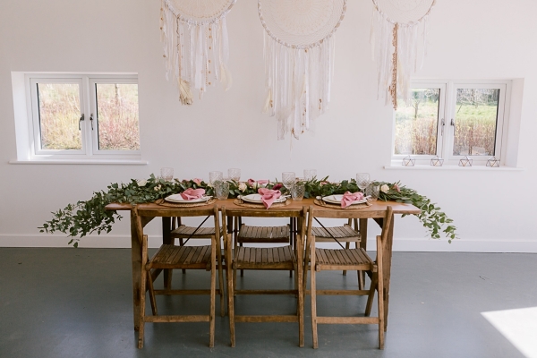 'We kept the colours soft and neutral, using lots of green foliage and pops of pink,' says Jennifer. Feathers adorn the place settings and striking hand-painted cake, bringing elements of the countryside indoors, while echoing the bohemian mood of the dreamcatchers and macramé ceremony backdrop.