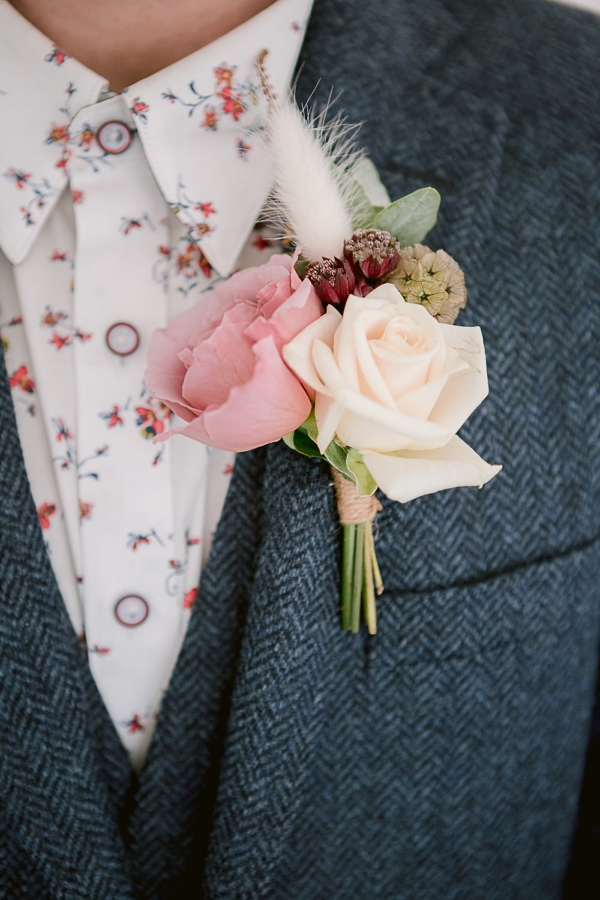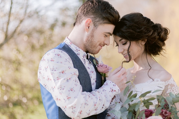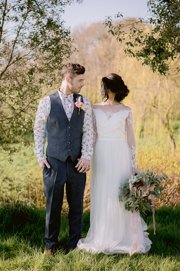 Together with the abundant florals, the bride's flowing dress laced with pink and the soft tendrils of her hairstyle bring an effortlessly romantic feel to the shoot, while the groom's tweed suit, paired with a floral shirt, is the epitome of modern and relaxed country chic ' a fitting look for this celebration of rural love.