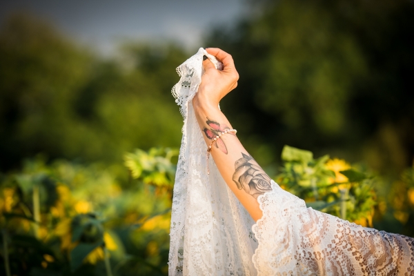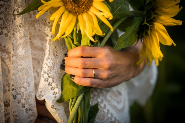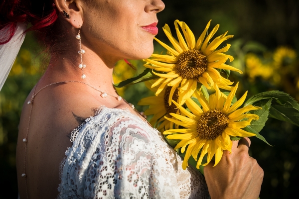 The fading light not only picks up the dazzling golden detail of the surrounding sunflowers, but casts a soft light on the bride's exquisite outfit, where flowing cuts meet dramatic detail for a look that smacks of casual, yet cutting edge style.