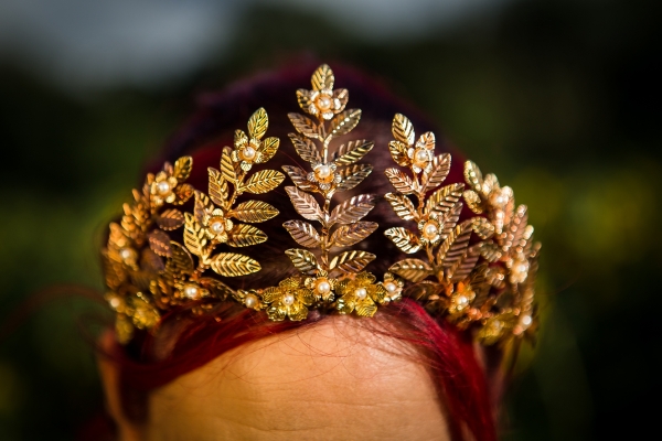 Then there's the accessories. The piece de resistance is the statement crown: a nature-inspired metallic masterpiece of wearable art. A stunning drop back necklace draws attention to the sultry expanse of skin and is joined by gorgeous pearl drop earrings and bracelet, while a delicate wedding band completes the finishing touches.