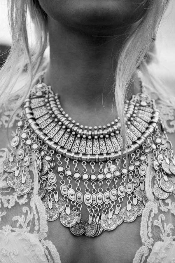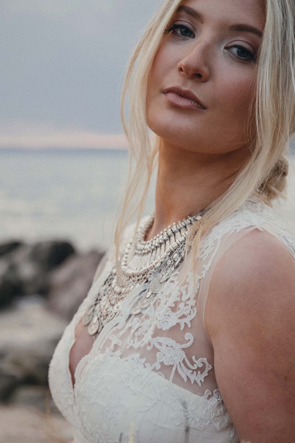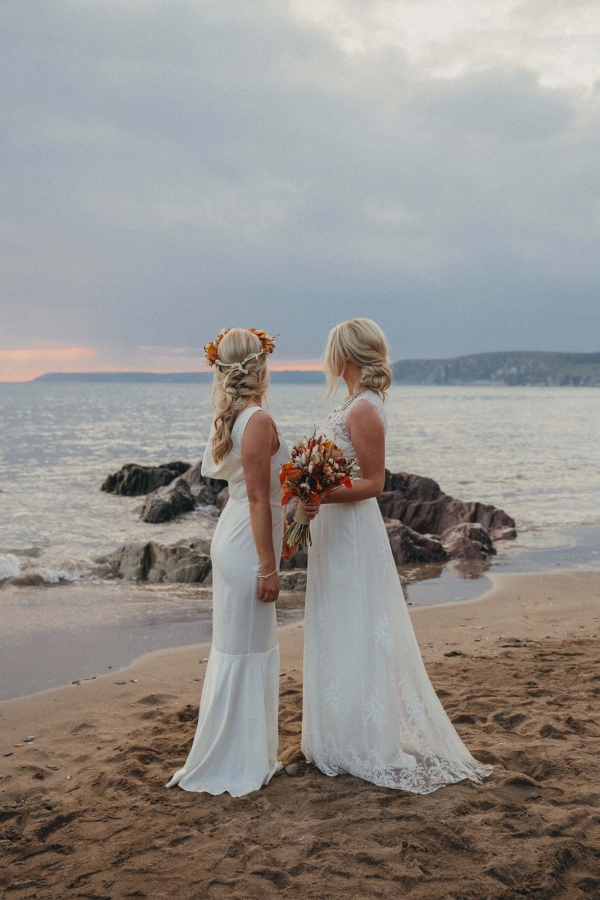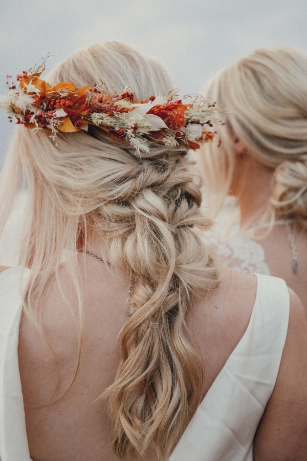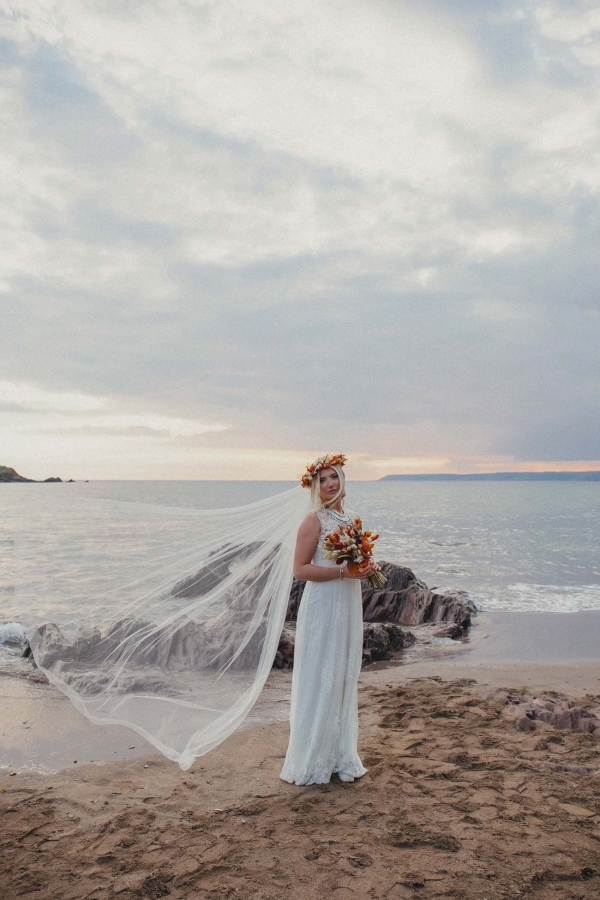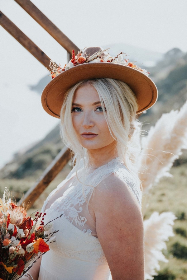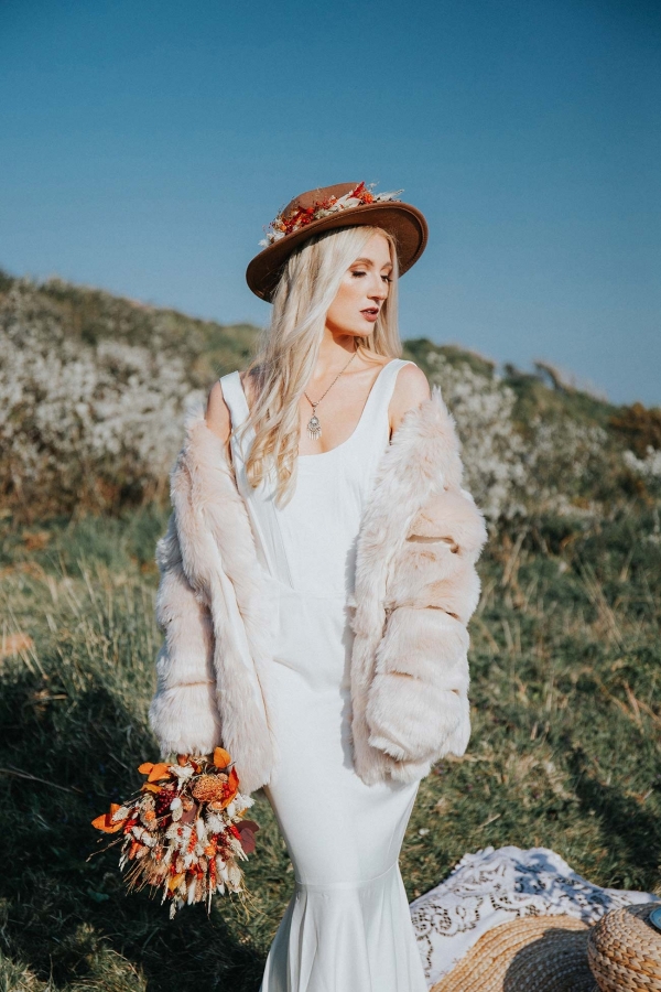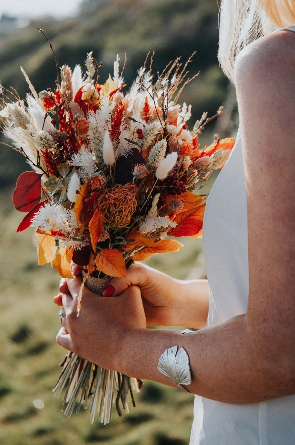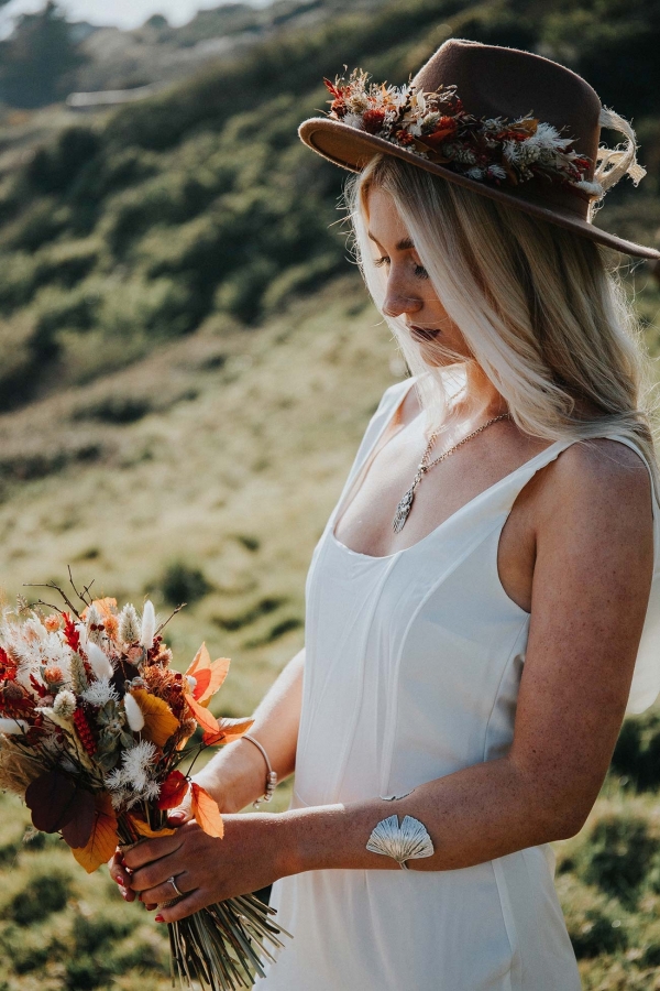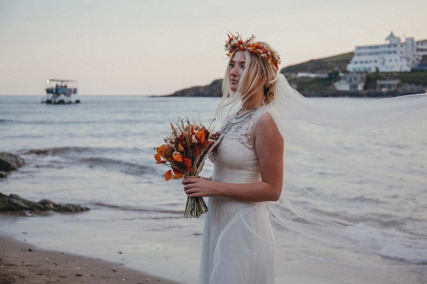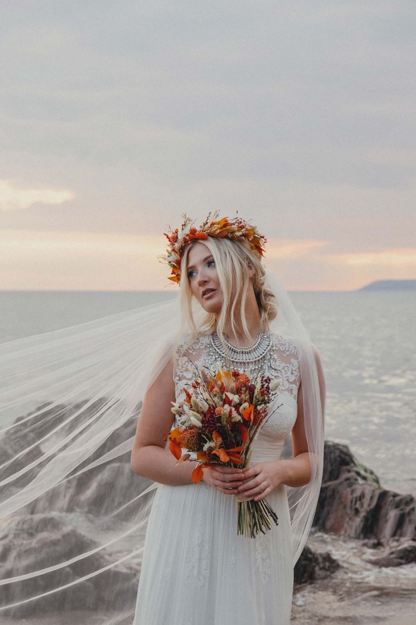 Accessories are key to this standout look and a dried flower bouquet and crown combining neutral shades with bold red and burnt orange pop against the vintage lace dress and draped sheath design. A vintage hat and striking, ethical jewellery, together with soft boho hair, adds fashion-forward and coolly relaxed flair, perfect for a dream Devon wedding by the sea.