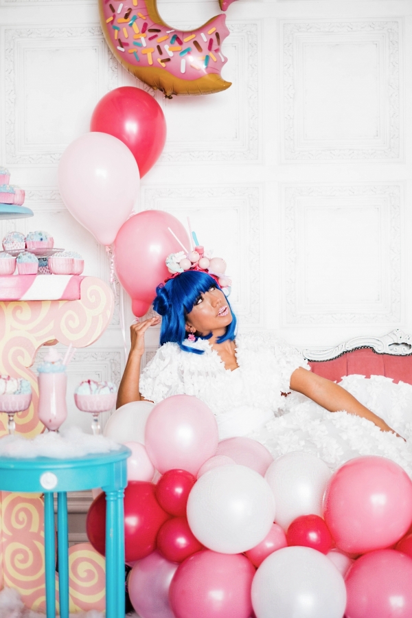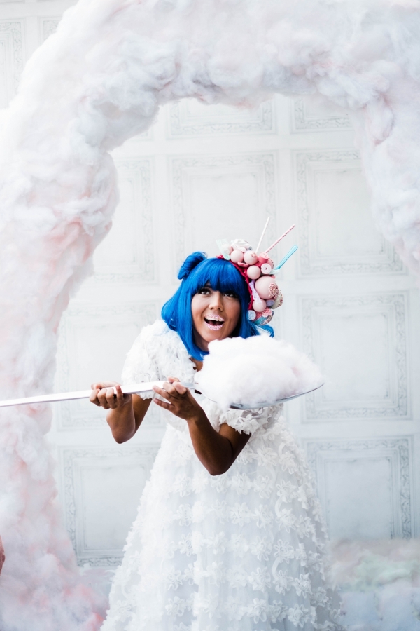 Vivid colours and bold blue hair and make-up are softened by giant cotton candy arches, while the playtime-inspired gown will have you all dressed up and ready for the party of a lifetime. Strawberry milkshakes and retro sweeties sit atop vintage furniture that's home to flamingos alongside cupcakes. It's bold, it's eclectic, and most of all it's fun.