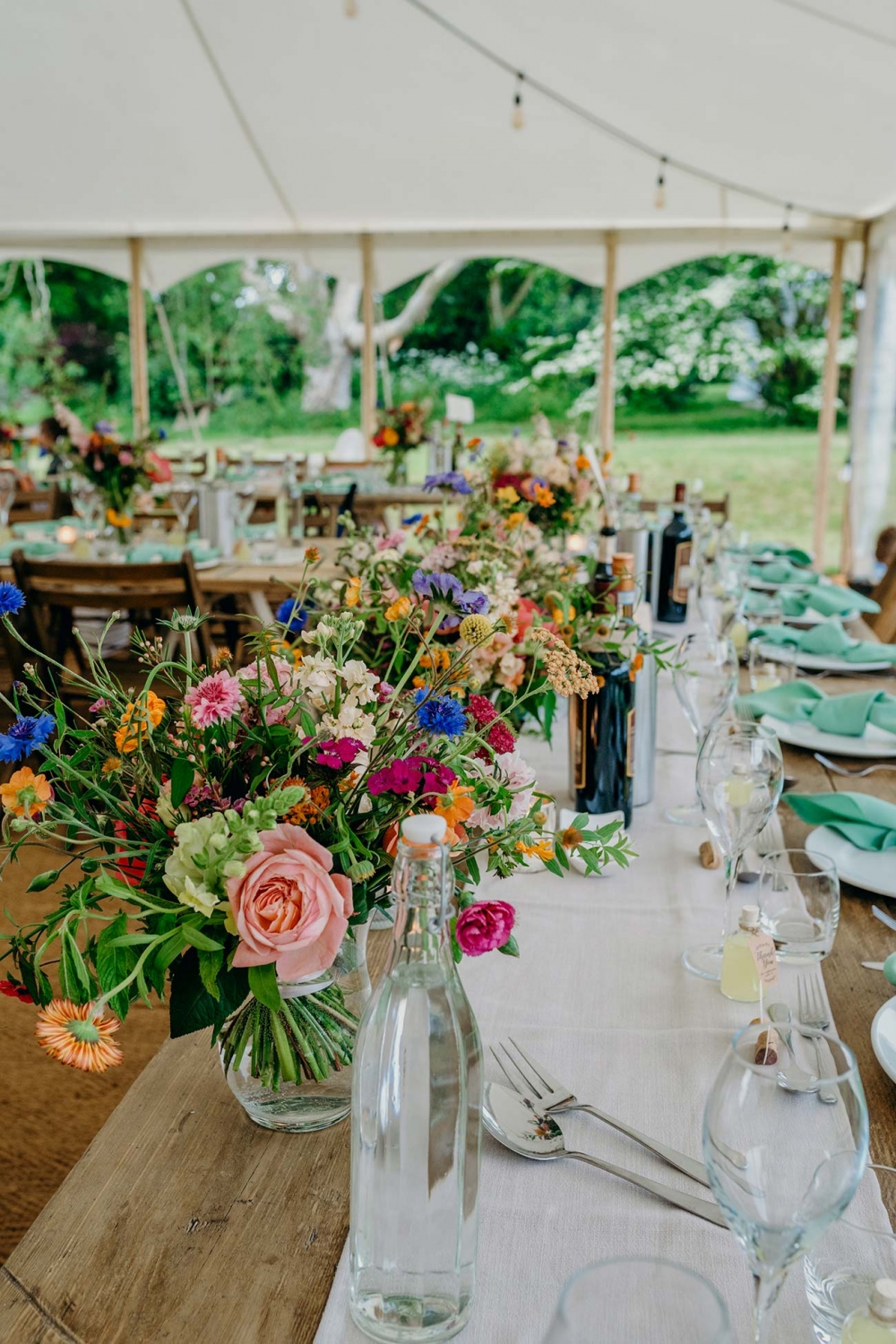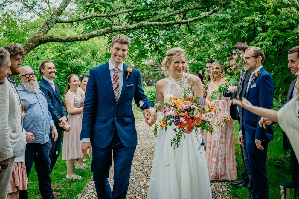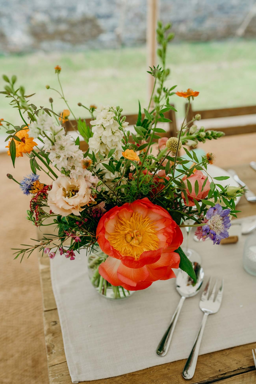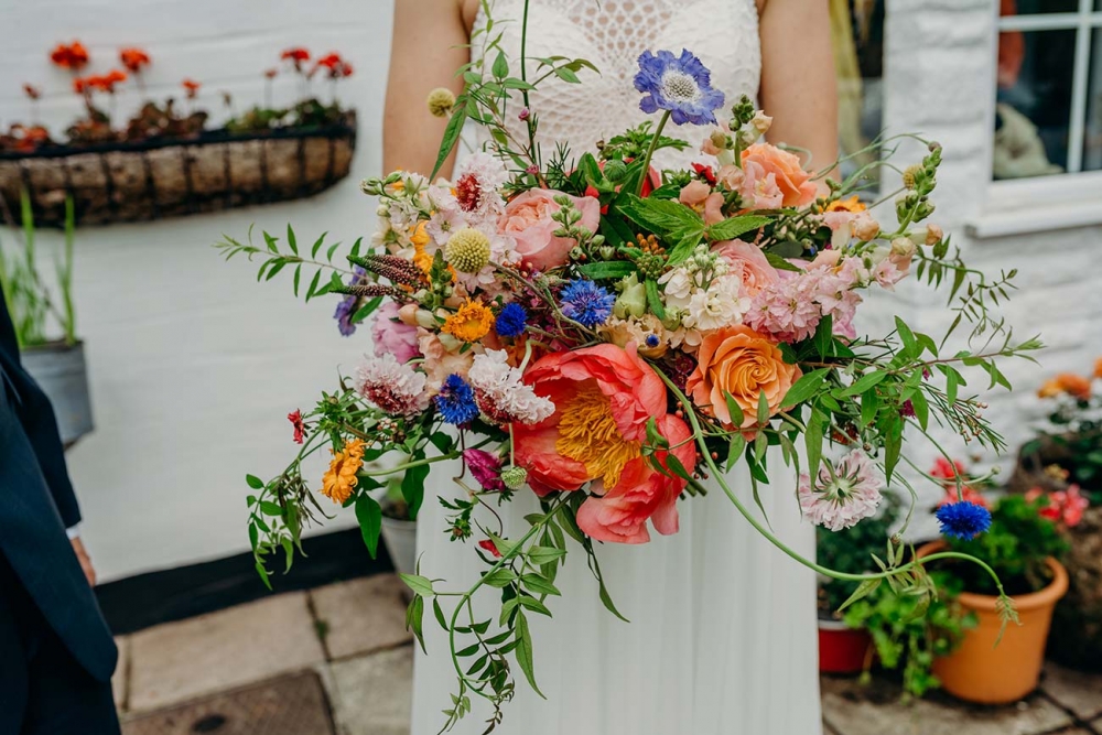 Selecting a bright colour scheme of coral, orange and pink, the décor was flanked by fabulous floristry in similar hues. 'I wanted it to feel like summer even in the UK drizzle,' says Charlotte. A combination of peonies, roses and seasonal wild flowers was central to achieving the 'fresh from a hedgerow' look, while the bouquets 'all had depth, colour, texture and movement'.