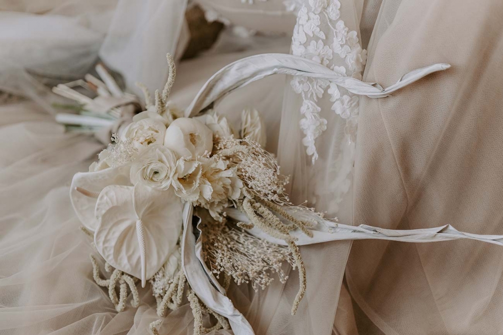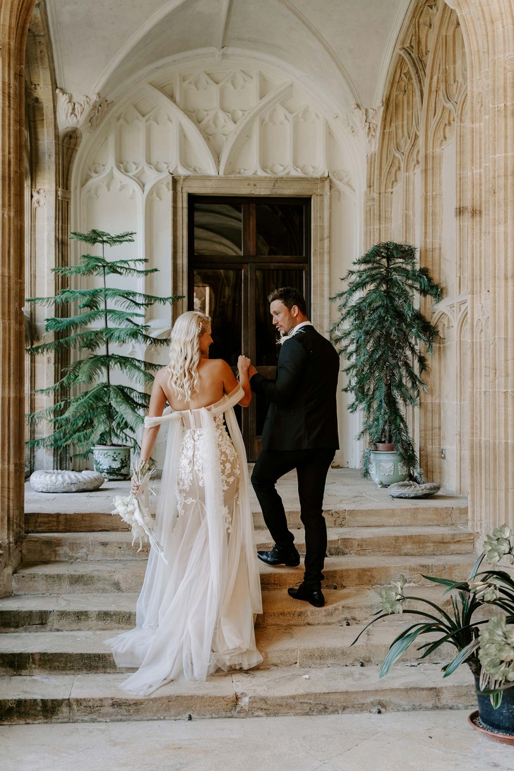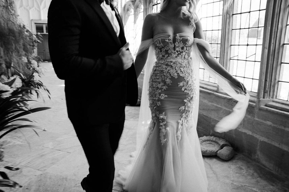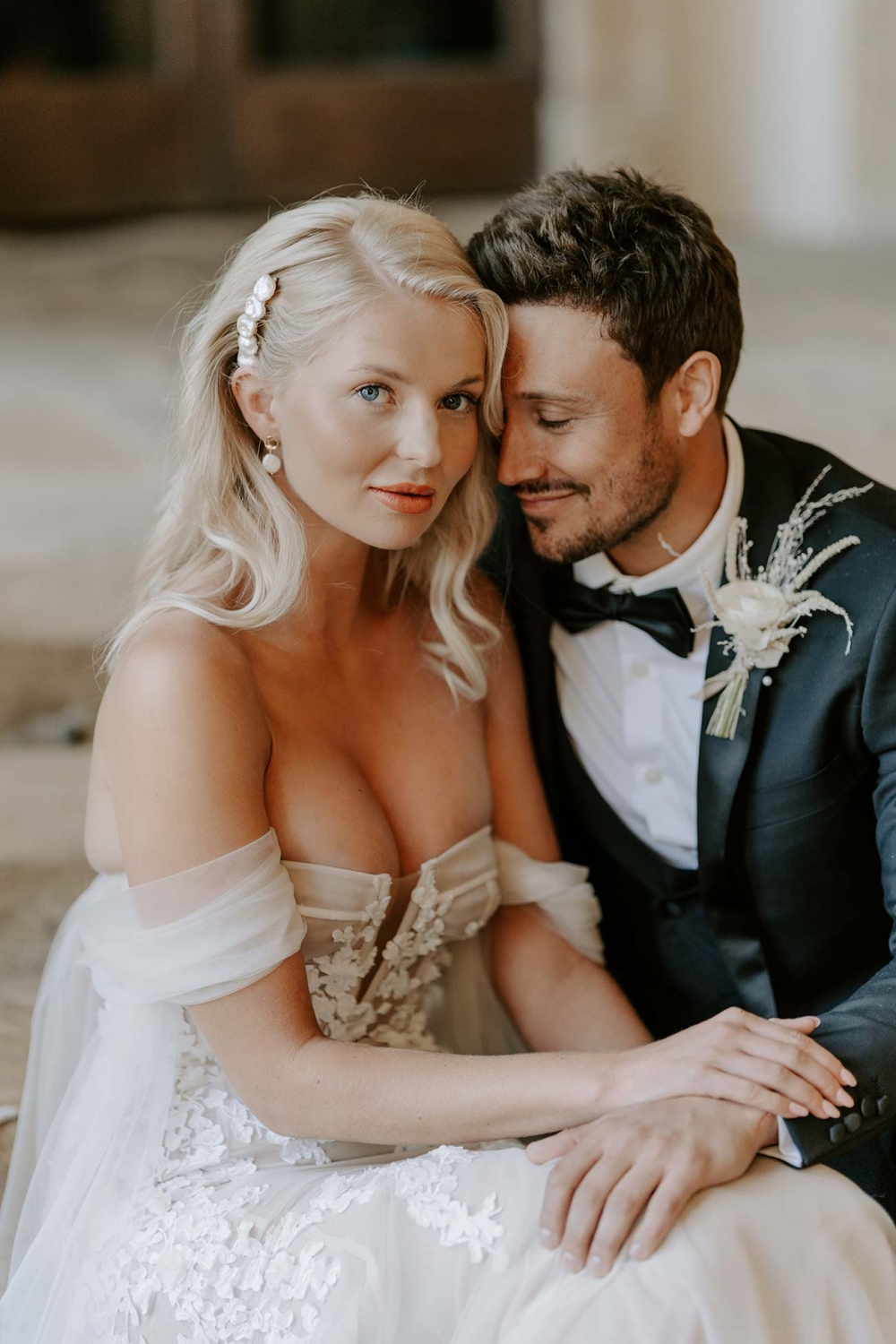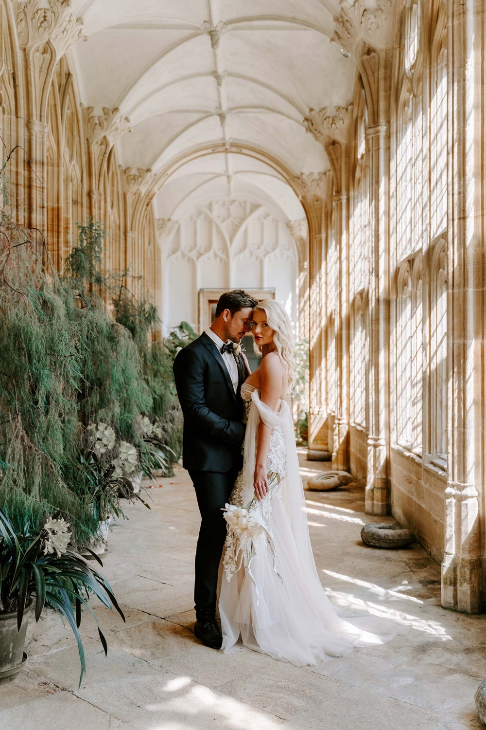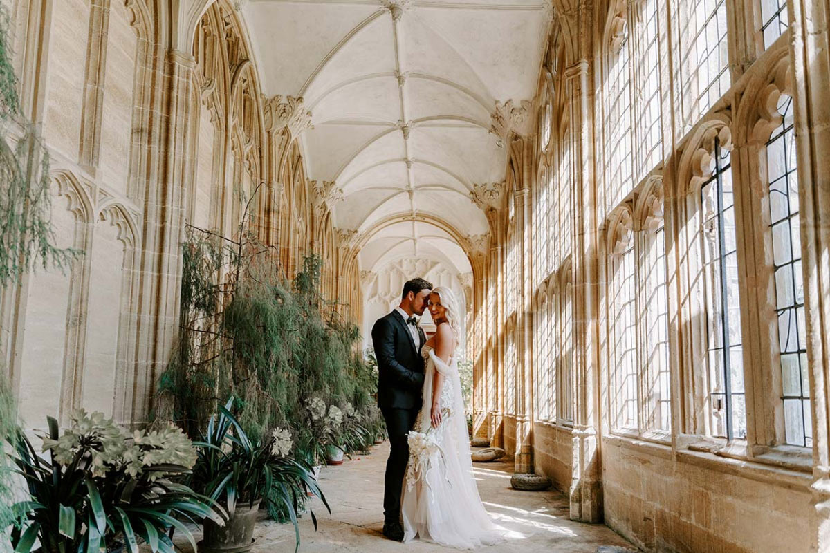 The bride's gorgeously embellished gown provides a wow factor to match the décor and glorious architecture of the setting, her pearly accessories nestling amidst softly waved hair and her crisp white bouquet the perfect pairing for the look. Her groom cuts a suave figure in a sharp dinner suit, enhancing the glamour factor of this truly enchanting wedding scene.