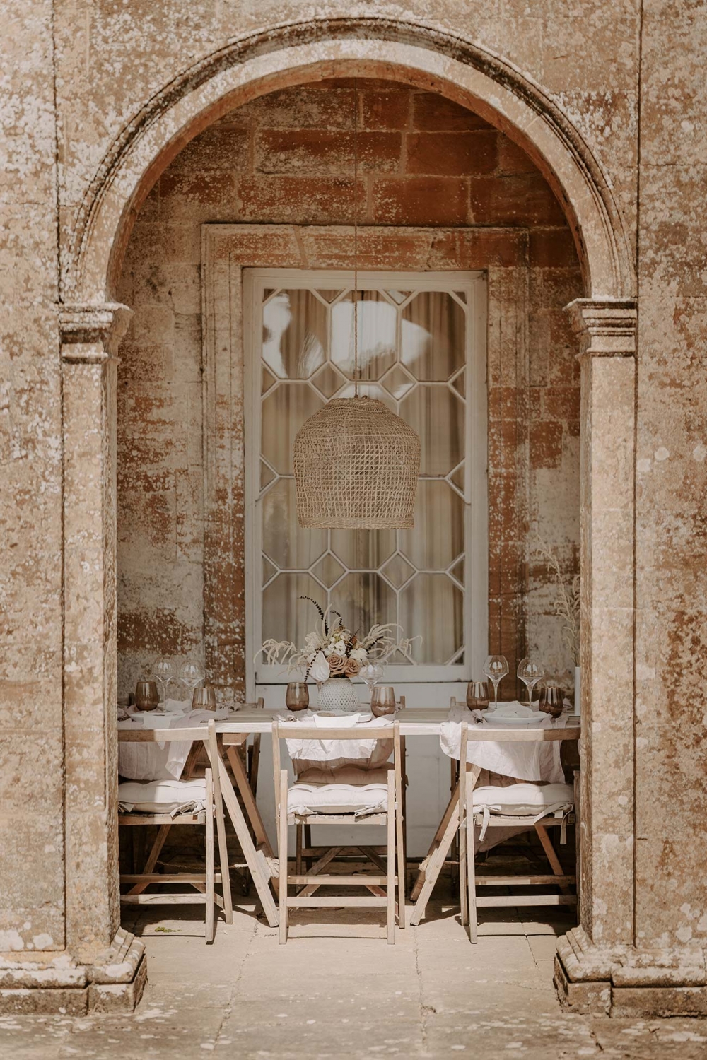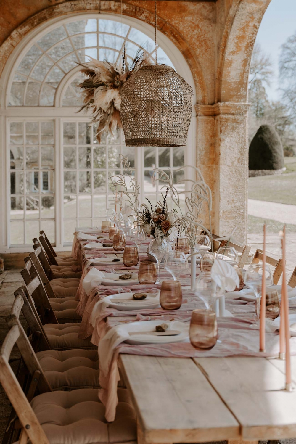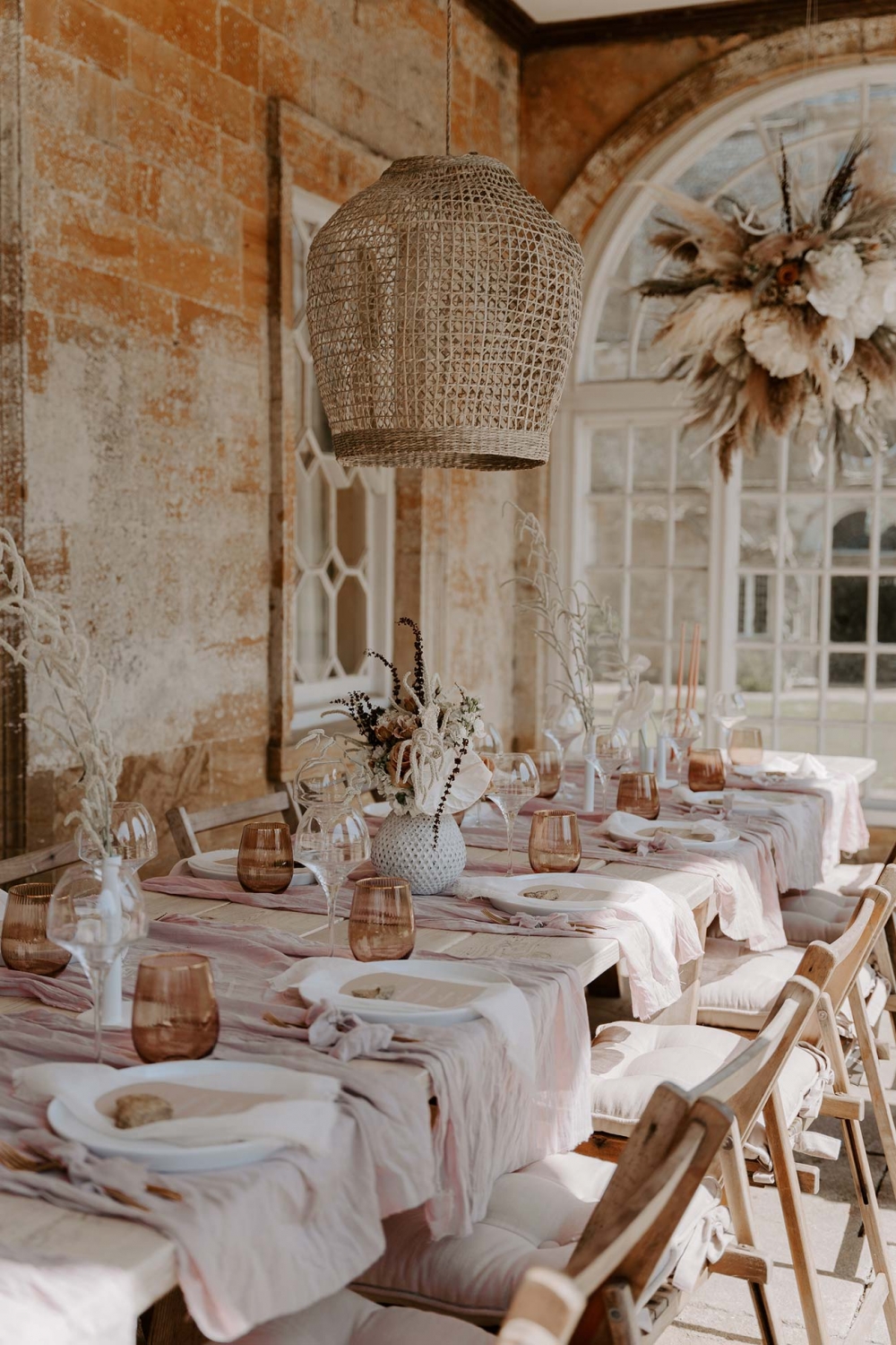 Bathed in sunlight, the chic tablescape could quite easily be situated in Italy or France as this historic spot in the English countryside. A palette of barely-there shades meets a whisper of romantic pink beneath a dreamy, cloud-like floral installation, while natural textures, from rattan to wood, echo the warm tones of the timeworn walls.