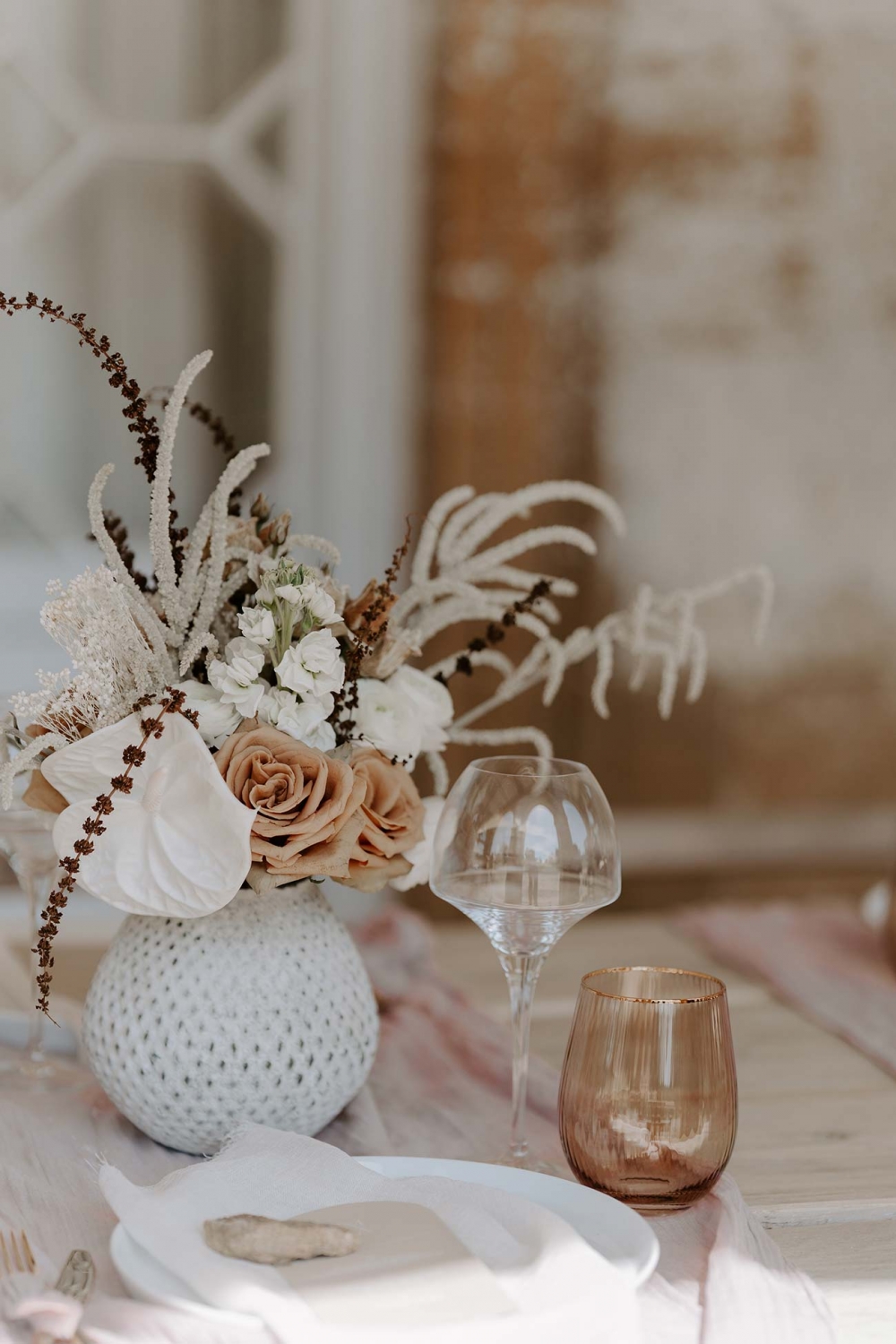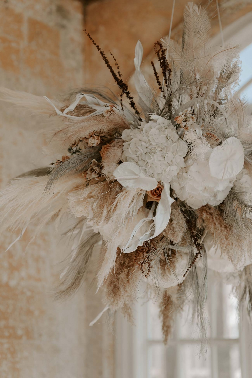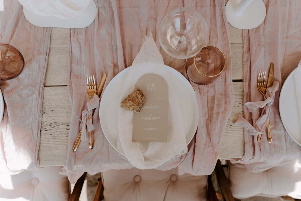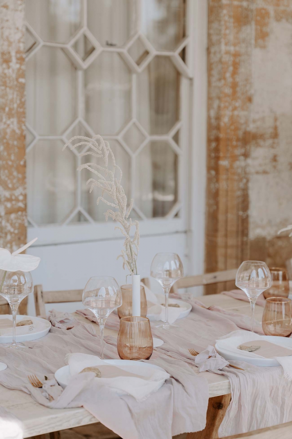 Bathed in sunlight, the chic tablescape could quite easily be situated in Italy or France as this historic spot in the English countryside. A palette of barely-there shades meets a whisper of romantic pink beneath a dreamy, cloud-like floral installation, while natural textures, from rattan to wood, echo the warm tones of the timeworn walls.