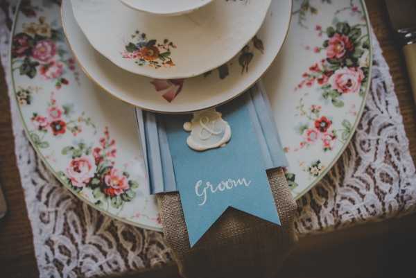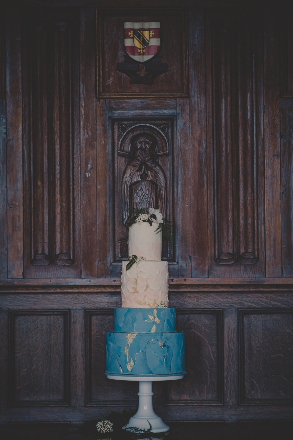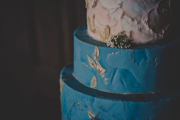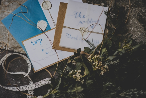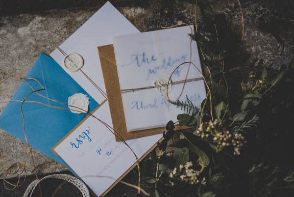 A blend of blues and neutrals are combined with rich texture in the cake and finished with intricate gold detailing. Classic yet minimal stationery uses old wax seals to bring an elegance that's offset with the use of twine among blue and brown shades.