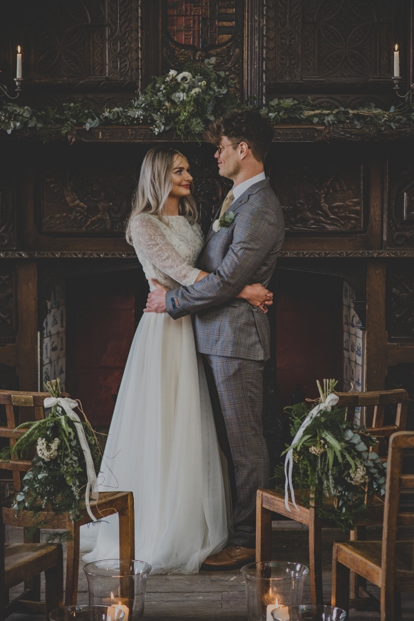 "There is so much to this venue," says Bridget from Blue Fizz Events, who styled the shoot. "Whether you envision a forest ceremony in the summer or a morning room in the winter with roaring fires, the whole site is licensed, including a church at the bottom of the lawn in picturesque rolling Devon hills."