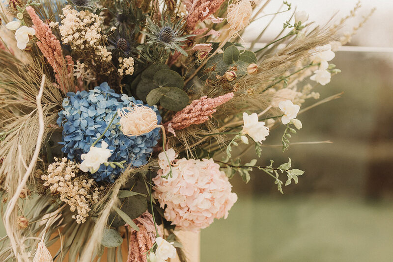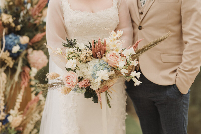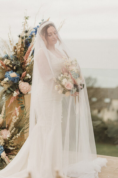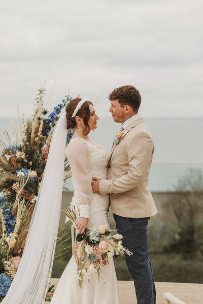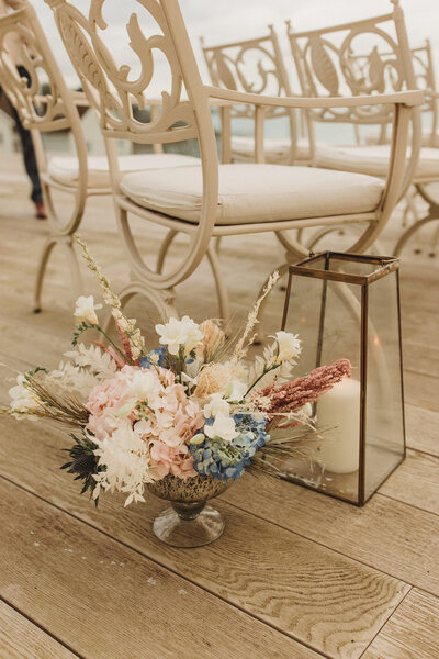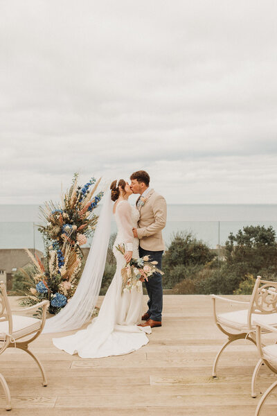 The al fresco ceremony on the decked terrace is framed by the staggering views and requires minimal décor. Drawing on the surroundings, a floral arrangement featuring a gorgeous mixture of sea blues, barely-there pinks and muted greens creates the sole stylistic statement.
