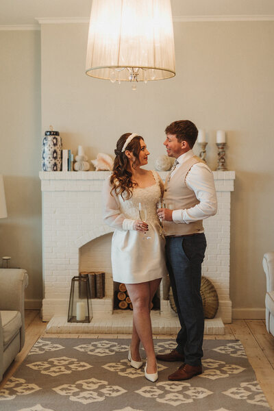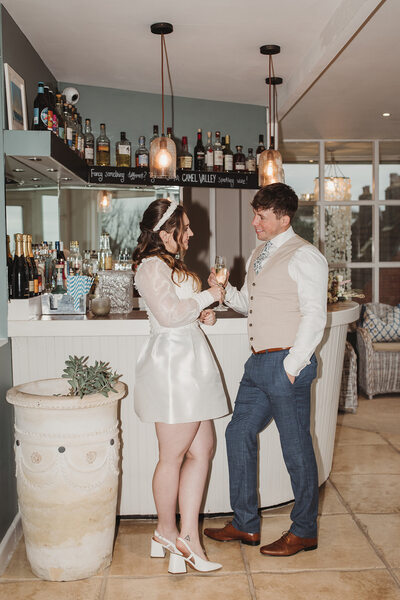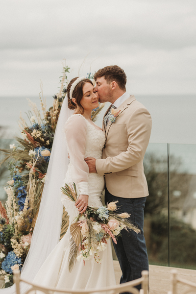 The bride wears a stunning fit-and-flare gown accompanied by her groom in a sand-coloured jacket with sea blue trousers, the couple complementing their surrounds to show-stealing effect. Swapping her floor-length skirt for a satin mini for their first dance moment, the newlyweds share a kiss and raise a glass of bubbly at the bar – drinking in the romance of their stylish soirée in this secluded seaside sanctuary.