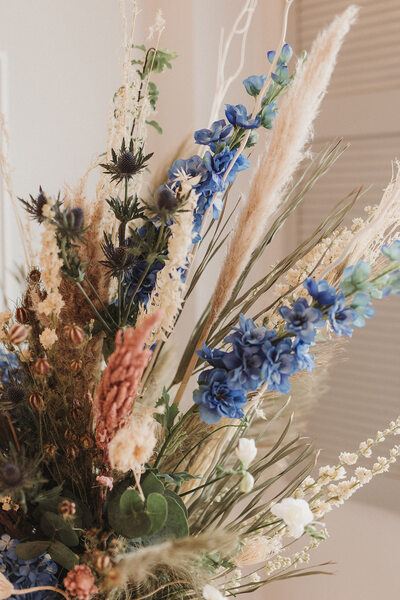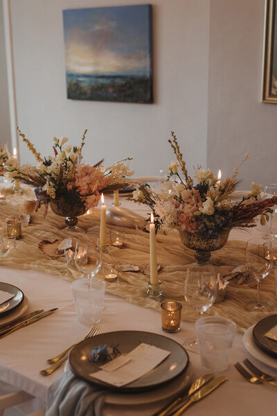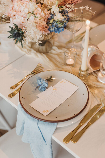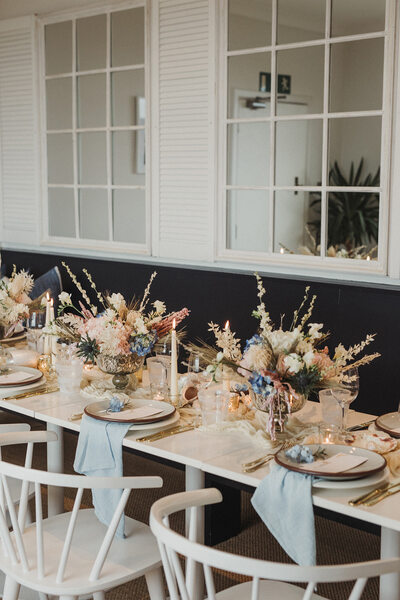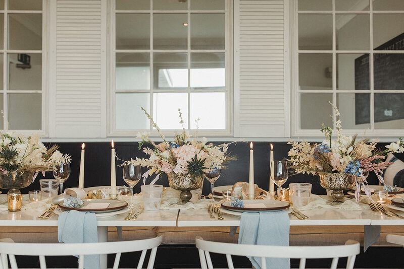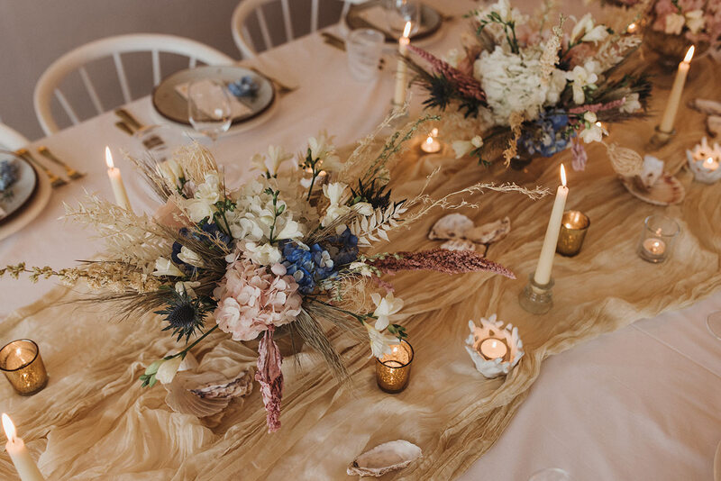 The laidback yet luxe air continues in the intimate reception space, where a palette of clean white and neutrals meets dreamy pops of colour in the ocean canvases at the walls. This is accentuated by gold flatware, glossy pebble coloured charger plates and a smattering of light-glinting glassware. Organic shapes and textures are woven into the scene with shimmering shells and coral-curved votives, while the dusky blue cake, decorated with dried flowers and metallic accents, beautifully ties the look together.