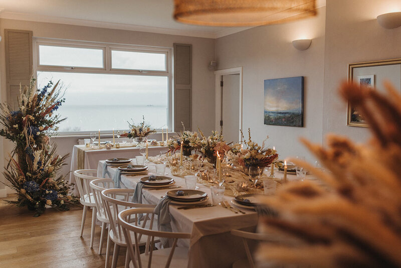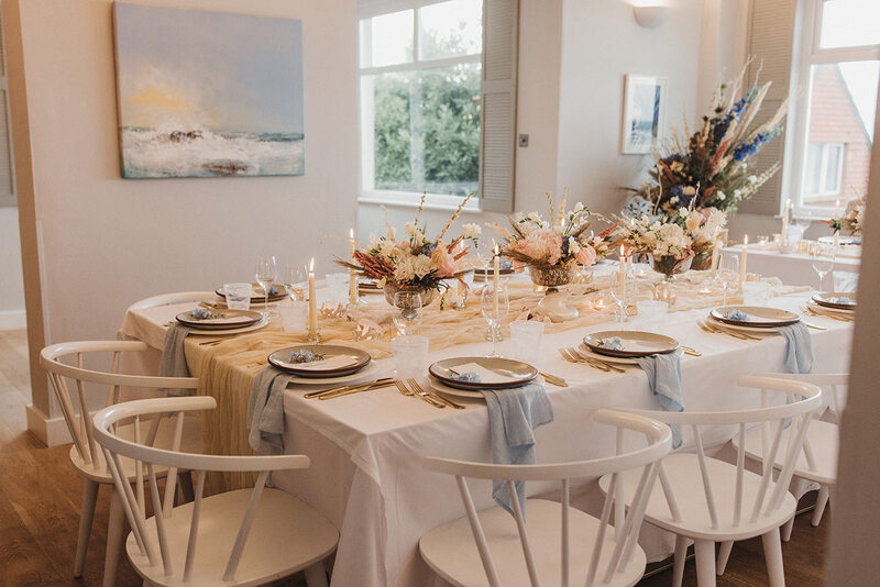 The idyllic backdrop for this coastal-inspired styled shoot, Boskerris Hotel is nestled high on the cliffs above the sands of Carbis Bay, affording sweeping gull’s eye panoramas from St Ives to Godrevy Lighthouse and beyond. The interiors are a light-filled vision of clotted creams, ocean blues and earthy tones spliced with Mediterranean style, which all carry the relaxed rustic-beach aesthetic throughout.