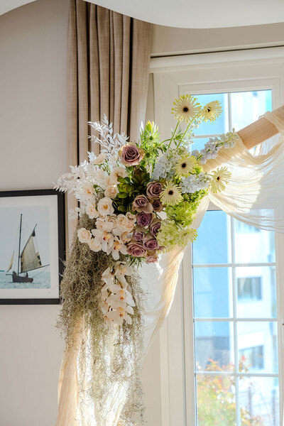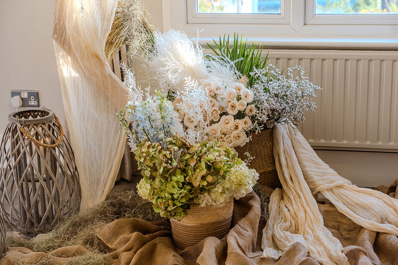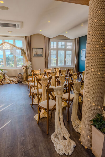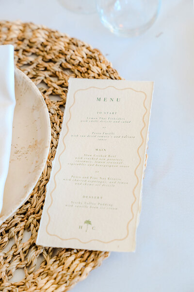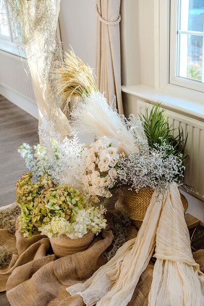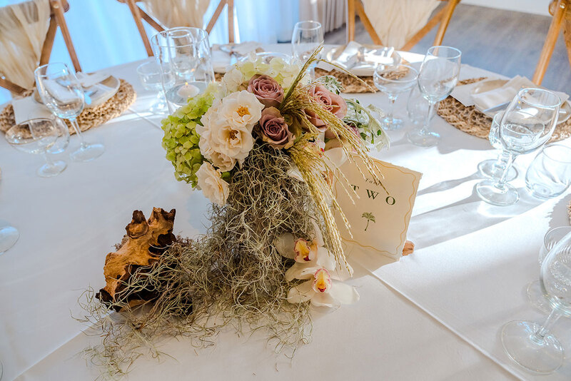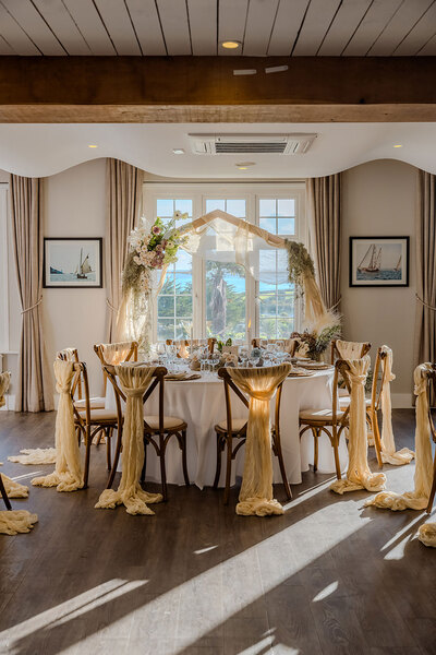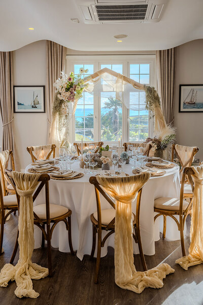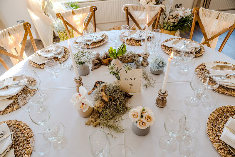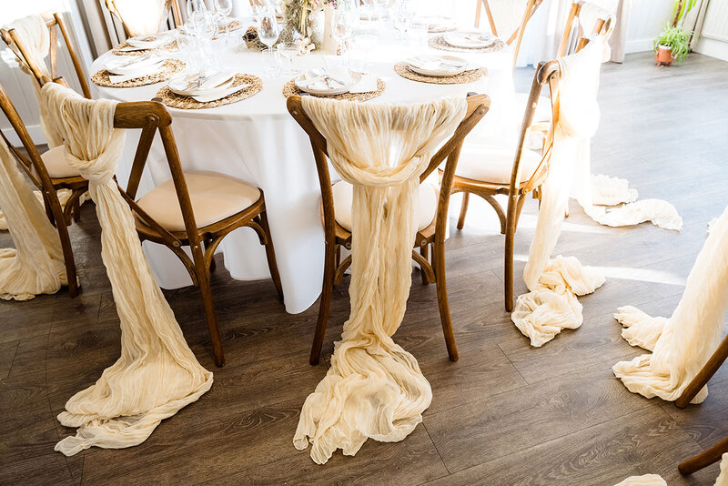 This styled shoot embraces the raw beauty of the coast with a palette of soft whites and sandy beiges, blending vintage elements with natural textures to create a look that is both timeless and effortlessly romantic. A mix of seagrass chargers, dark mango wood candlesticks and vintage mismatched coupes bring a sense of organic sophistication to the tablescape, while earthenware stone pottery from the venue provide a beautiful contrast. Flowing fabrics and delicate florals enhance the ethereal atmosphere, and Ghost chair drapes softened the overall aesthetic, adding a dreamlike elegance to the scene.
