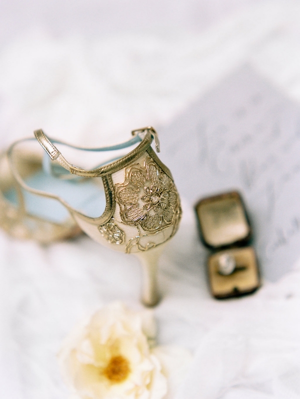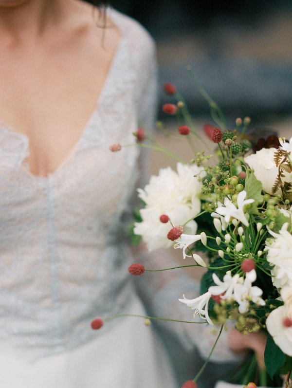 Delicate white blooms and greenery with rich colour pop reds lend a classically romantic, yet contemporary vibe with trailing ribbons that billow amongst the breeze-licked bridal skirts; while a stunning copper floral hair pin is picked up by the metallic tones of the gorgeous, intricately designed shoes to add further texture and depth.