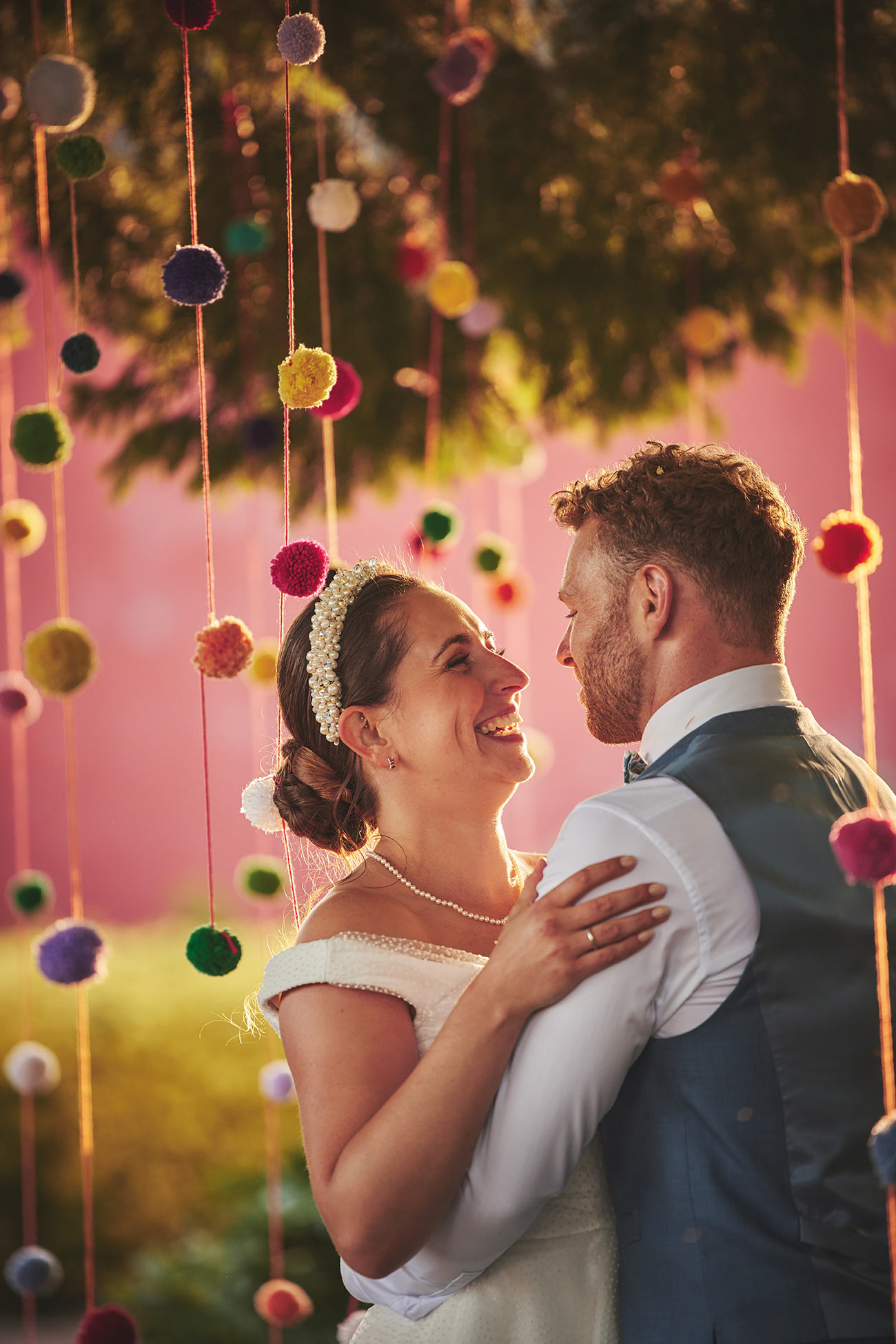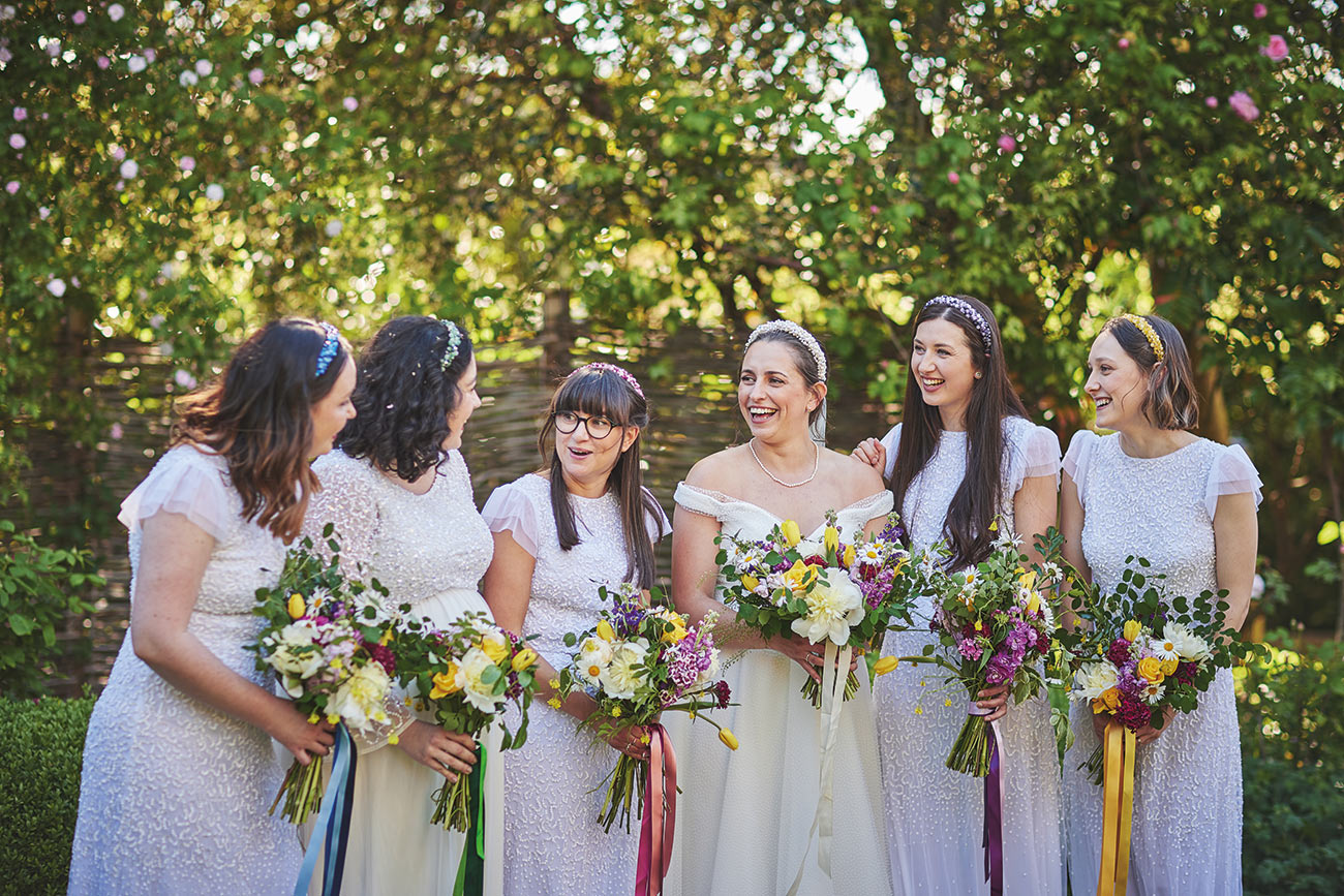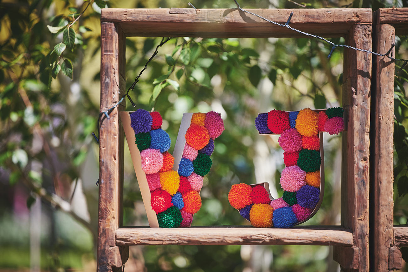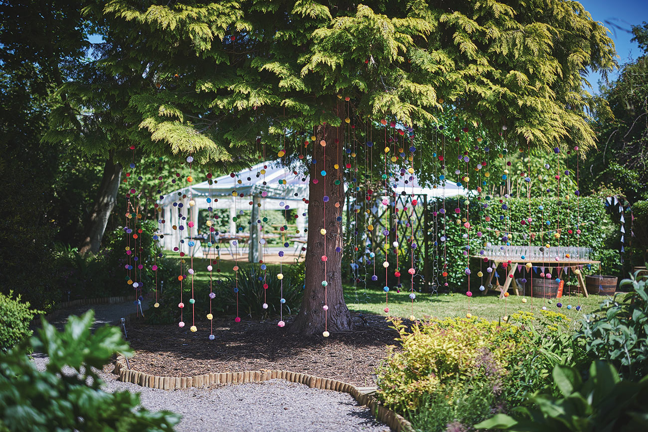 The picturesque setting inspired their bright and beautiful styling. “The garden is so full of colour, I wanted to reflect that in the rest of the day,” says Verity of the rainbow of colours that carried from the flowers and trailing ribbons of the bouquets to the signage and stationery. “We also made and hung hundreds of pom-poms from a large tree in the centre of the garden, and my final colourful DIY dream come true was draping ribbons from the marquee roof.”-
