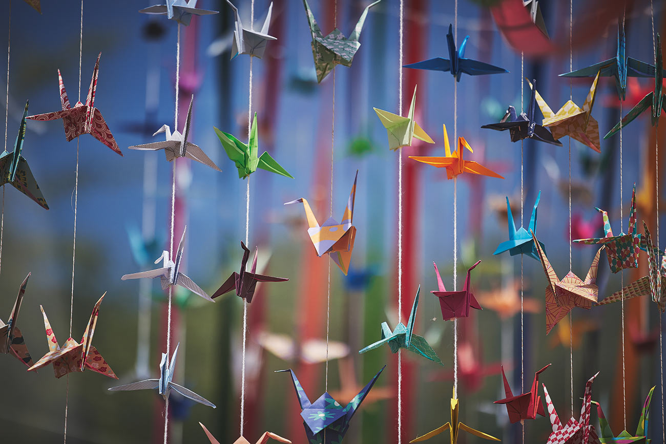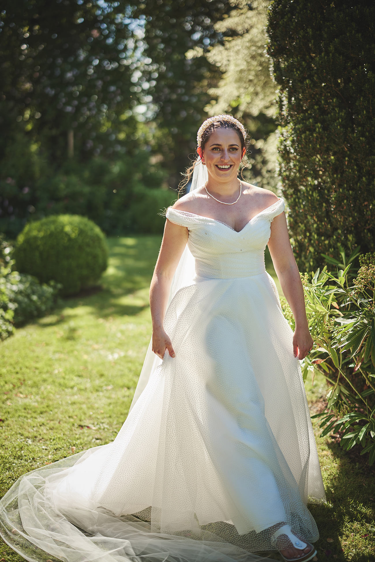 There were also nods to Japanese culture, with 1000 handmade origami cranes made by the couple and their mums hanging from the roof of the marquee. Continuing with the handcrafted theme, Verity made her own headband from freshwater pearls and crystal beads, as well as the bridesmaids’ headbands and men’s buttonholes, while she and her bridesmaids made their bouquets with flowers and foliage from the garden.-