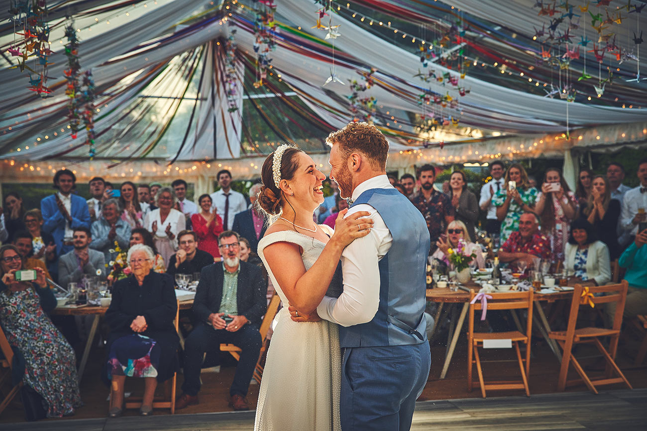 Getting legally married at the registry office a few days prior meant their friend Danny could be the ‘celebrant’ at the ceremony in front of a stunning wisteria walkway. After the vows, there were photos and garden games in the sunshine, before moving into the marquee for champagne and afternoon tea, while Verity’s bridesmaid Chess serenaded everyone. In the evening they cut the cake – made by James’ auntie – and had speeches, before the pizza and taco food vans arrived!