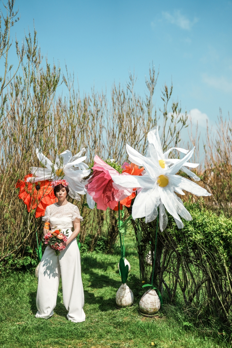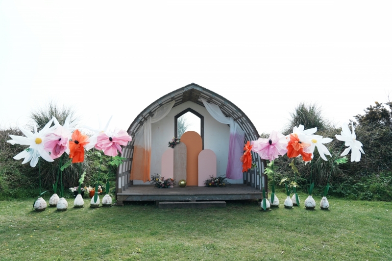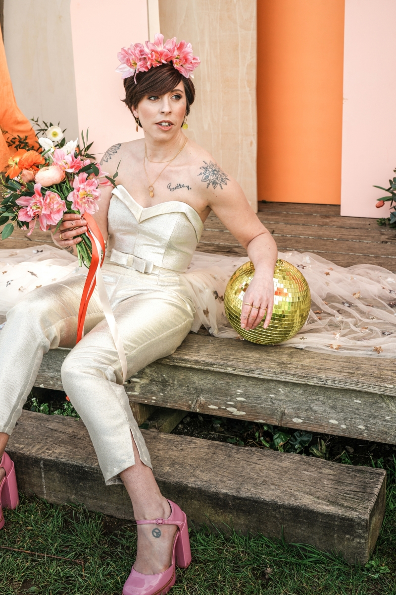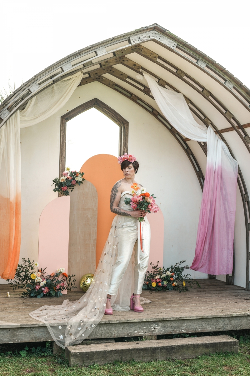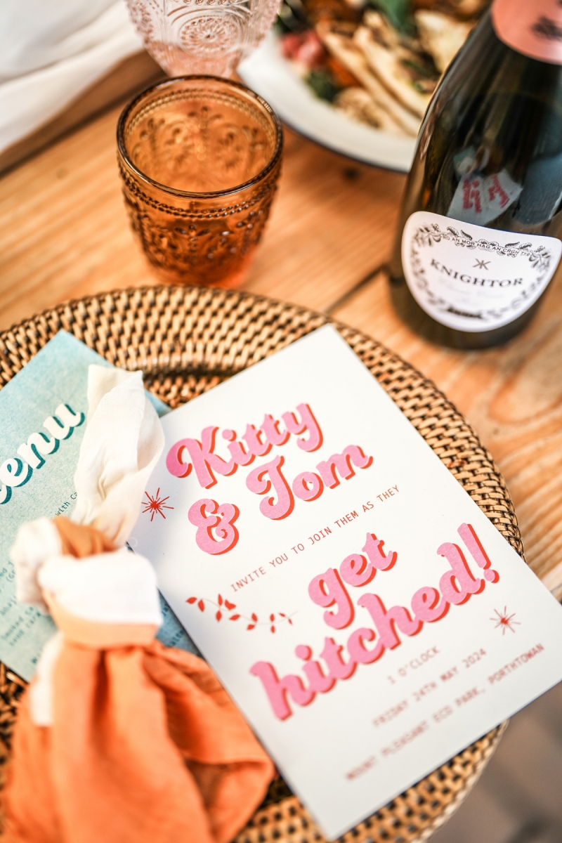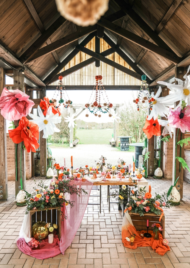 "Mount Pleasant Eco Park is wonderfully wild venue tucked away on the cliff tops of Porthtowan Cove, with a rustic, outdoorsy set up surrounded by rolling meadow fields and a cheeky seaview," she says. "We wanted rustic to clash with quirky! We captured the quirky elements of the venue and complimented them with bright shades of orange and pink, embracing nature in all its colour!"