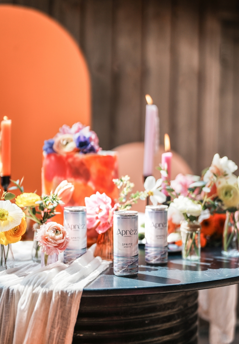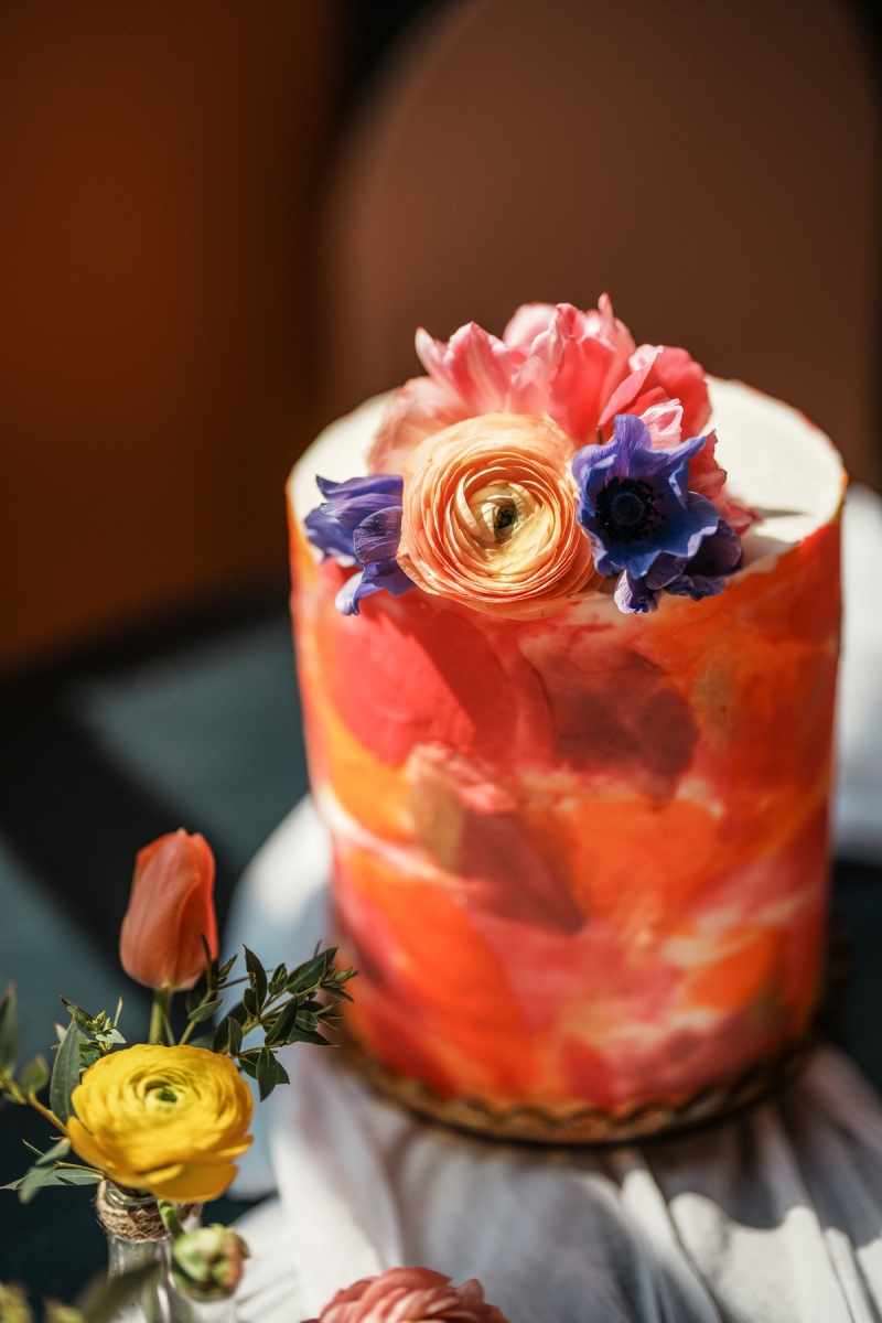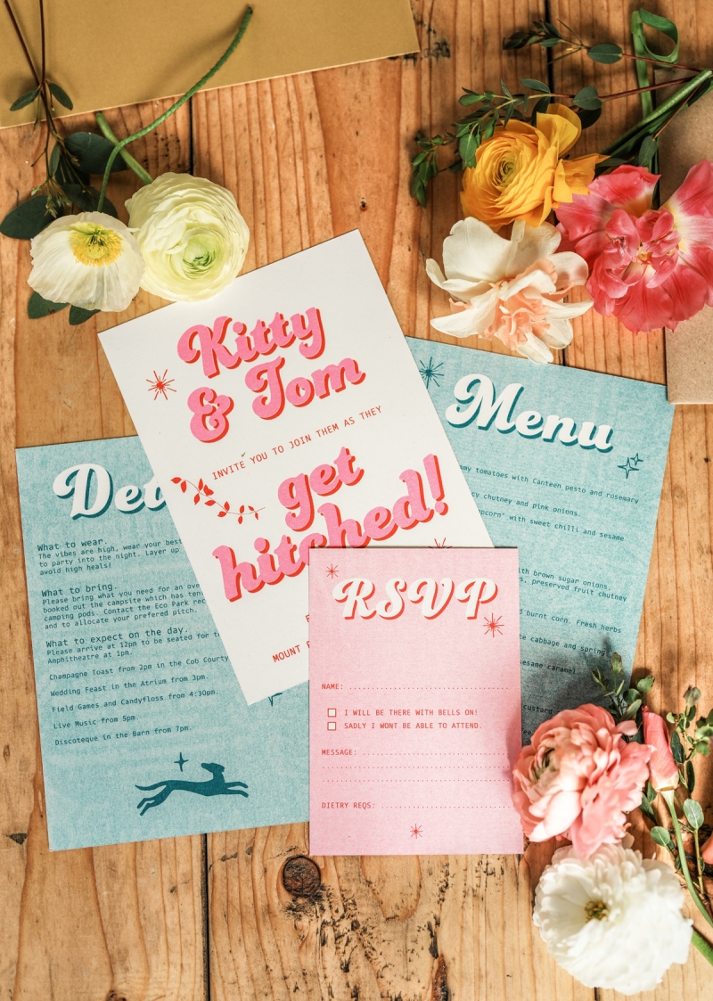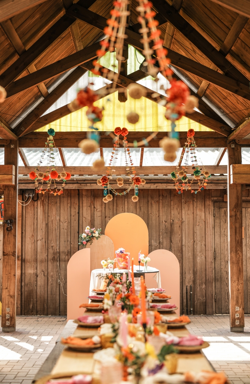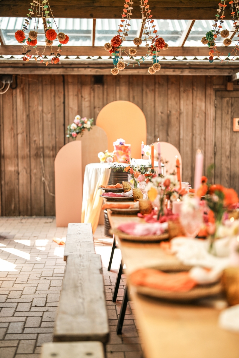 "Mount Pleasant Eco Park is wonderfully wild venue tucked away on the cliff tops of Porthtowan Cove, with a rustic, outdoorsy set up surrounded by rolling meadow fields and a cheeky seaview," she says. "We wanted rustic to clash with quirky! We captured the quirky elements of the venue and complimented them with bright shades of orange and pink, embracing nature in all its colour!"