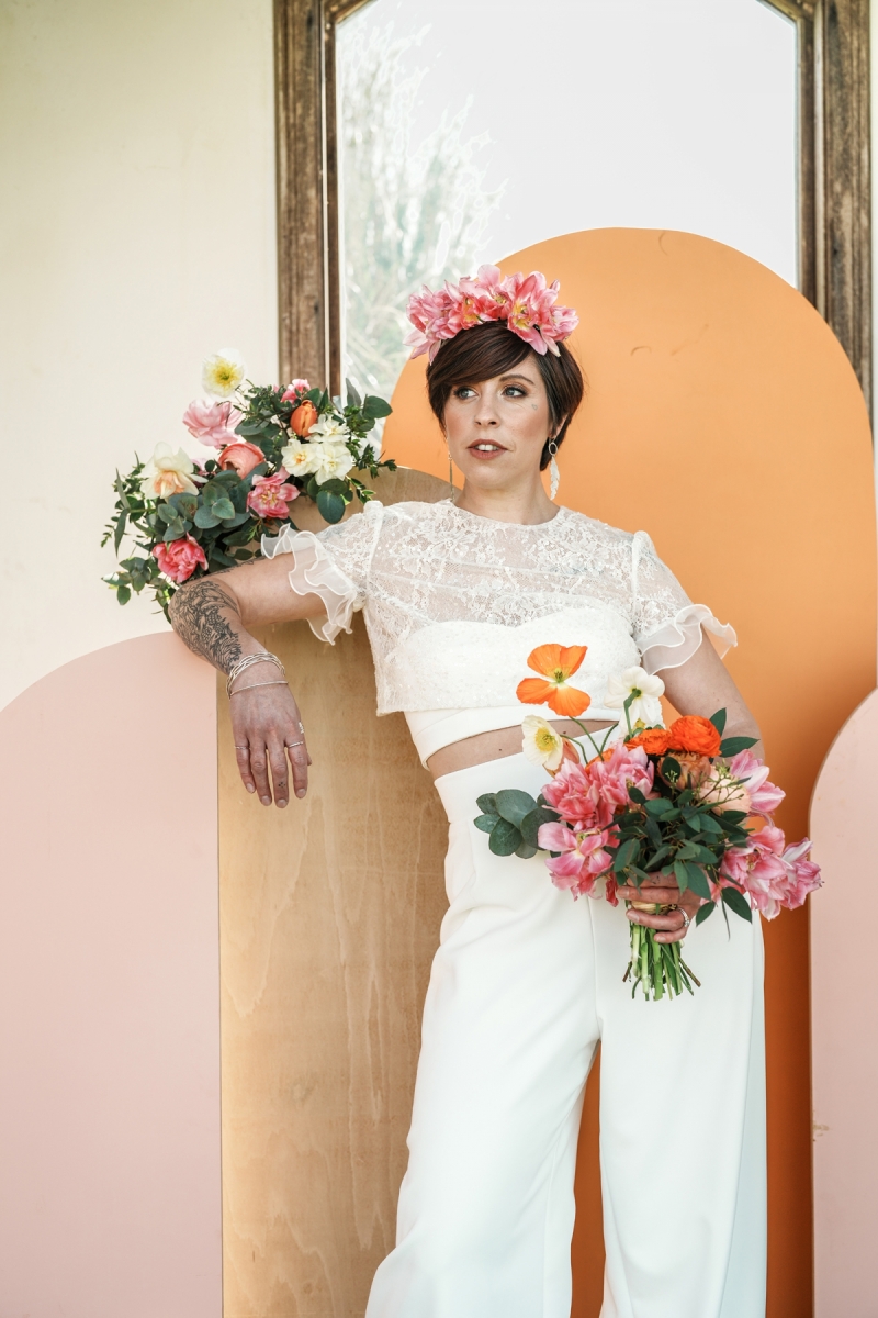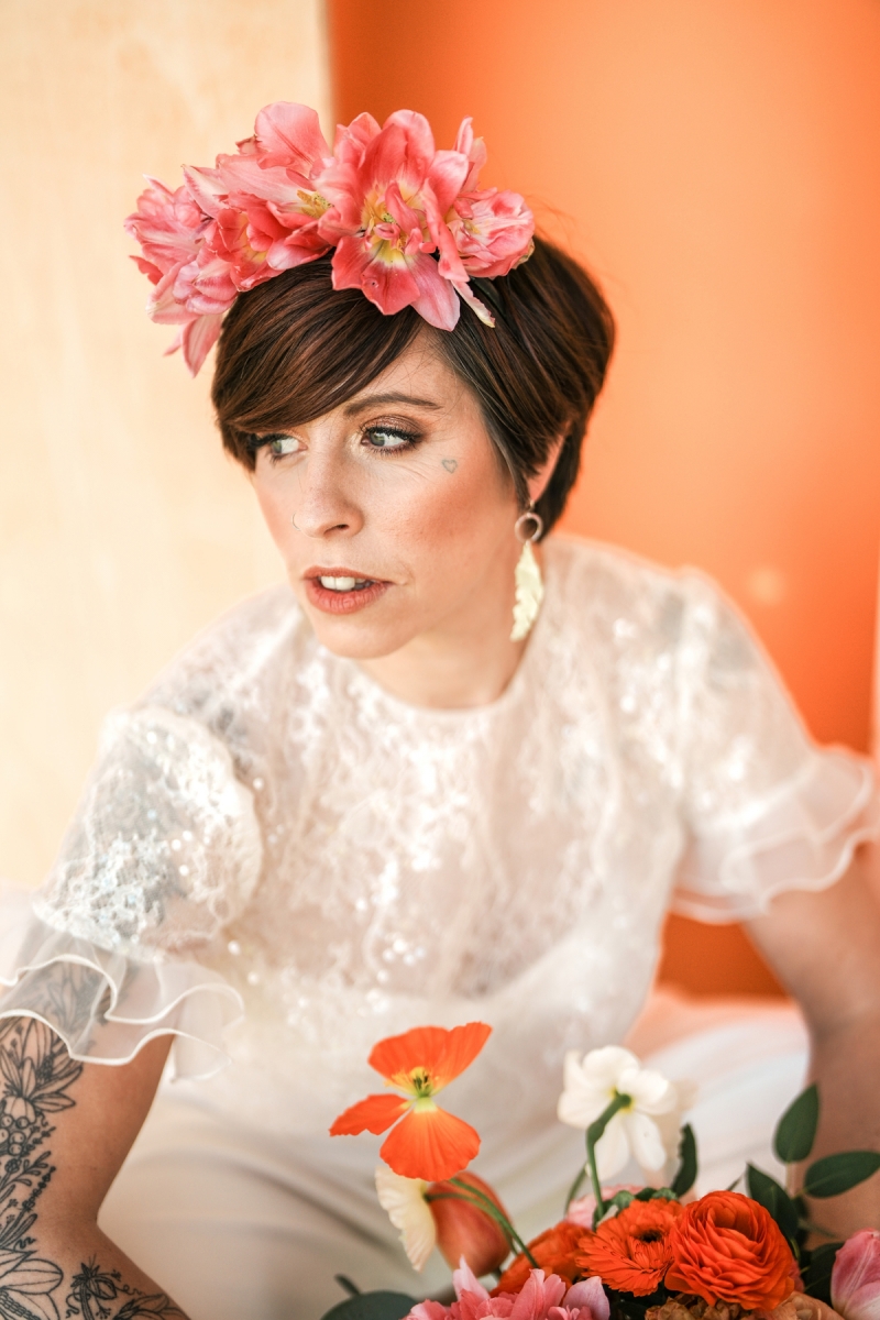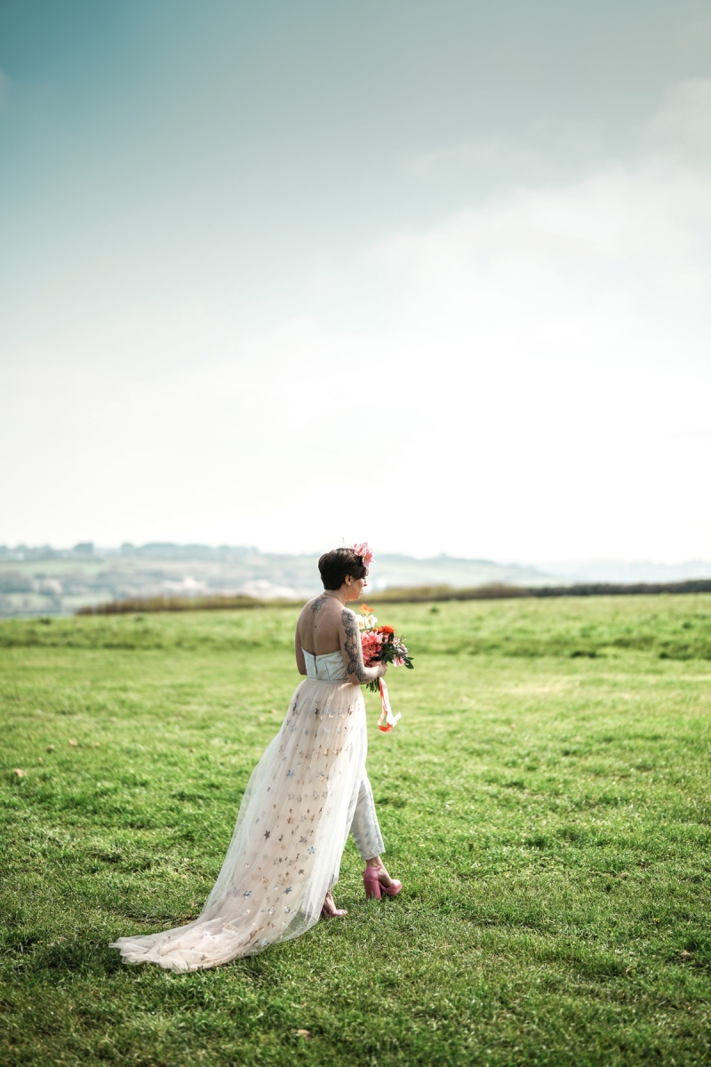 "The concept of the shoot was 'colour clash', using orange and pink as our primary colours throughout," says Sally from Roaming Souls Photography. "We wanted to create a contrast; with something loud, but complementary of the beautiful setting surrounding us in Porthtowan."
