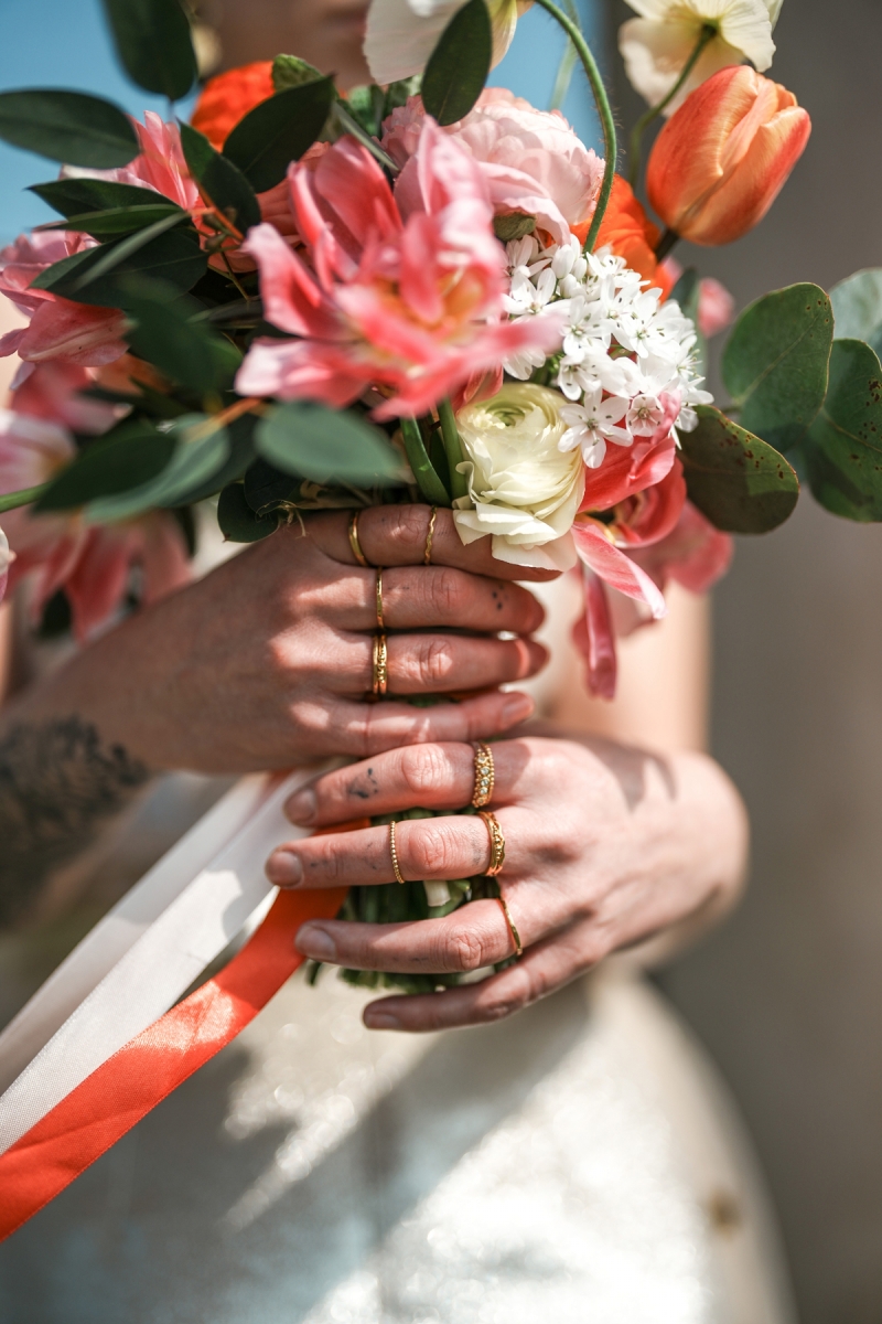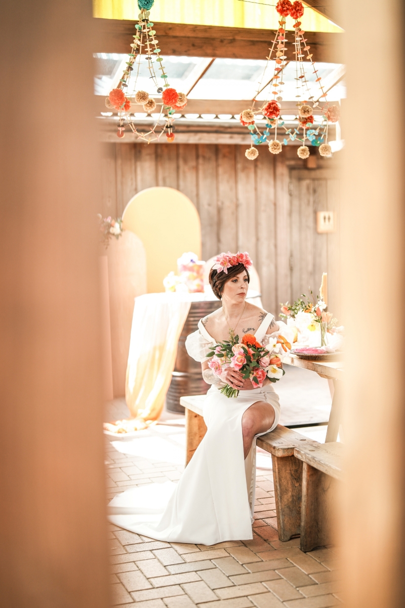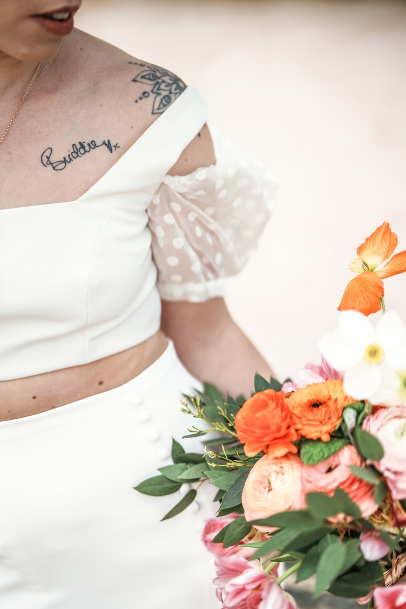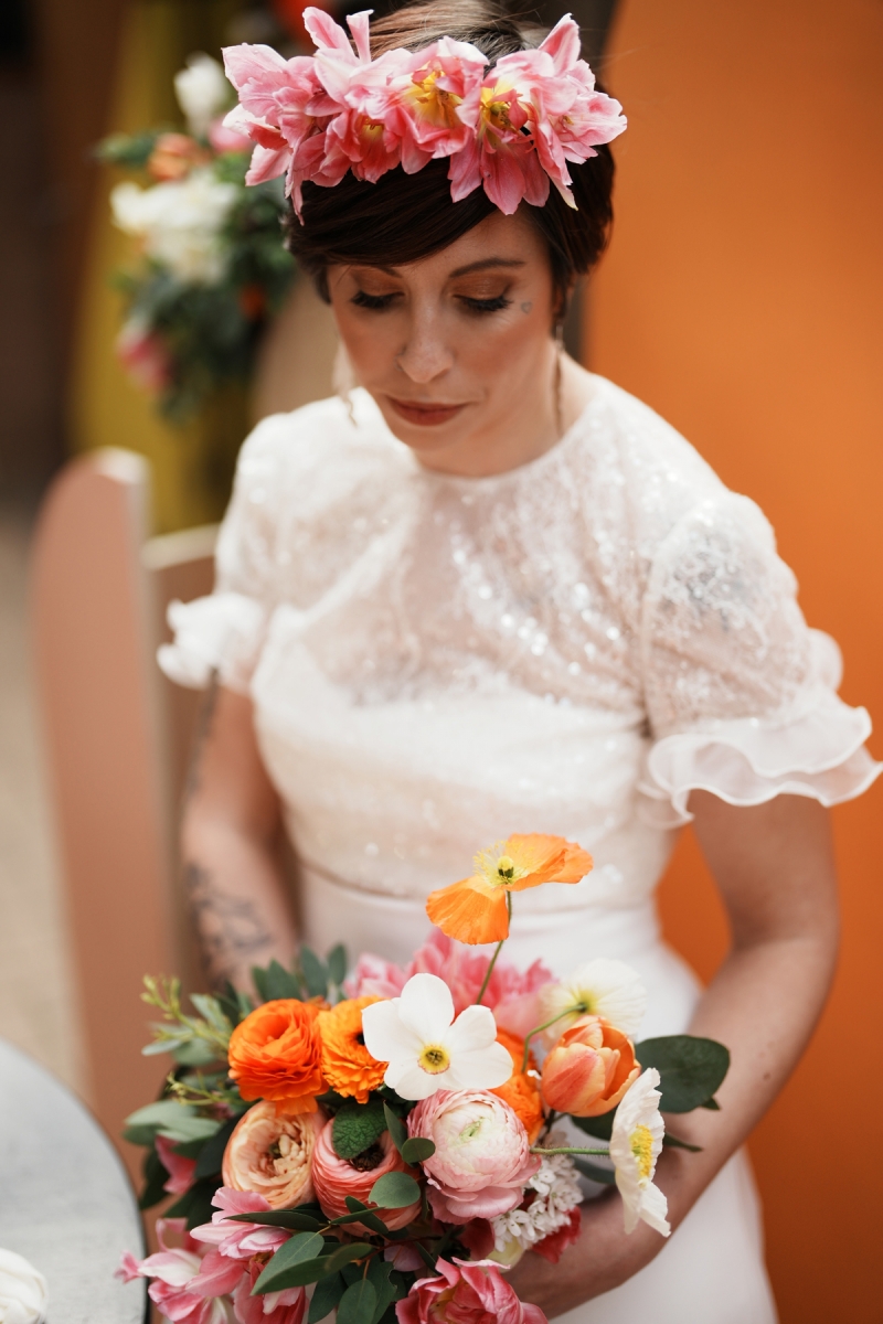 "The concept of the shoot was 'colour clash', using orange and pink as our primary colours throughout," says Sally from Roaming Souls Photography. "We wanted to create a contrast; with something loud, but complementary of the beautiful setting surrounding us in Porthtowan."