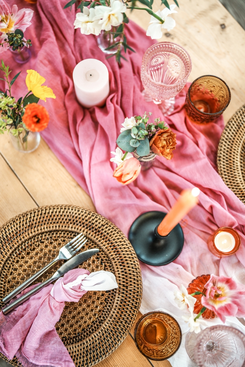 From the petal-pretty wedding cake adorned with fresh blooms to the abundance of floristry in a rainbow of hues, every detail is a riot of colour to create the most vibrant, sensorial scene. The bridal bouquet and flower crown both complete and contrast with the ensembles: beautifully layered confections of bralette, pants, crop top, sheer topper and star-embroidered overskirt, which all accentuate the boho, playful vibe of the editorial.