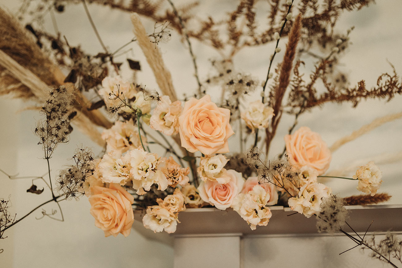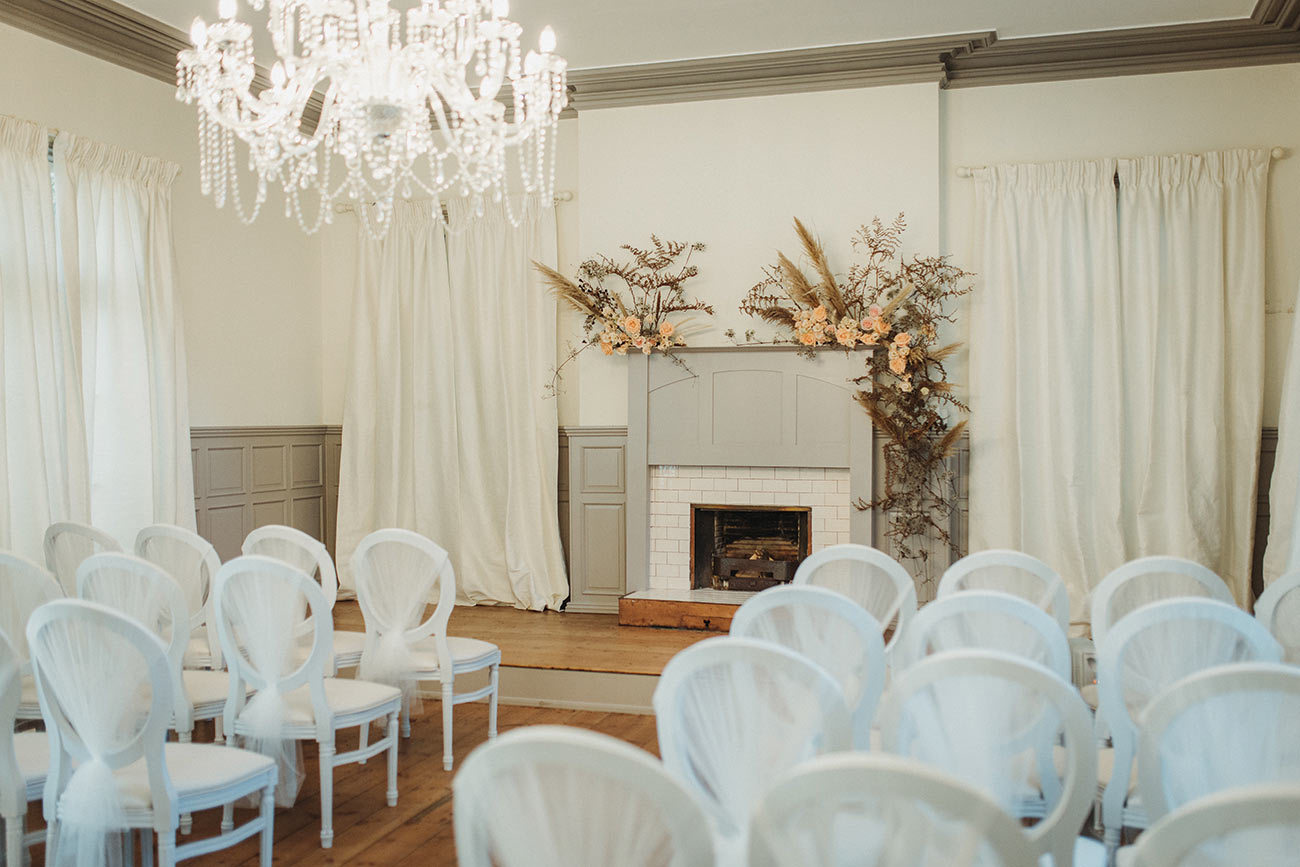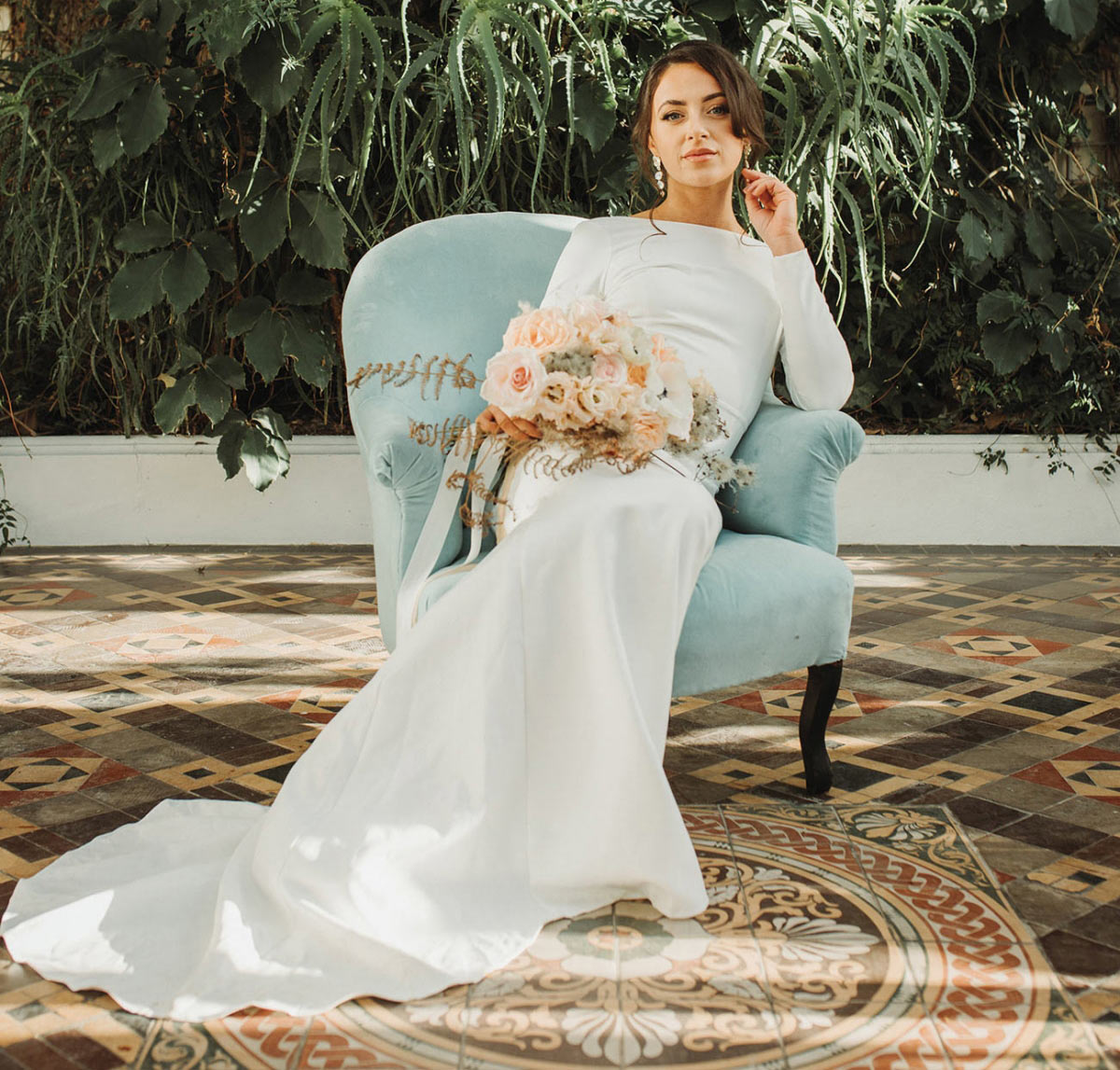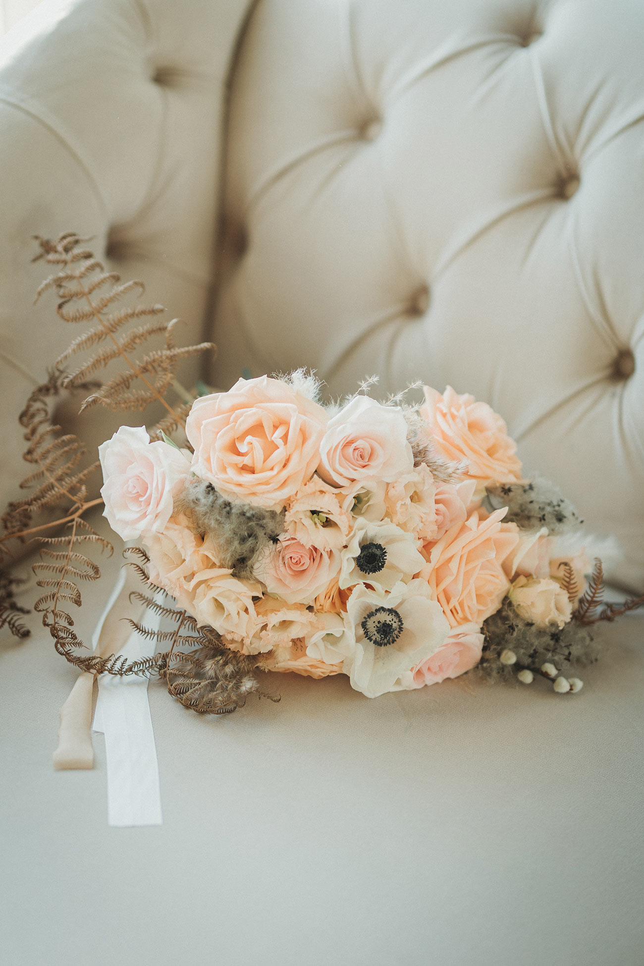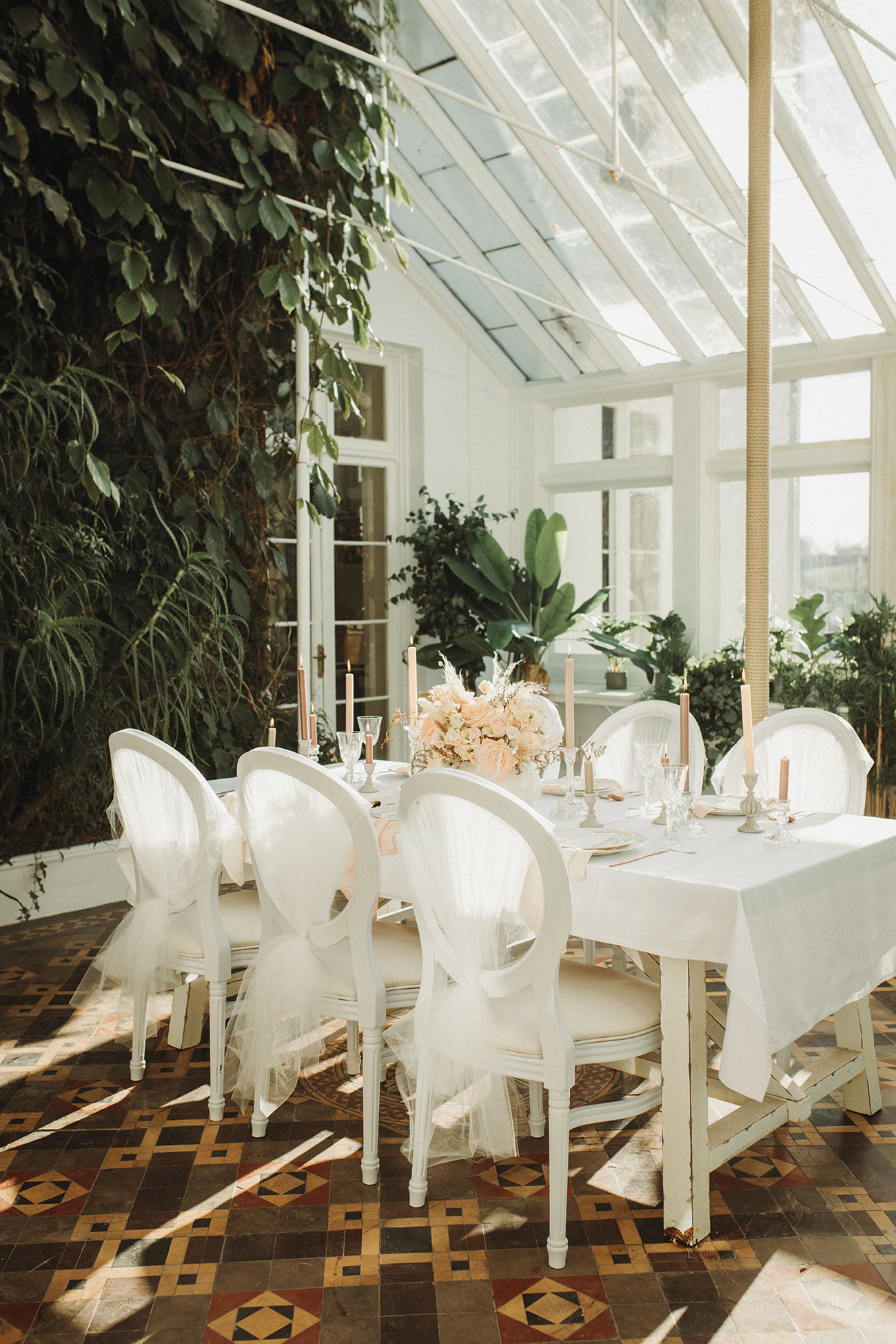 A sleek bridal gown, creamy blooms in soft shades of pink and peach, and details dotted with pearls and accented with gold – the classic-contemporary mood of this romantic styled shoot is perfectly in keeping with its setting: the Georgian climes of Polstrong Manor. From the bridal suite and drawing room to the orangery bathed in natural light, the house has been lovingly restored to create an elegant setting for a modern wedding while embracing its historic character.