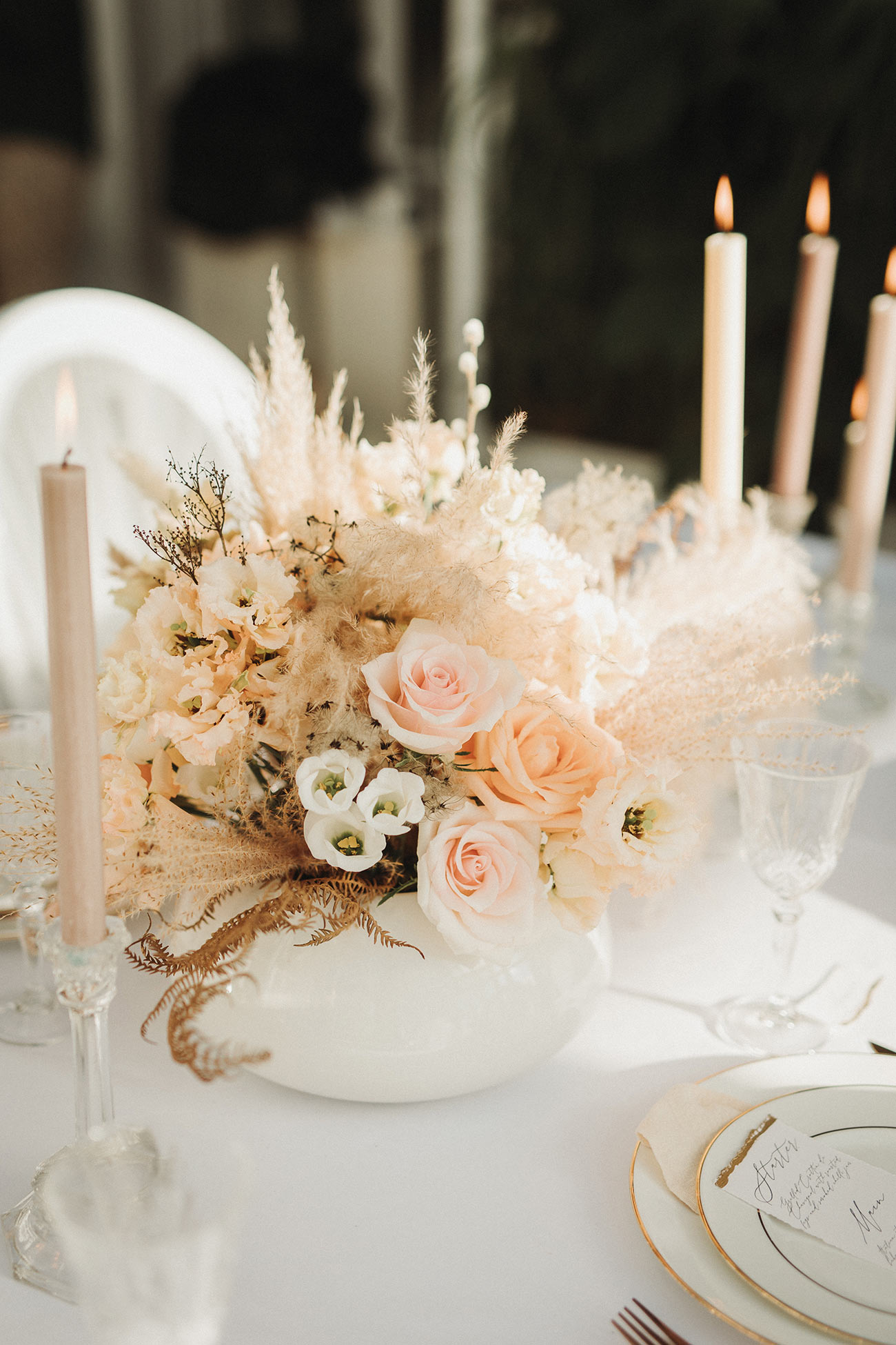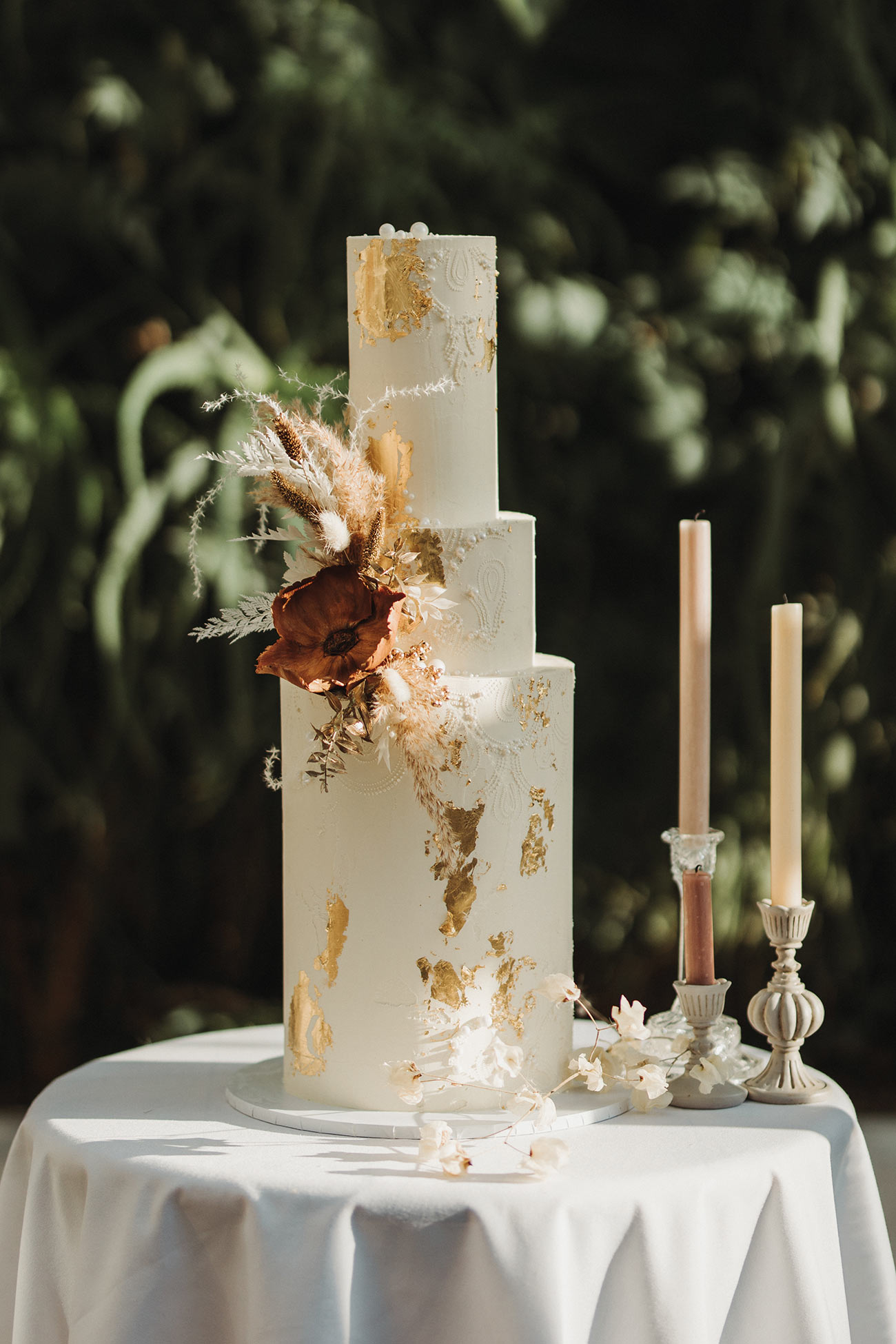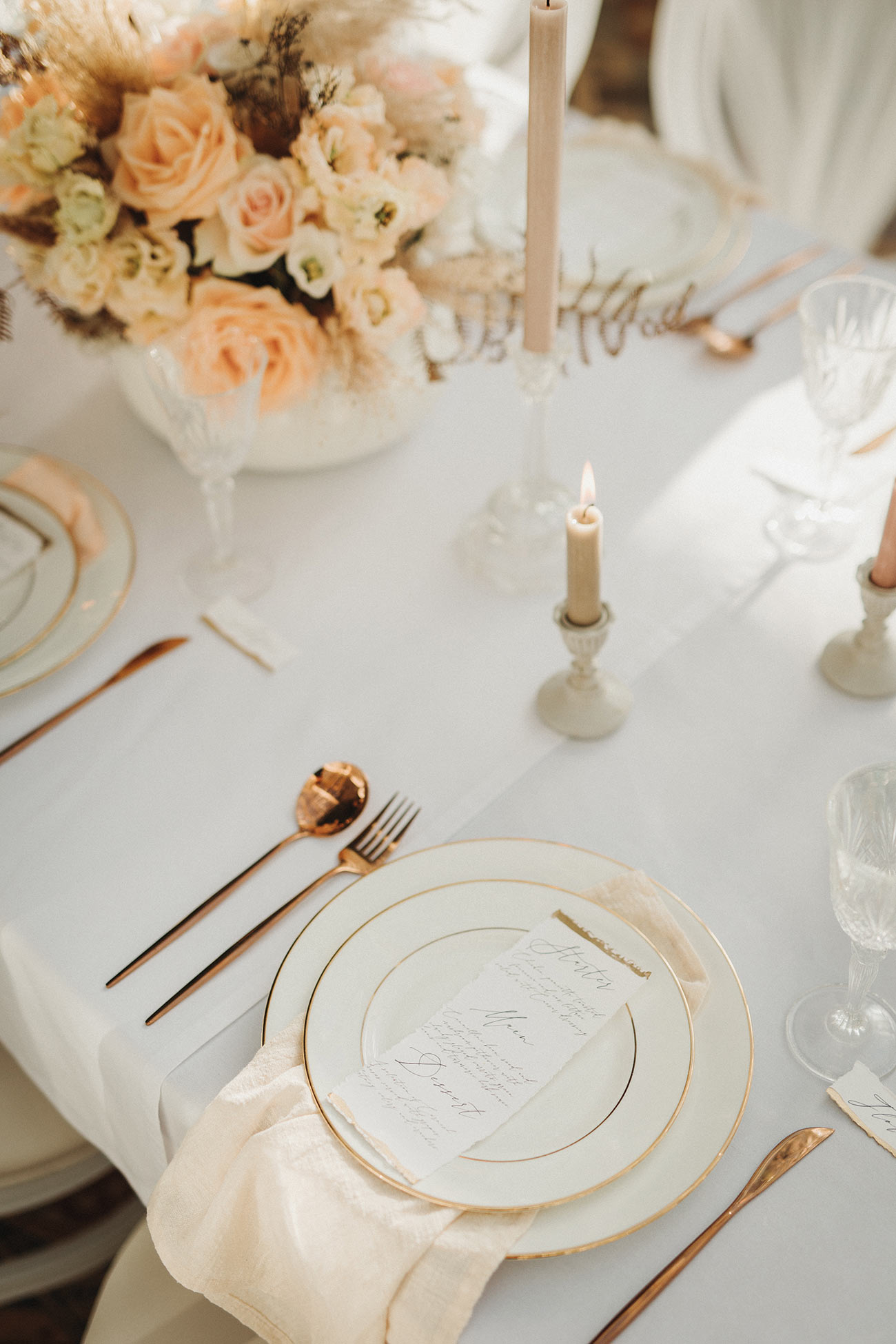 The delicate blush and peach flowers bring dreamy texture to the tablescape, the ferns blending beautifully with the taupe candles and copper tones of the cutlery. Gold accents are woven throughout, from the rims of the plates to the stationery and cake, the intricately iced tiers adorned with gold leaf and dainty pearls.