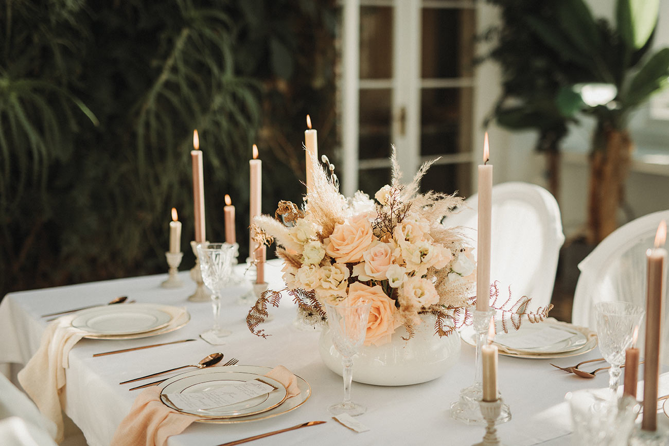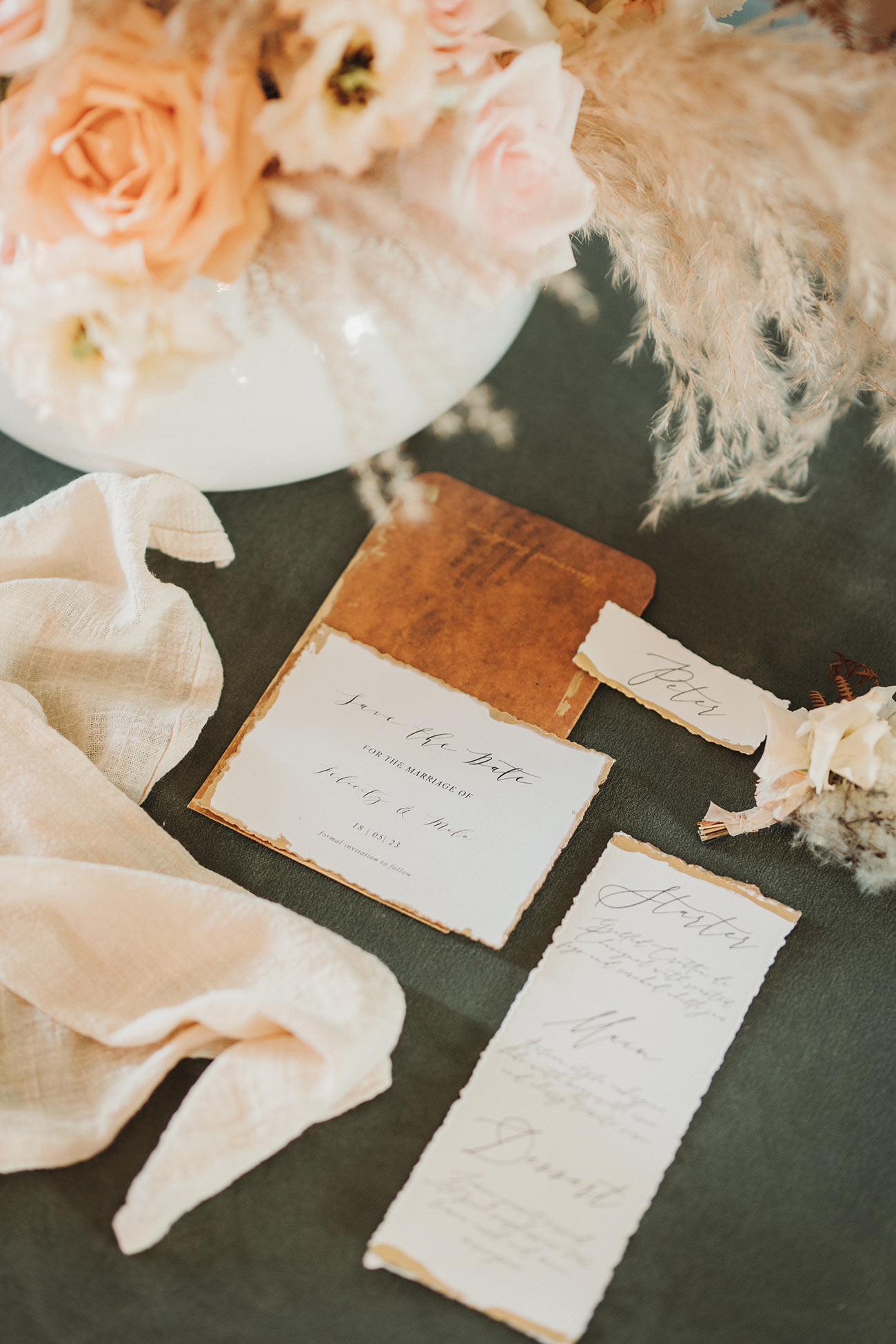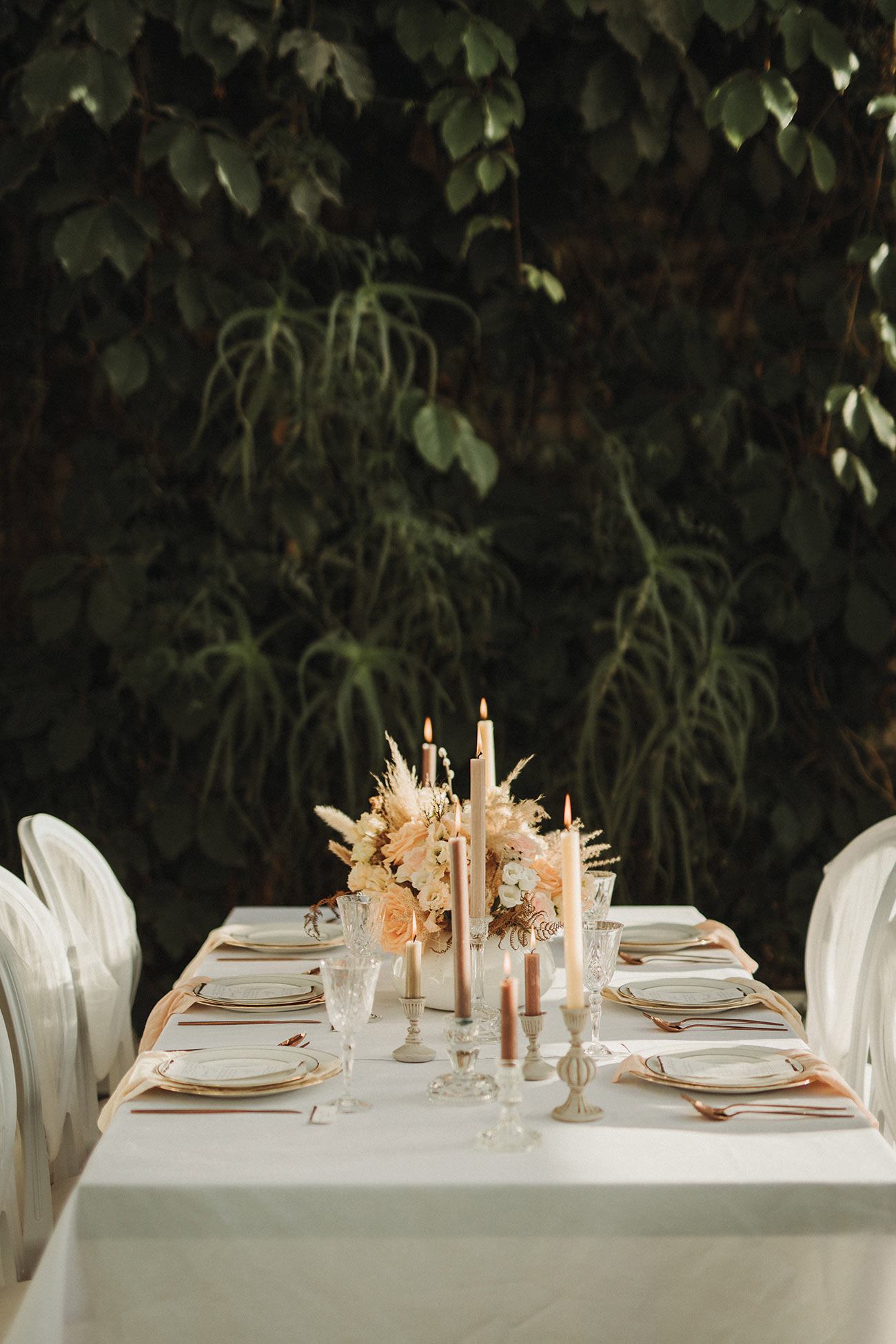 The delicate blush and peach flowers bring dreamy texture to the tablescape, the ferns blending beautifully with the taupe candles and copper tones of the cutlery. Gold accents are woven throughout, from the rims of the plates to the stationery and cake, the intricately iced tiers adorned with gold leaf and dainty pearls.