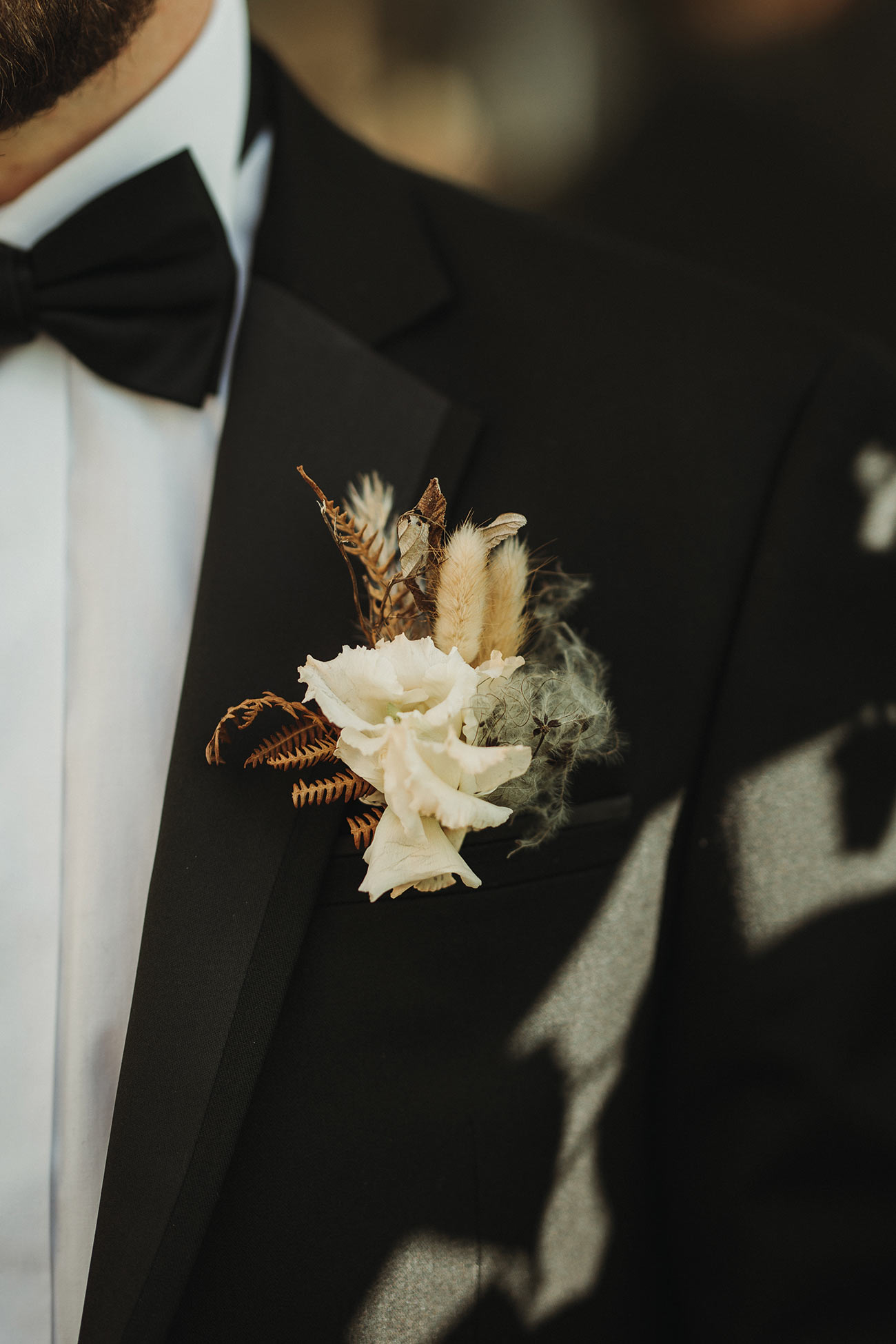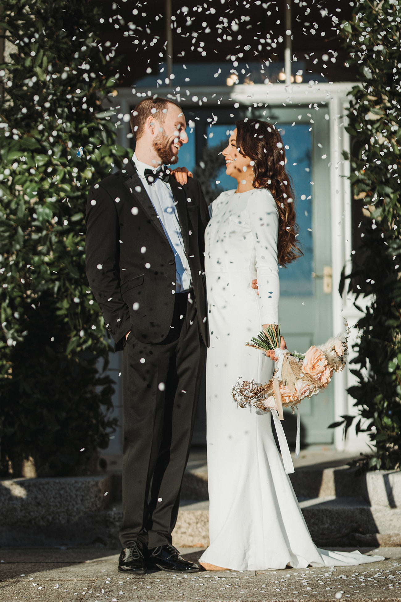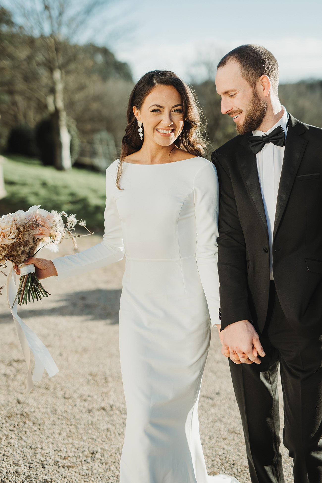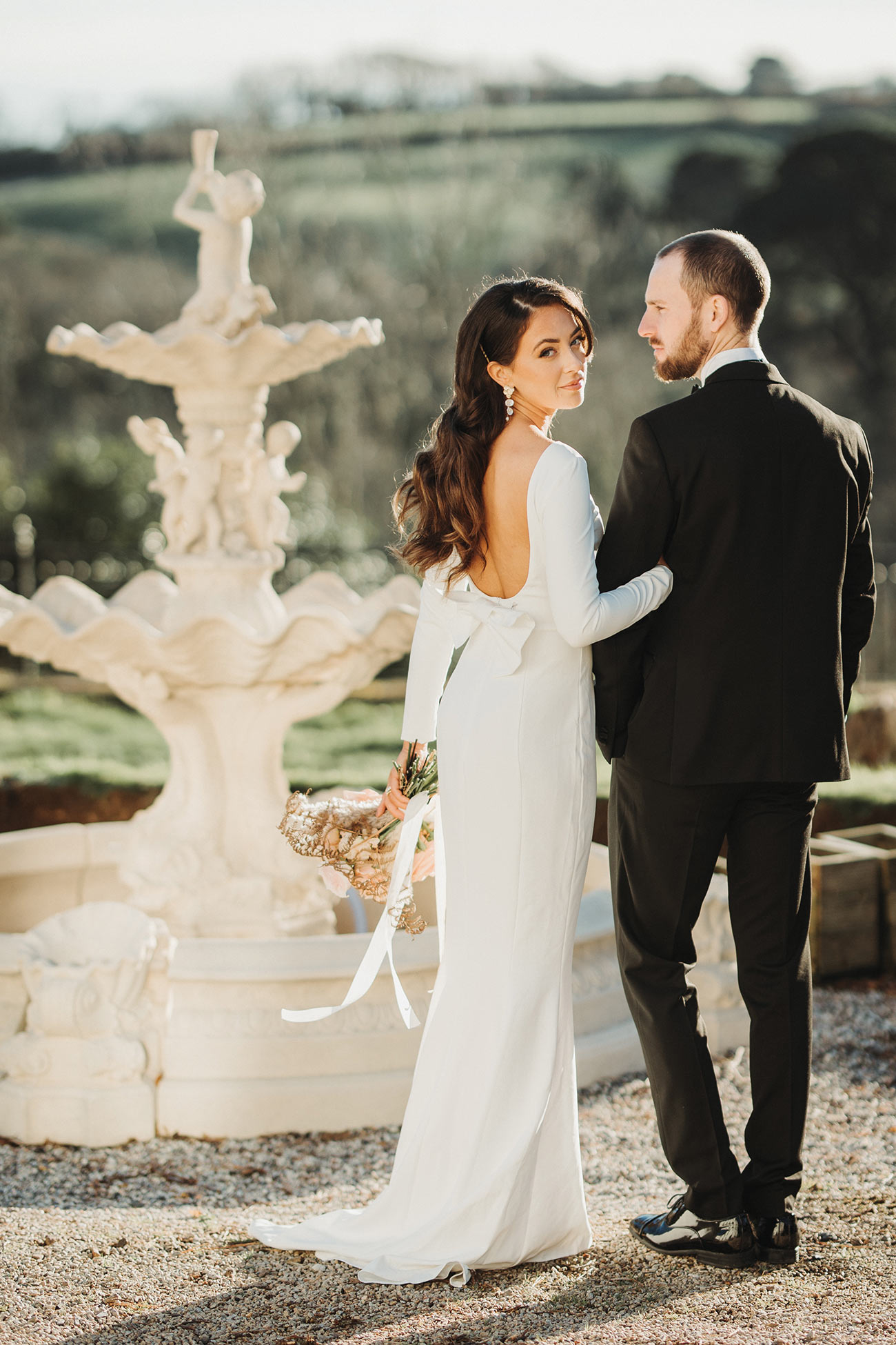 The bride and groom carry the aesthetic perfectly: the minimalist gown with its statement back bow is modern yet timeless, while the textured updo and glossy waves epitomise modern glamour. Pairing perfectly with his bride, the groom dons a sharp black-tie ensemble, the dried flowers of his buttonhole a subtle nod to current trends.