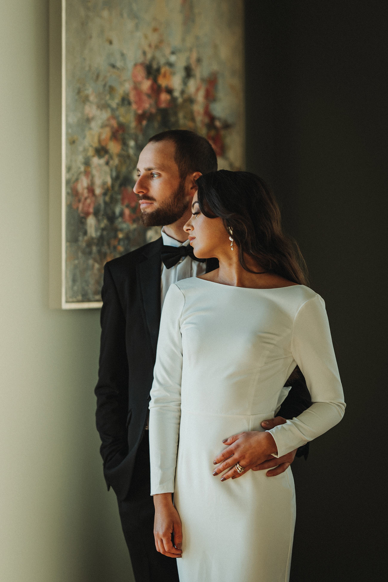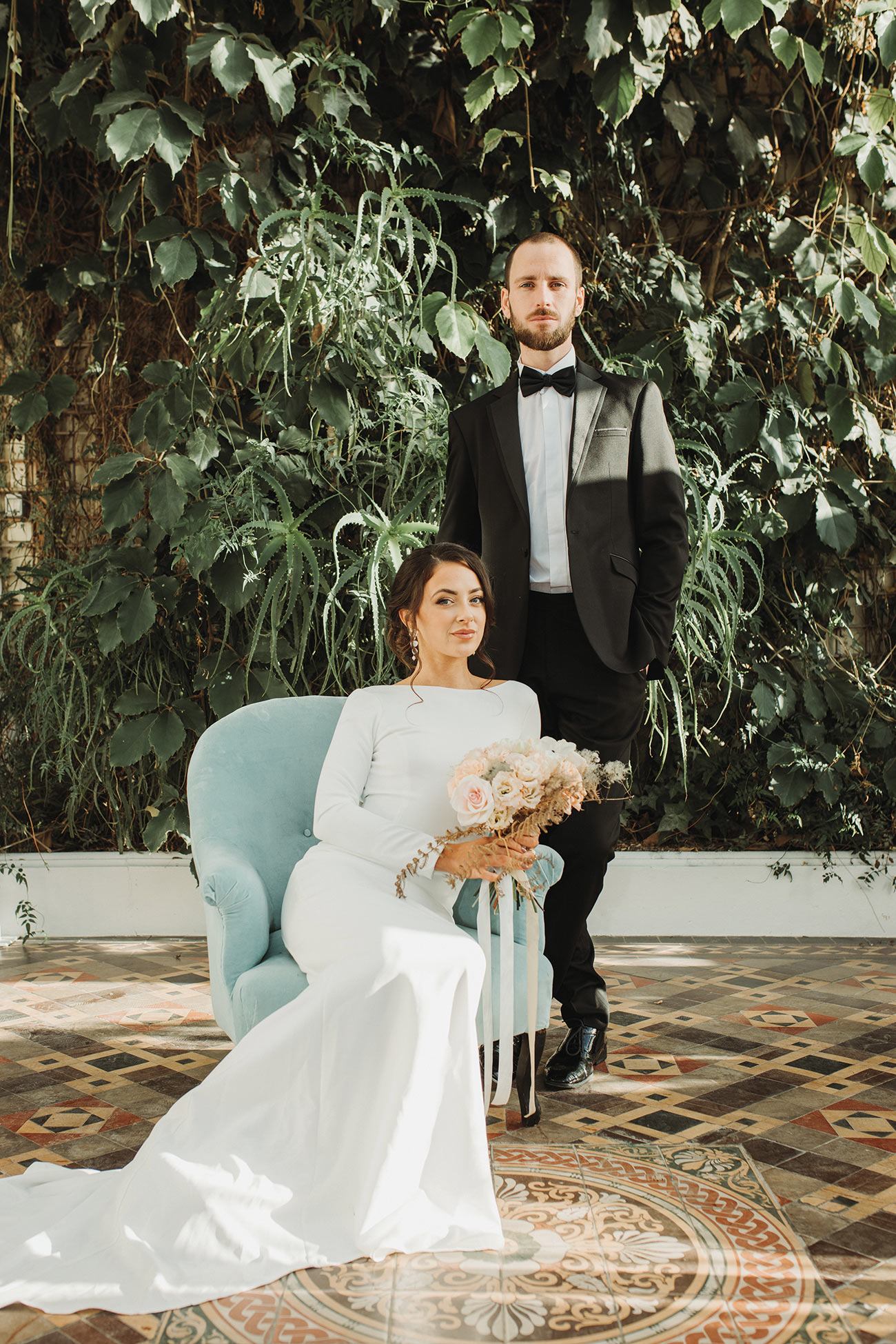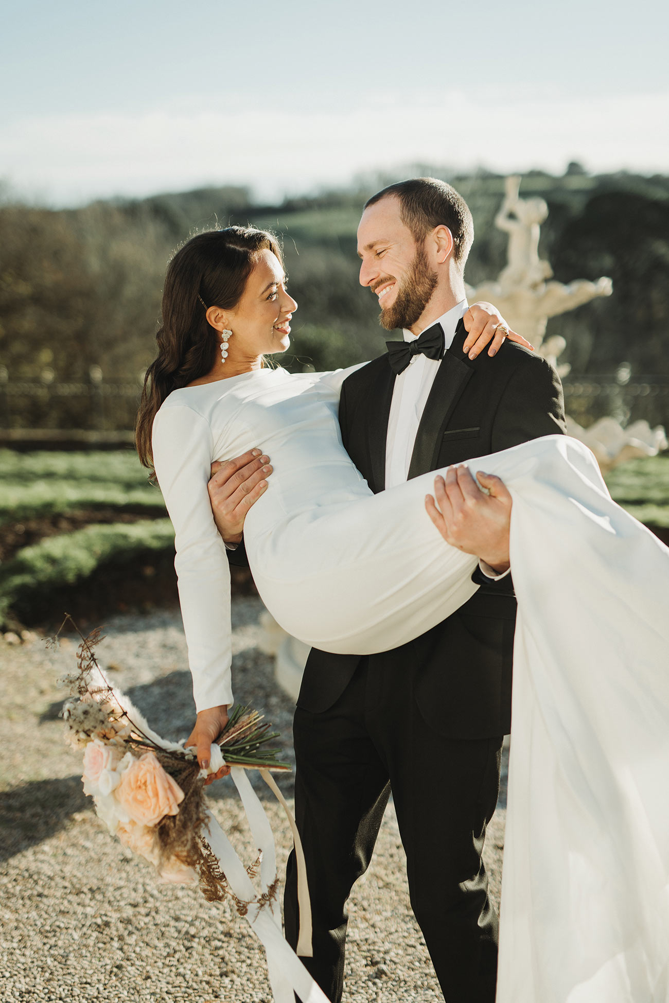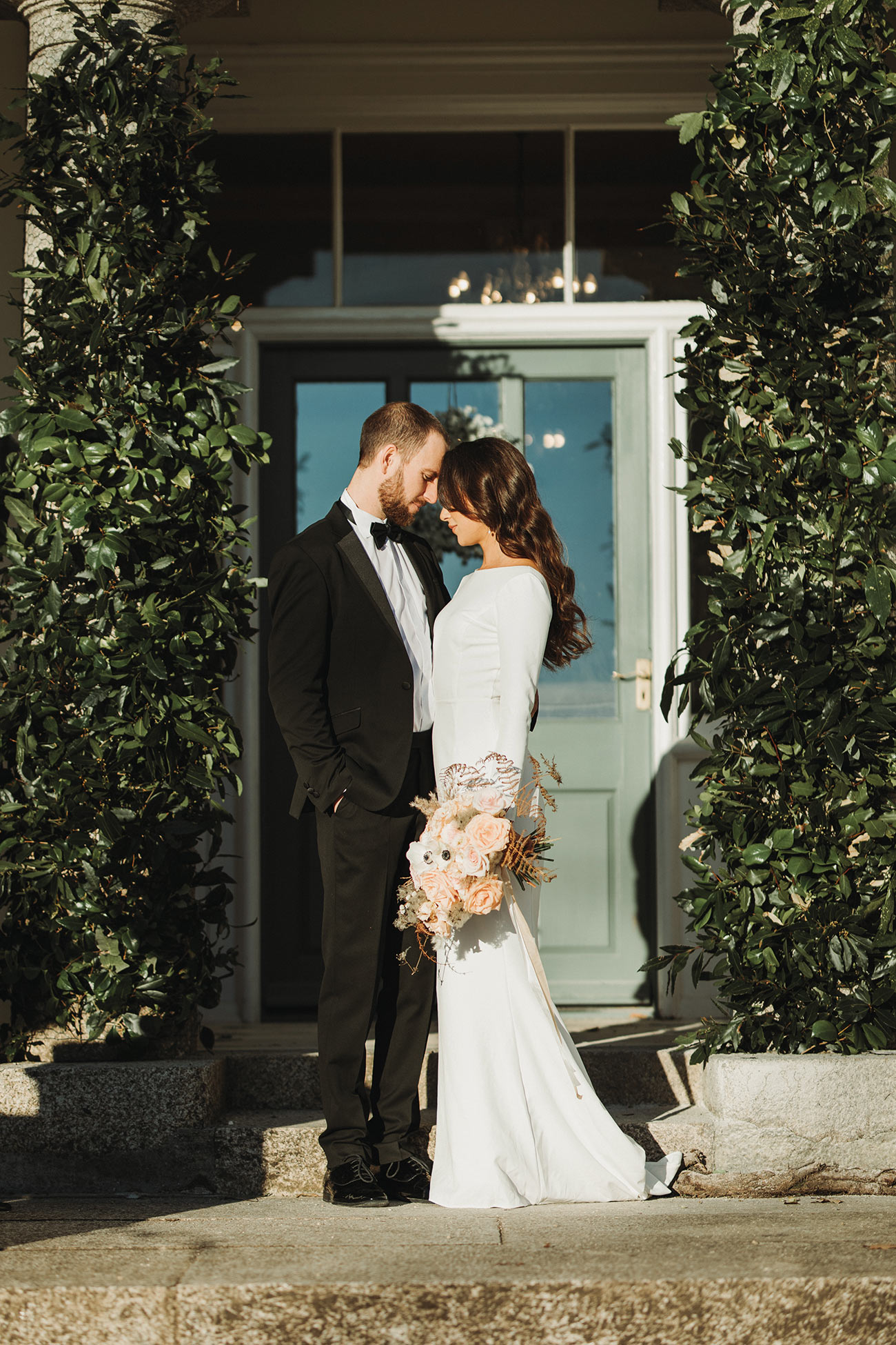 The bride and groom carry the aesthetic perfectly: the minimalist gown with its statement back bow is modern yet timeless, while the textured updo and glossy waves epitomise modern glamour. Pairing perfectly with his bride, the groom dons a sharp black-tie ensemble, the dried flowers of his buttonhole a subtle nod to current trends.