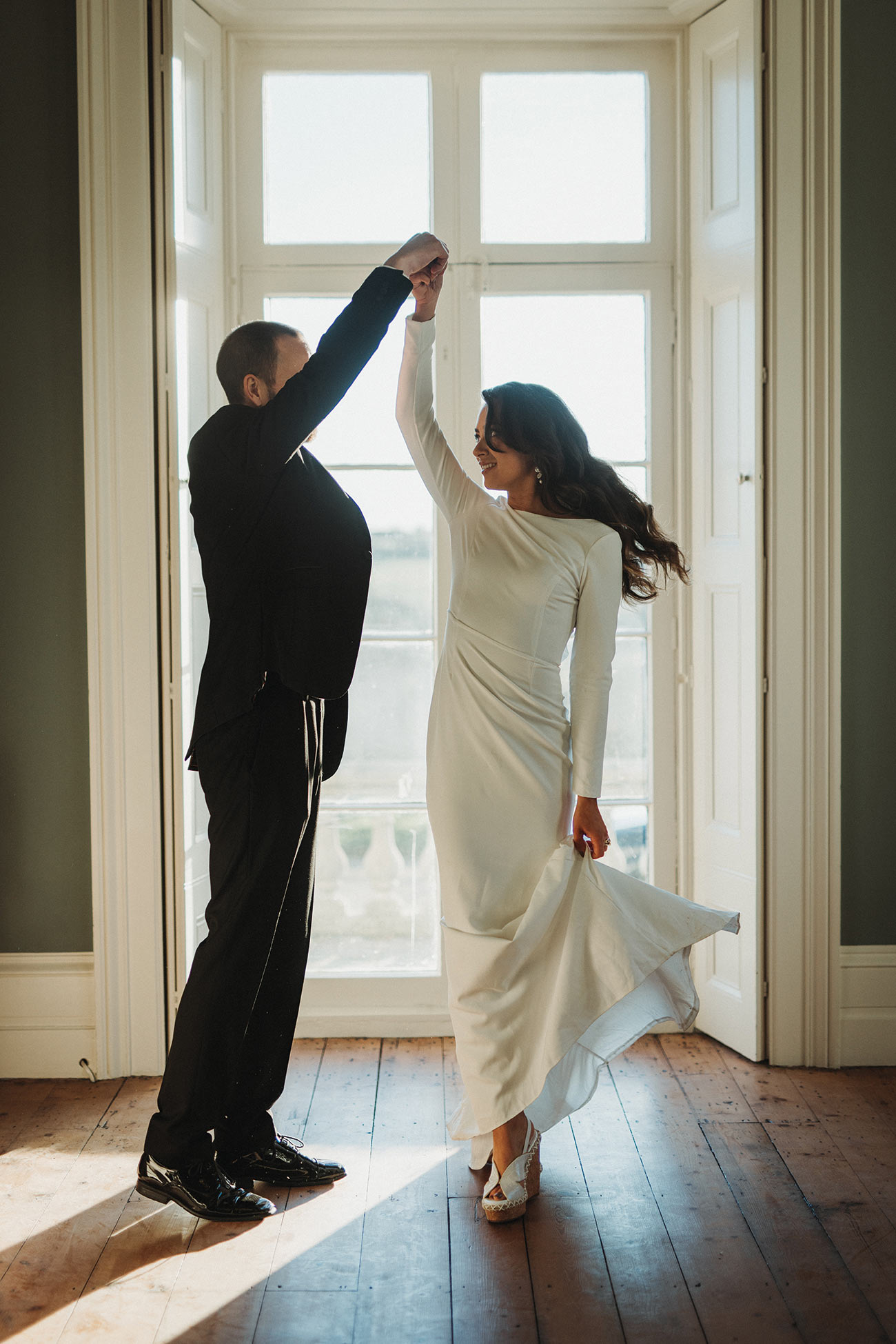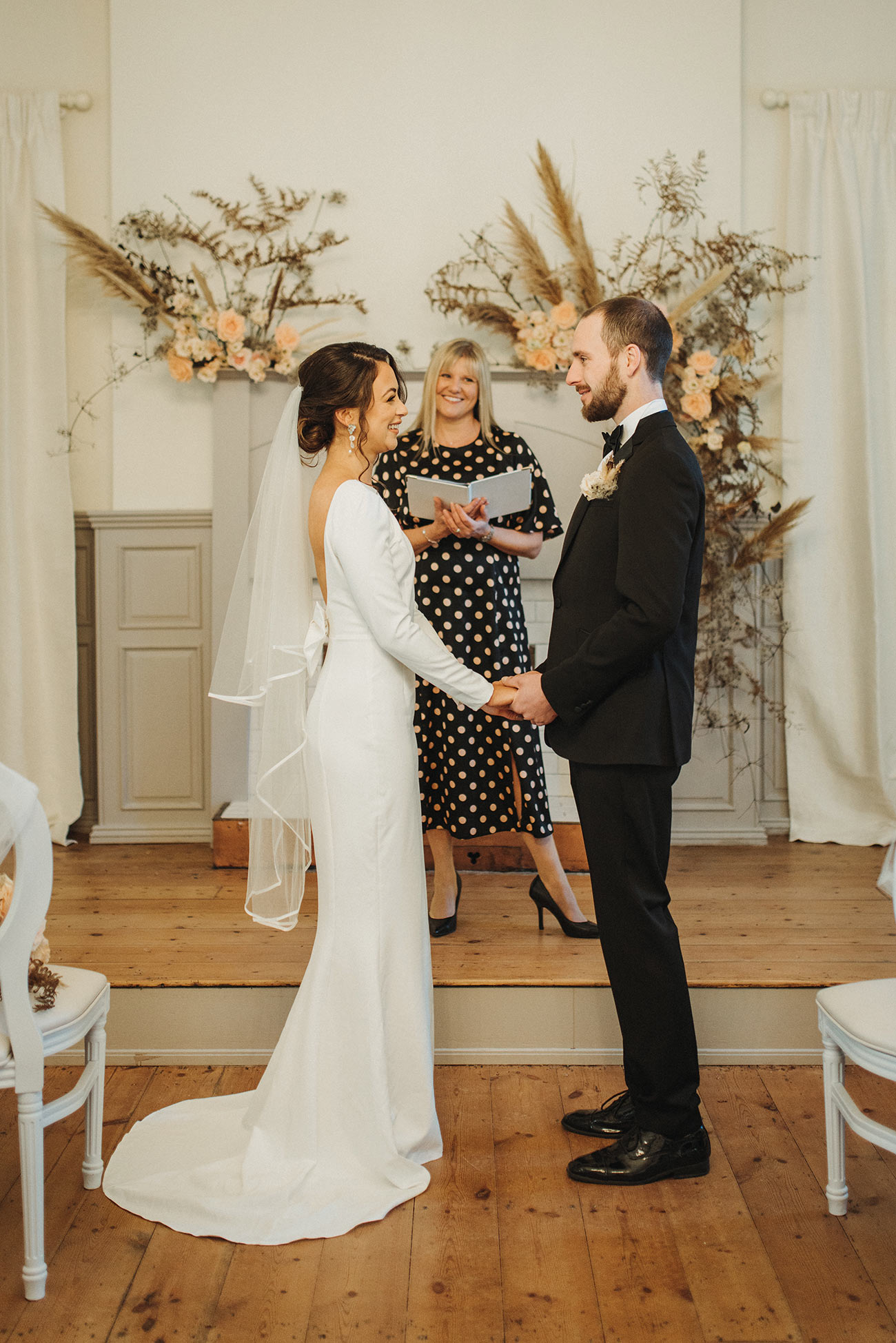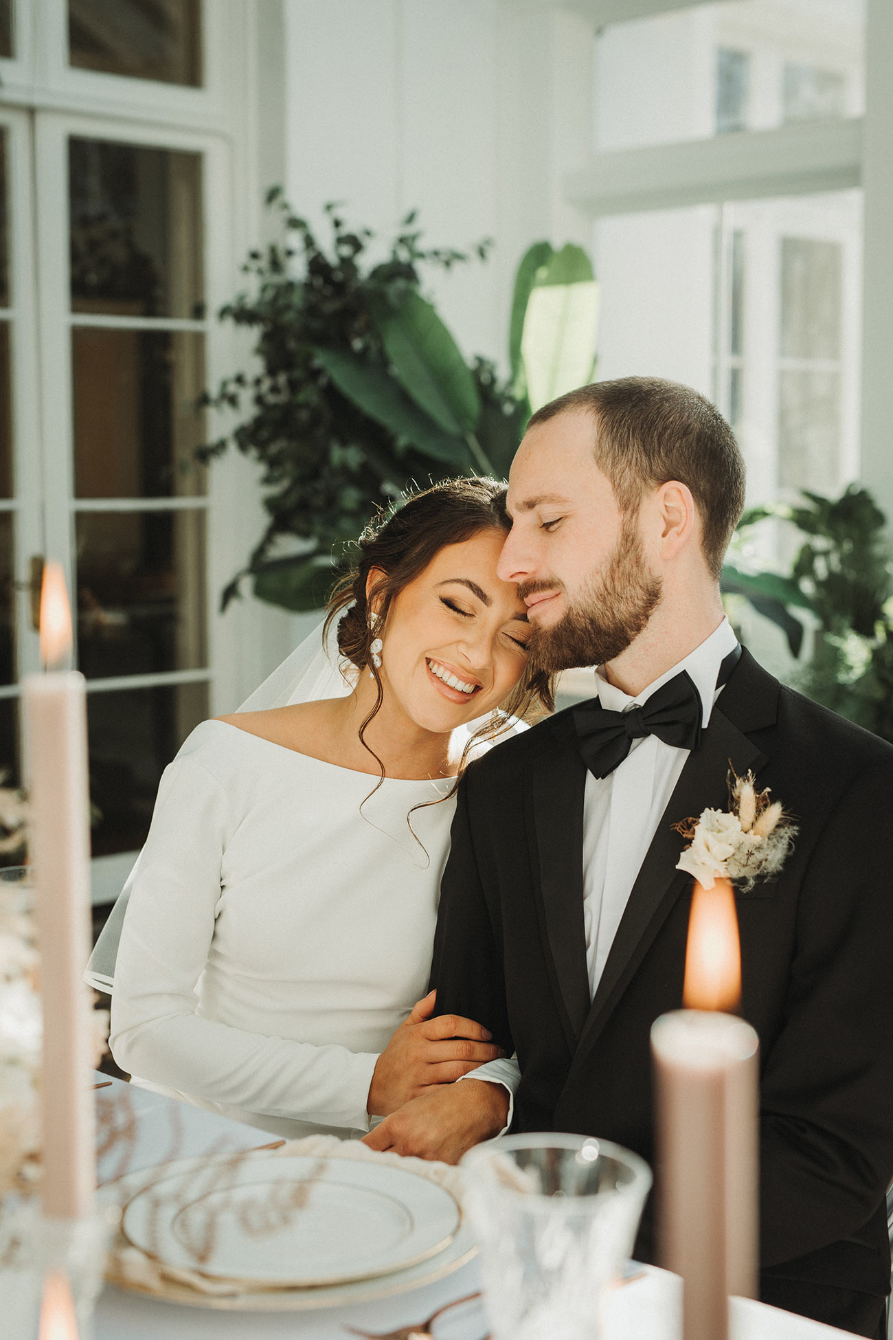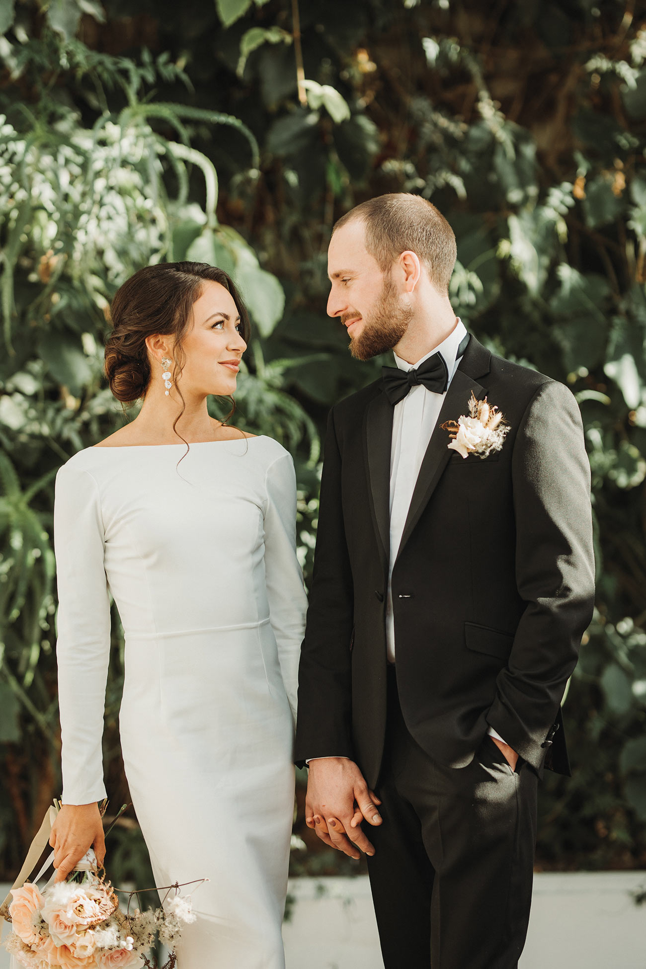 The bride and groom carry the aesthetic perfectly: the minimalist gown with its statement back bow is modern yet timeless, while the textured updo and glossy waves epitomise modern glamour. Pairing perfectly with his bride, the groom dons a sharp black-tie ensemble, the dried flowers of his buttonhole a subtle nod to current trends.