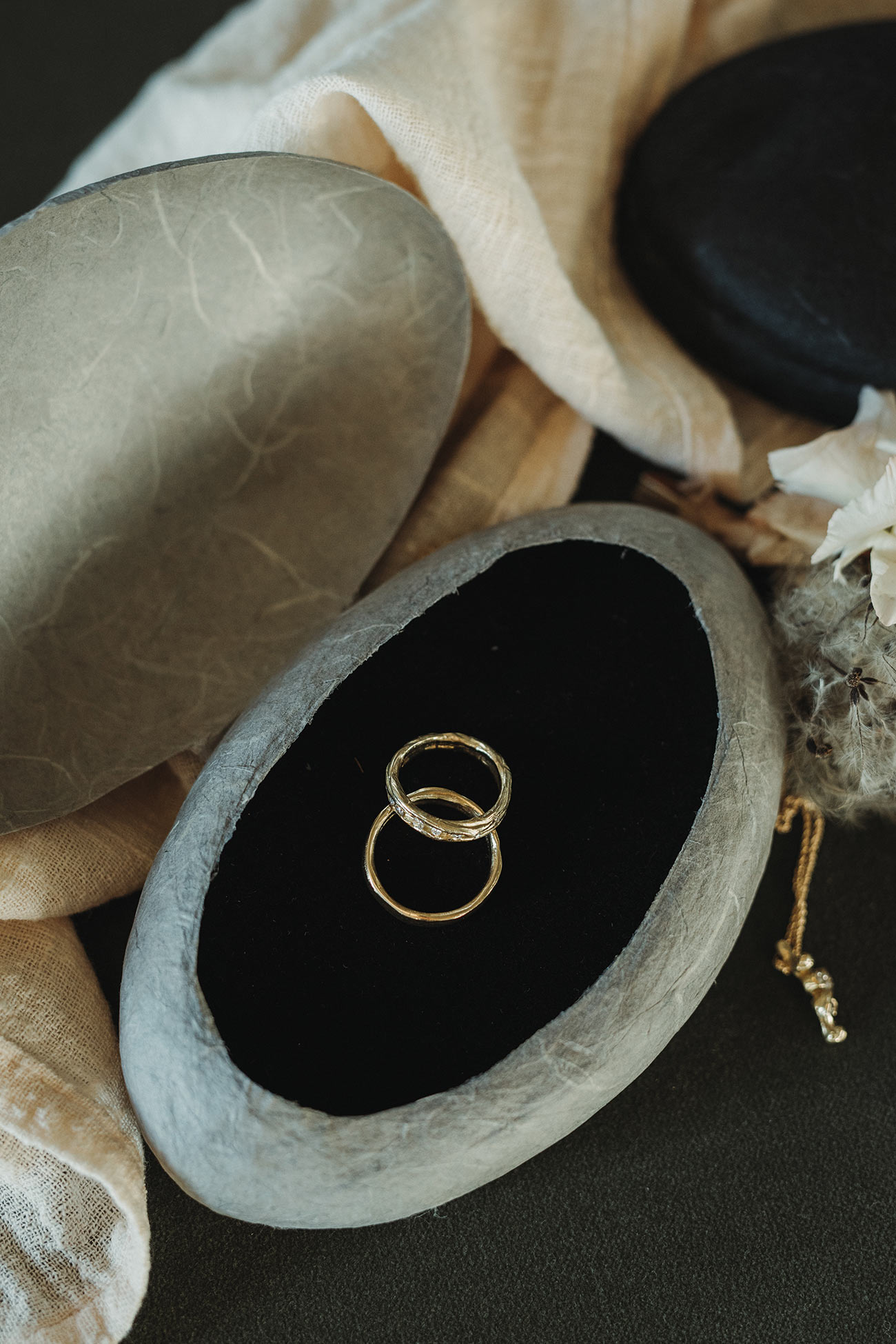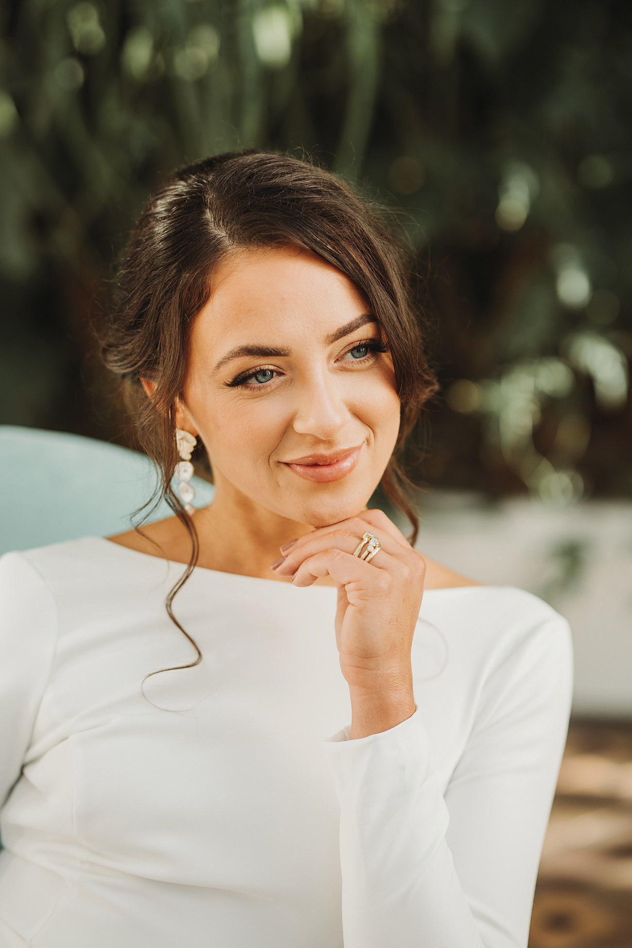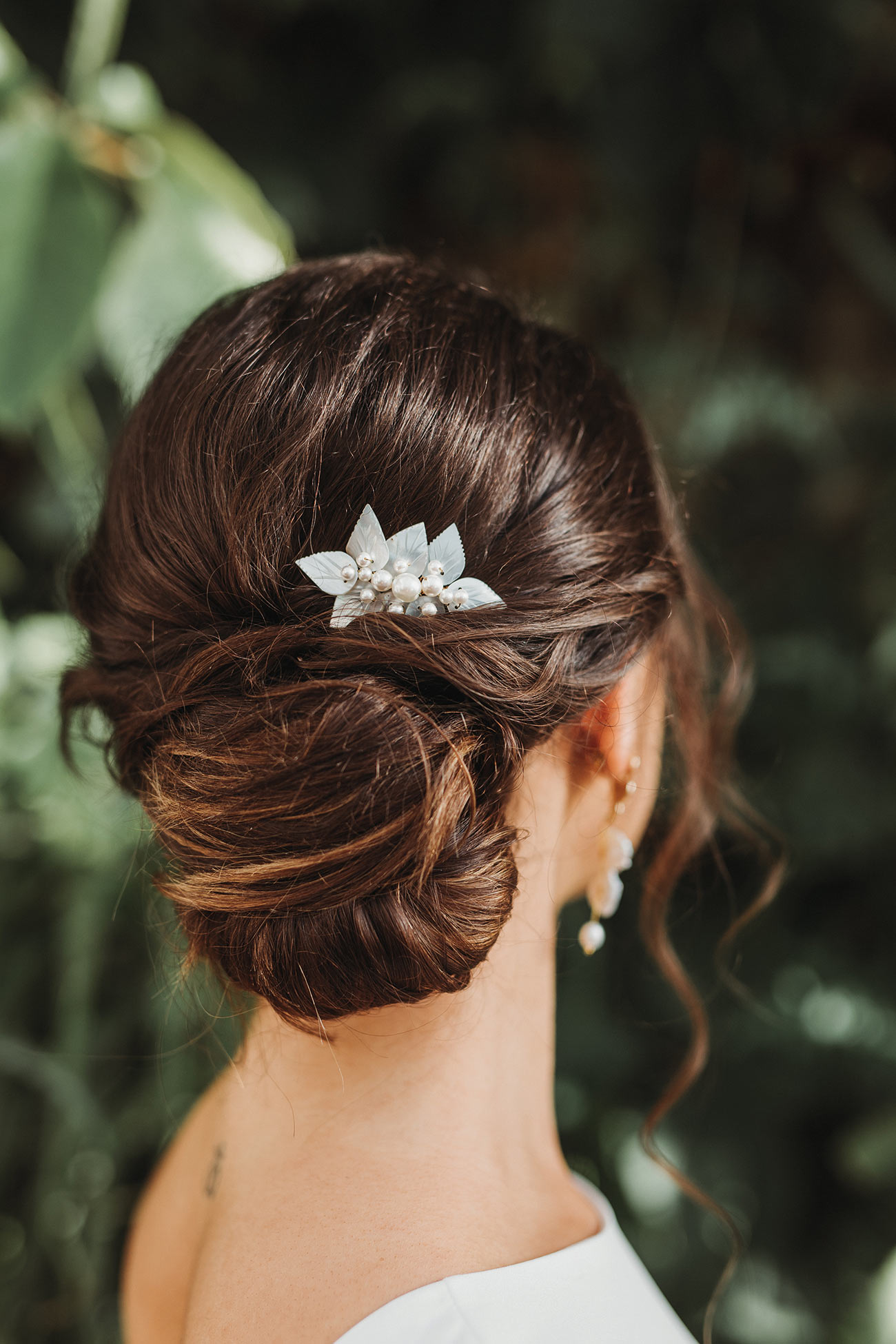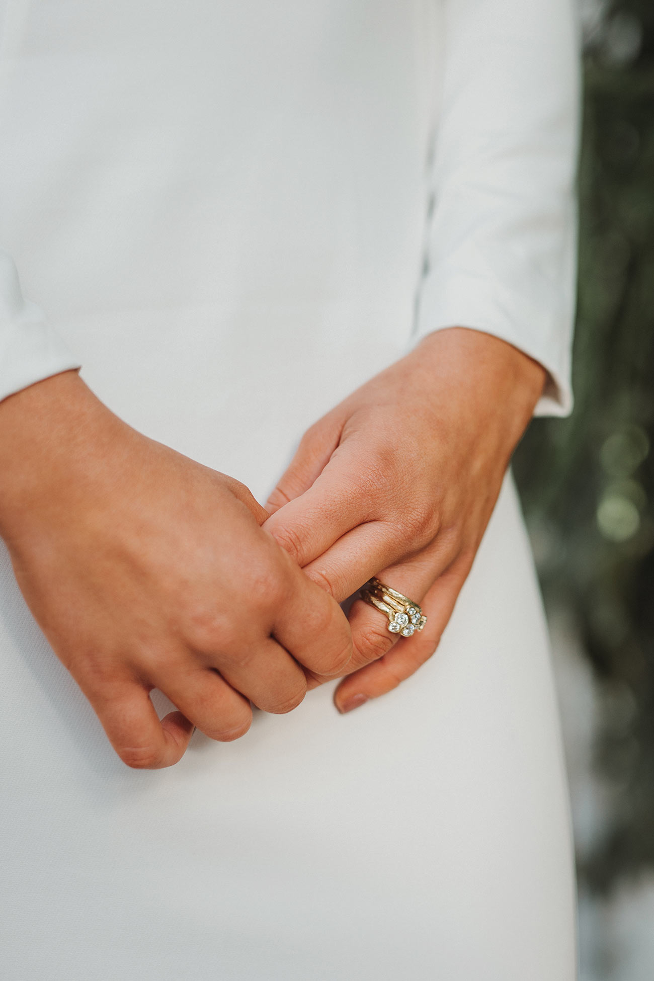 The bride and groom carry the aesthetic perfectly: the minimalist gown with its statement back bow is modern yet timeless, while the textured updo and glossy waves epitomise modern glamour. Pairing perfectly with his bride, the groom dons a sharp black-tie ensemble, the dried flowers of his buttonhole a subtle nod to current trends.