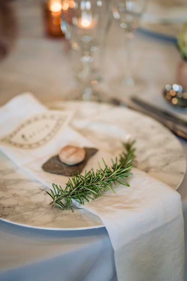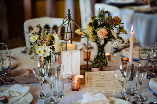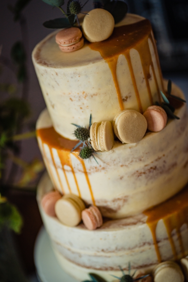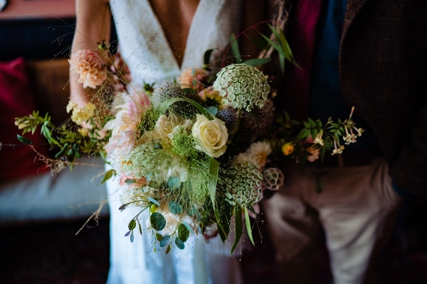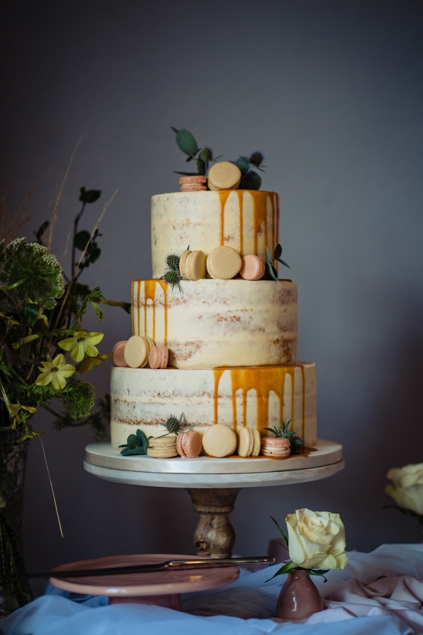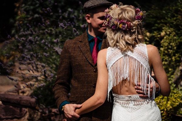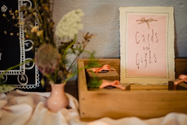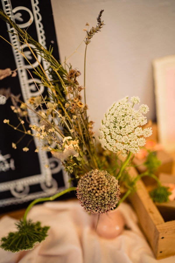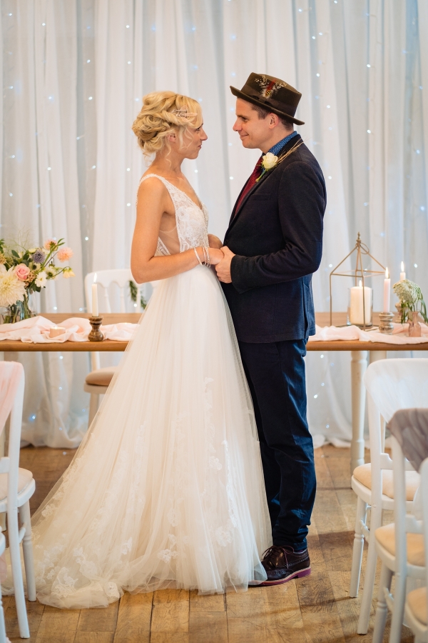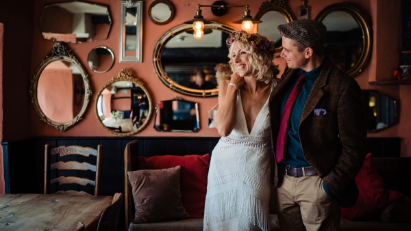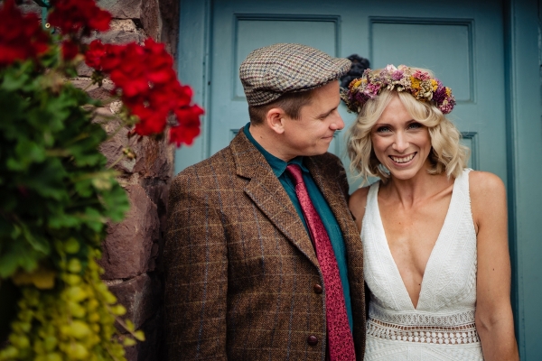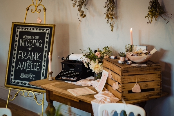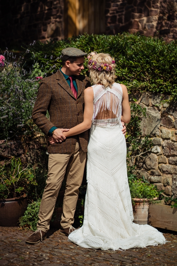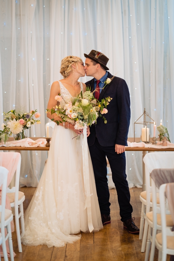 Lending itself to a beautifully individual wedding, this styled shoot blends rustic styling with bespoke details, from handwritten place settings to personalised soap favours. A palette of dusky pink, taupe and green bring a soft natural aesthetic to the celebration space, the semi-naked drip cake echoing the shades in deliciously trending style. The fresh-from-the-hedgerow flowers and pottery imprinted with botanicals serve as a nod to the surrounding landscape, while vintage elements, such as a typewriter and gramophone dressed with flowers, enhance the timeless, eclectic mood of the setting. The groom embodies the rustic theme in idiosyncratic style, while the bride dons a dried flower crown and a series of whimsical dresses ' a relaxed yet standout look, perfect for revelling in the romance of a country village wedding.