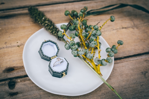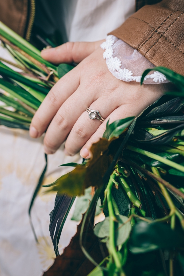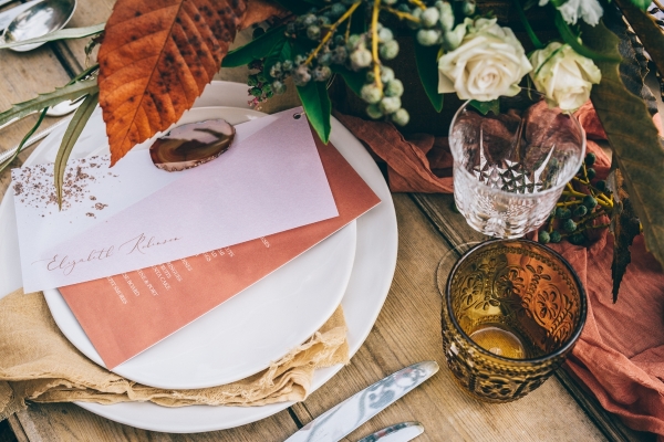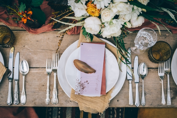 "Using natural materials such as linens, weathered wood and feathers was really important," says Nikki, who chose a range of wedding dresses dyed in natural patterns to work with the organic feel of the shoot. A feather-inspired cake, hammered silver jewellery, and dahlias and brown foliage all bring a rusted beauty to the scene, offset with an asymmetric floral arrangement on a triangular ceremony backdrop frame.